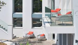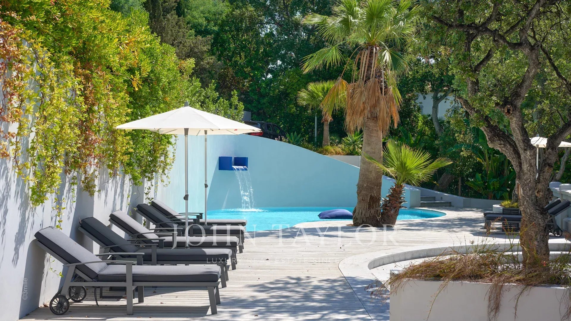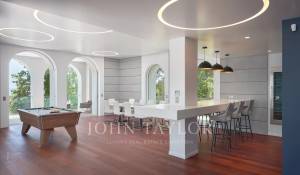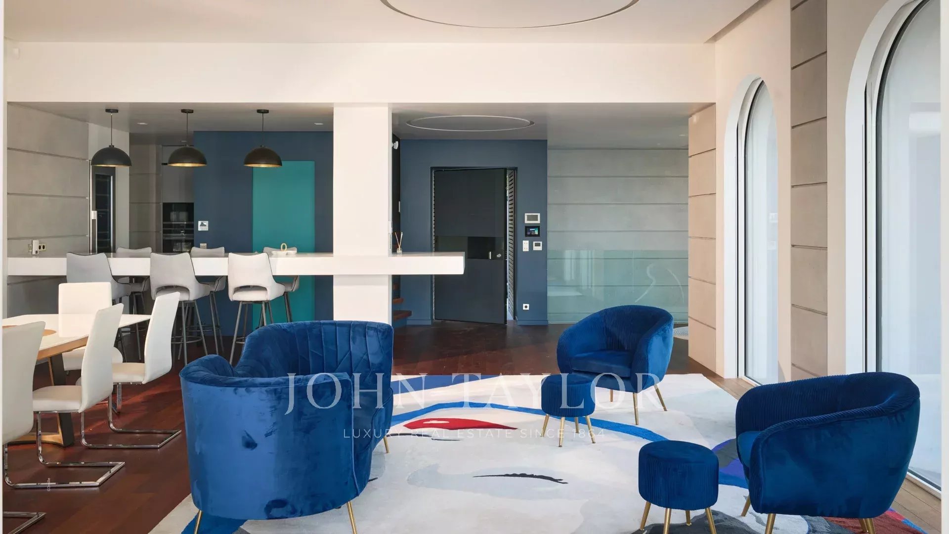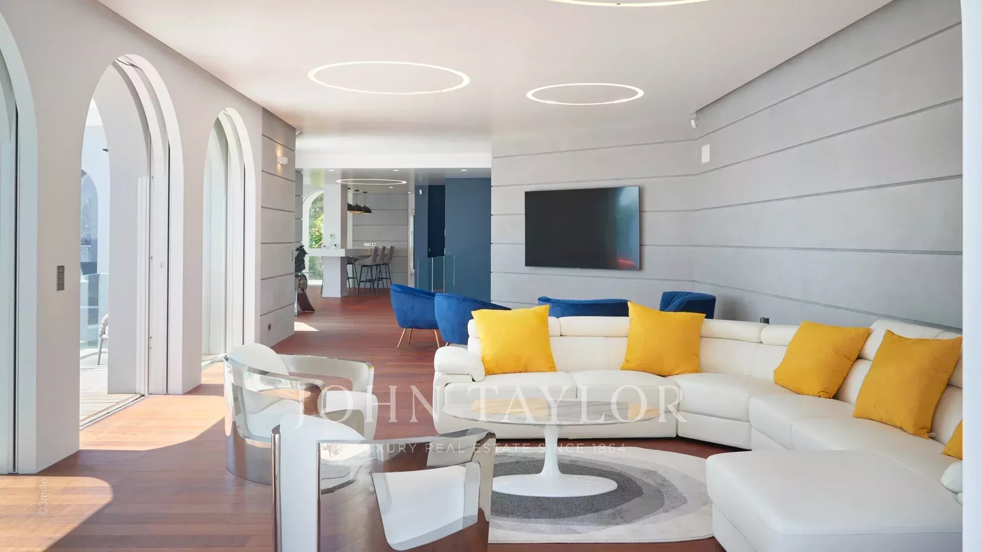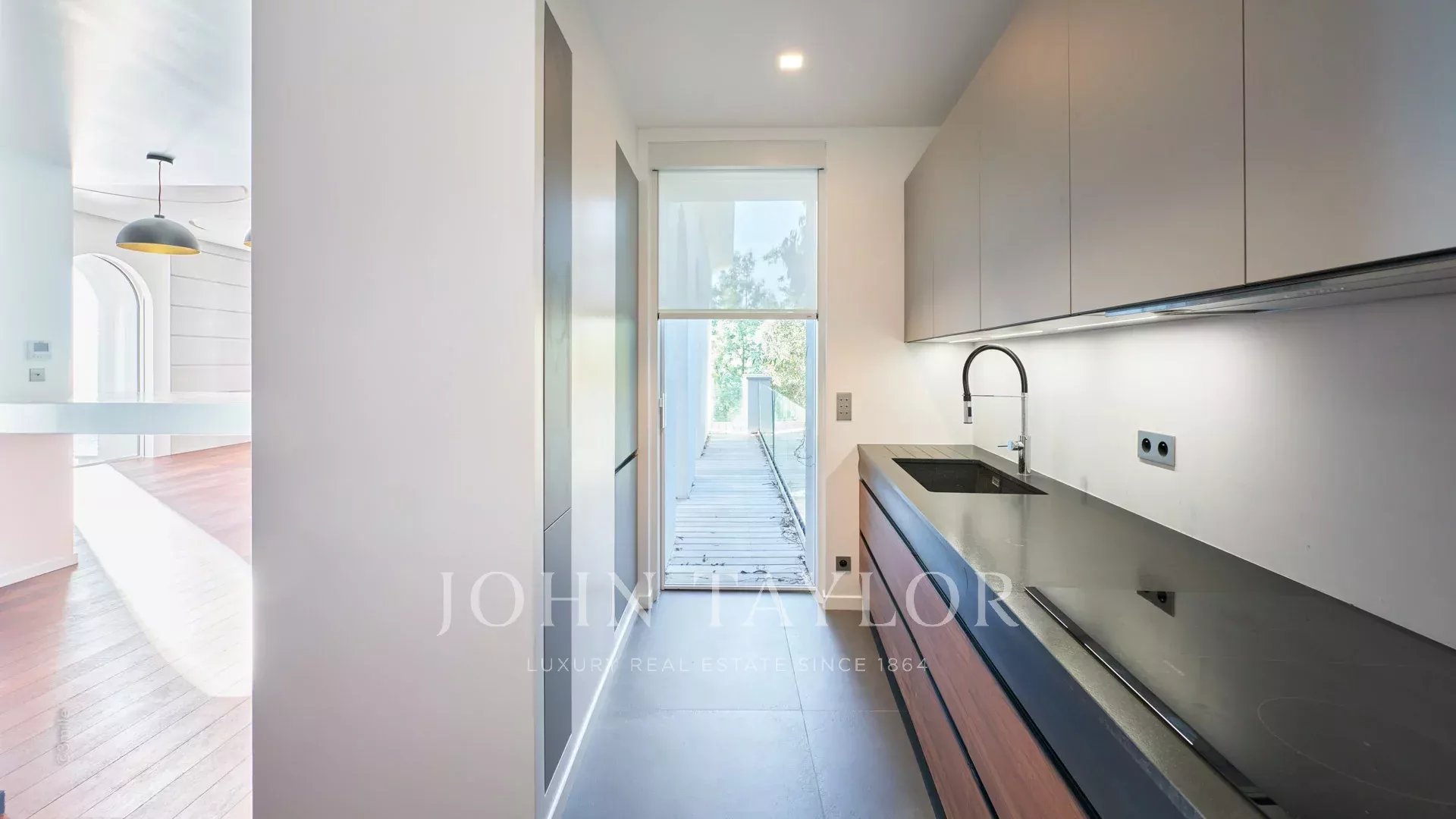 La propriété offre de nombreuses places de parking et des prestations de très haute qualité, avec des matériaux raffinés, un spa, un sauna, un toit-terrasse aménagé et une piscine de 84 m², entourée de vastes plages au même niveau que les pièces à vivre.