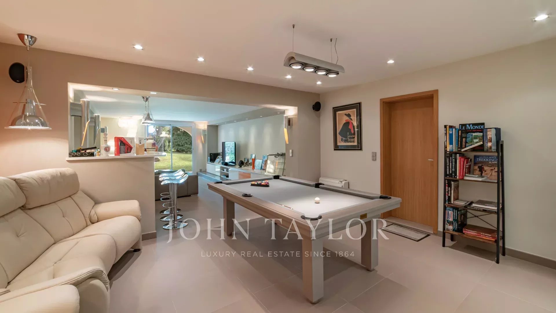 Au rez-de-jardin, un vaste espace dédié aux loisirs comprend une salle de sport, un espace détente avec jacuzzi et sauna, une salle de cinéma, ainsi qu'un salon ouvrant sur le jardin, équipé d'un billard, d'un bar et d'une cave à vins.