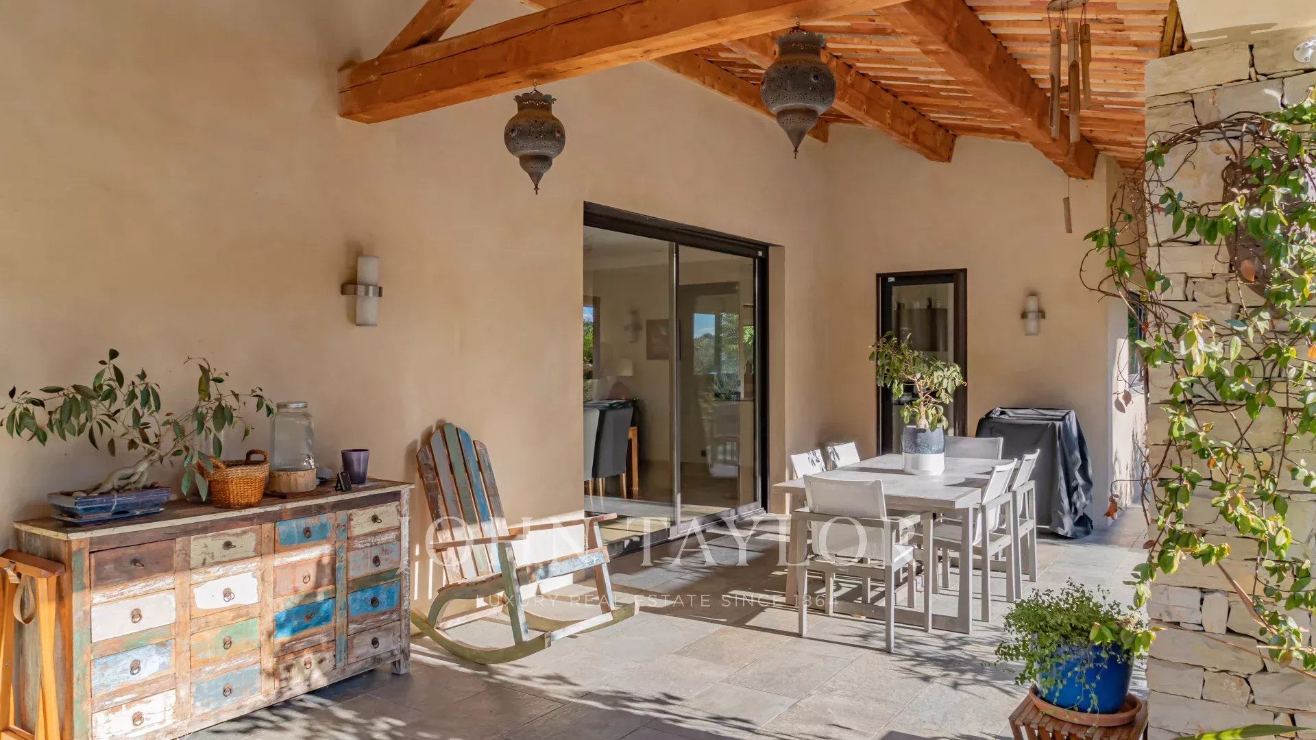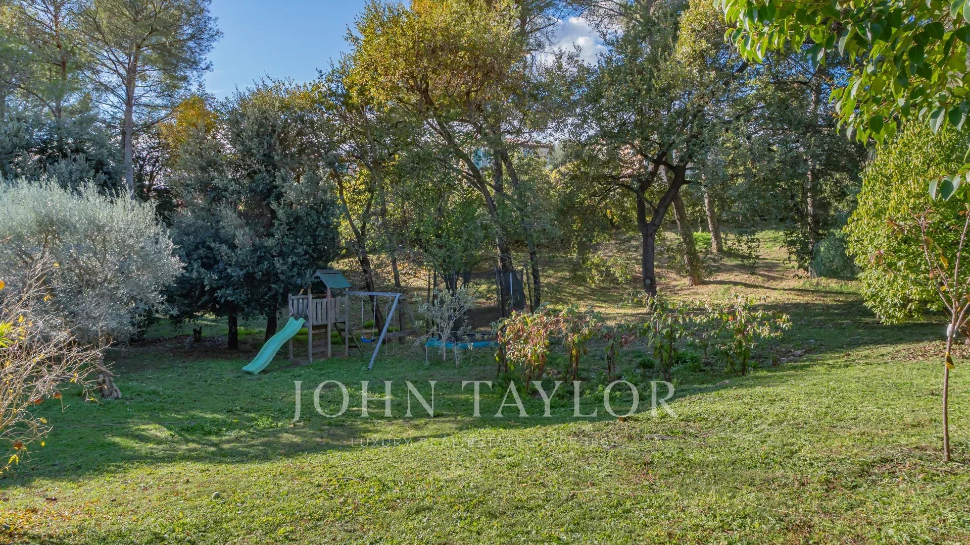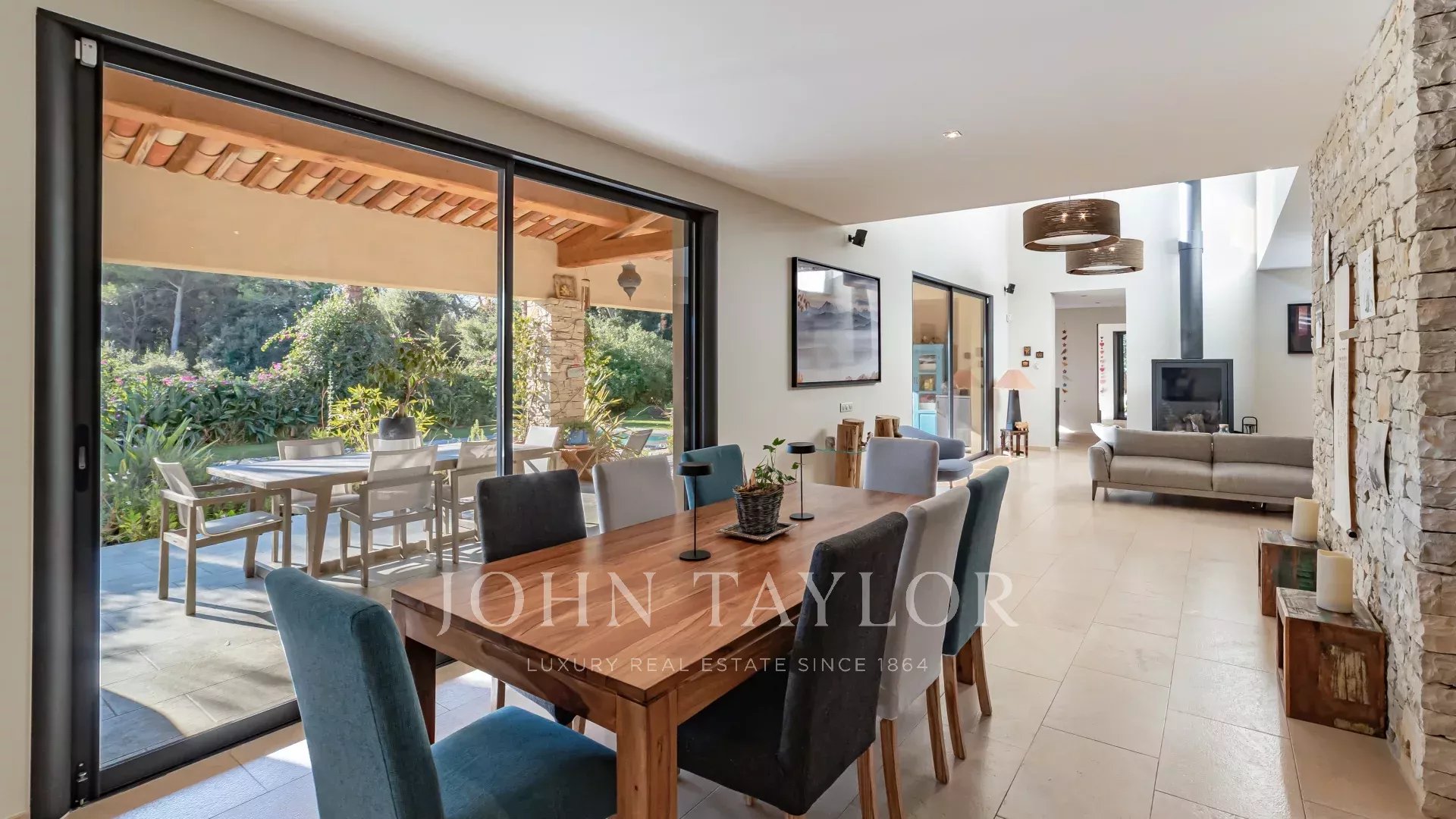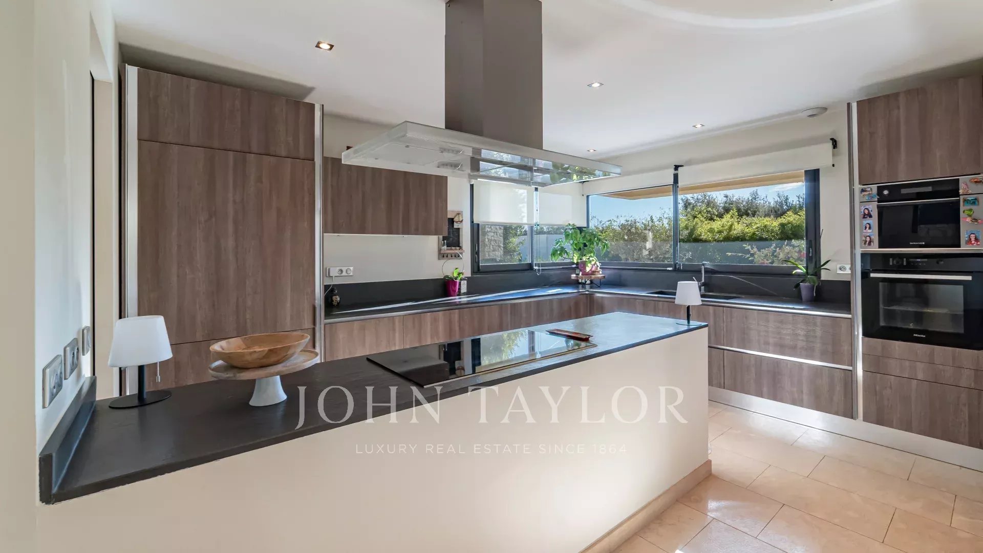 Située au sein d’un domaine résidentiel sécurisé, en position dominante sur un double terrain, cette villa récente offre de beaux volumes et des prestations contemporaines de qualité sur environ 180 m².
