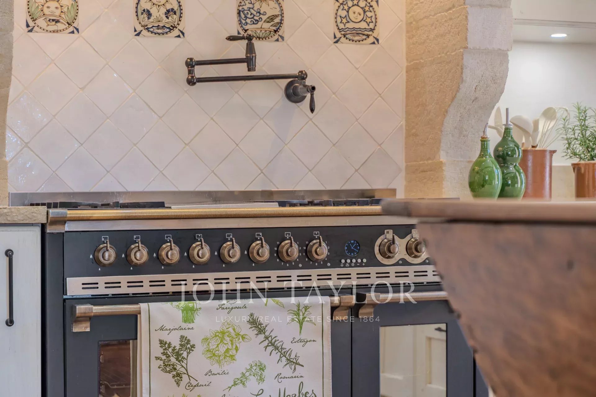 Au rez-de-jardin, la cuisine provençale, avec un accès indépendant datant de 1784, est attenante à une salle à manger lumineuse, ouverte sur une vaste terrasse.