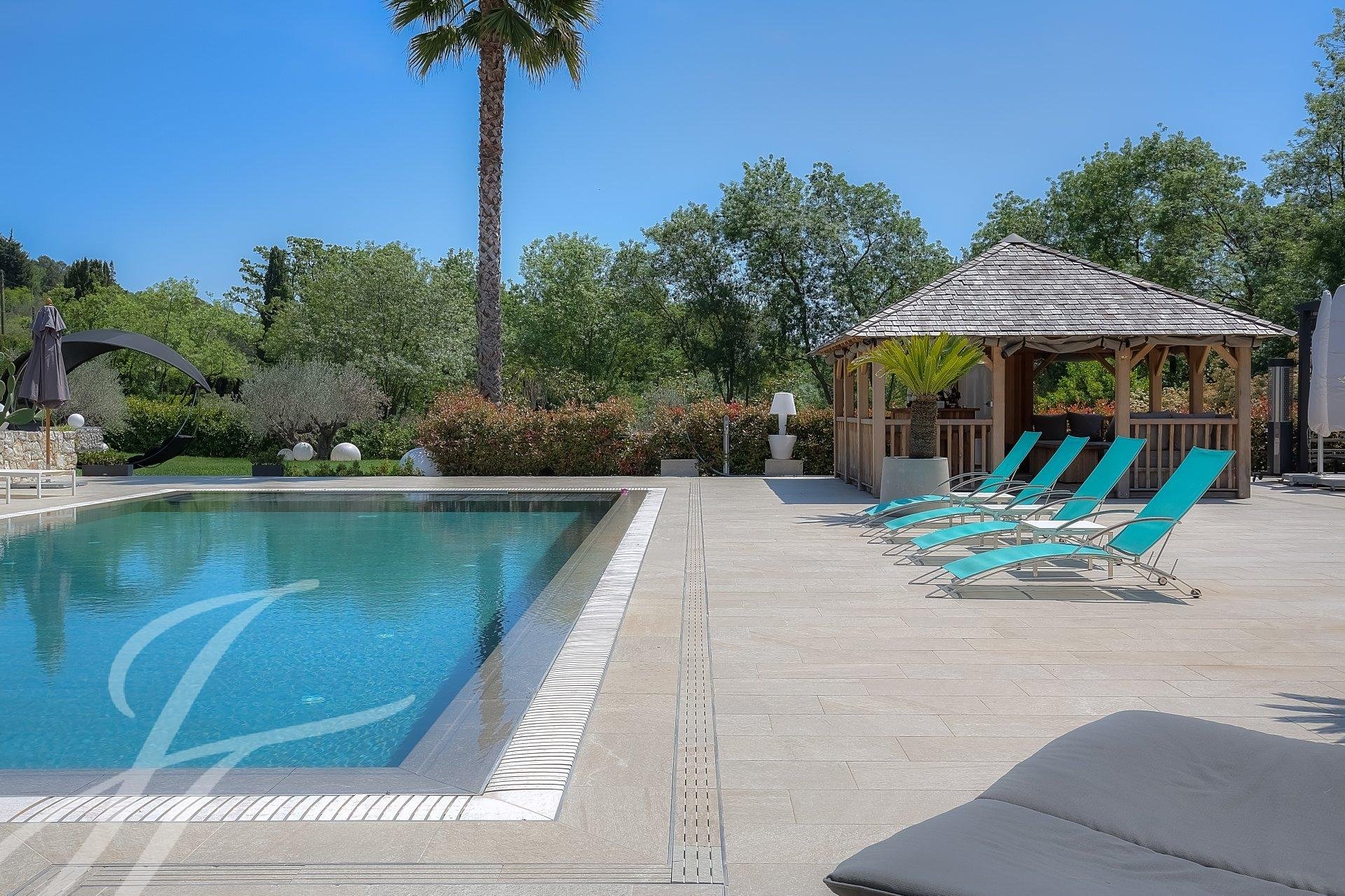 Une grande piscine miroir rectangulaire chauffée de 6 x 14 m et une terrasse impressionnante de 600 m² avec pergola et gazebo occupent une place centrale, offrant un vaste espace pour les réceptions, tout comme les terrasses, idéales pour les repas en plein air.