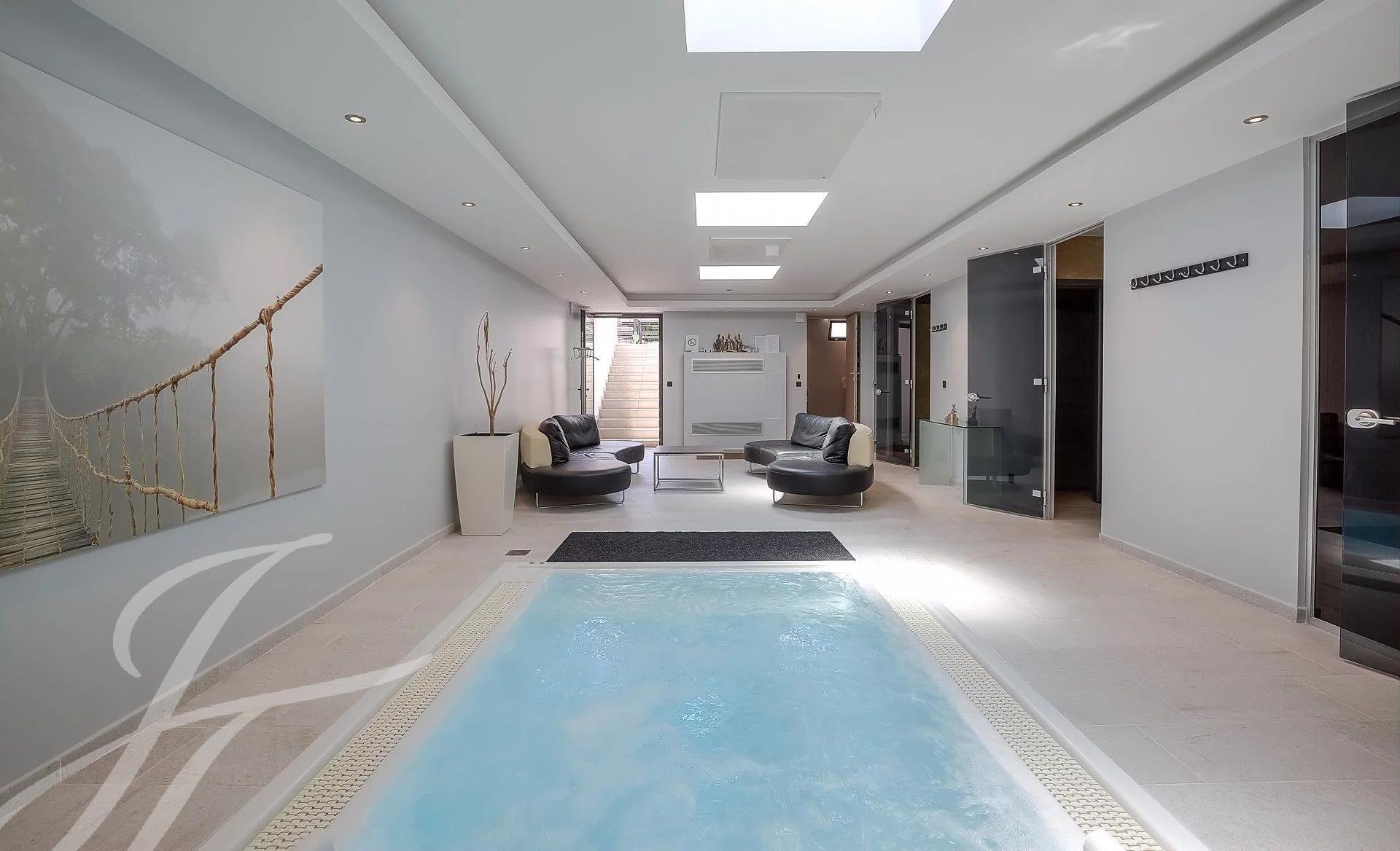 La villa dispose d'un home cinema et d'un espace bien-être exceptionnel avec un jacuzzi professionnel, un hammam, un sauna et une belle salle de sport.