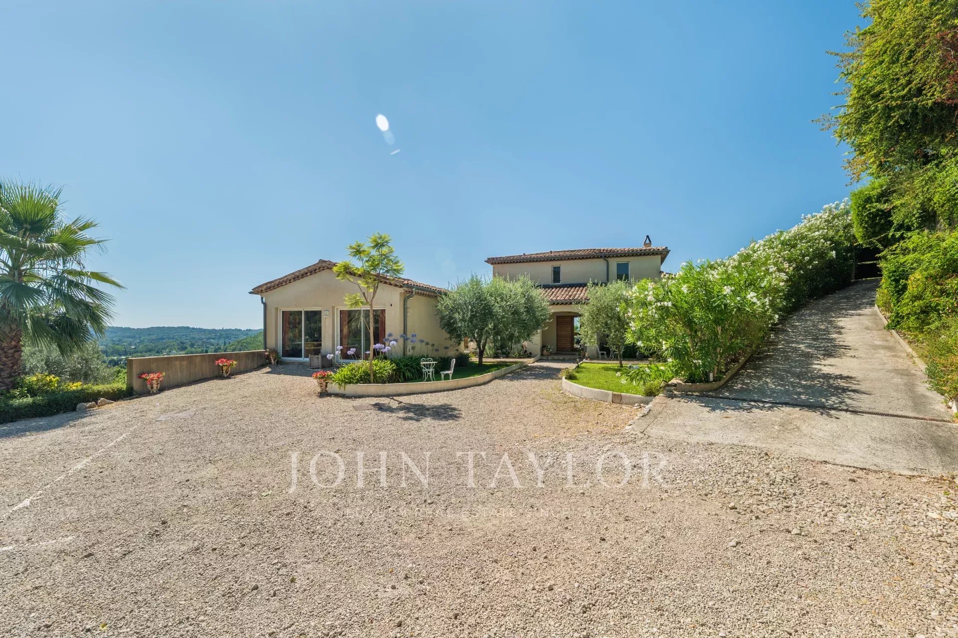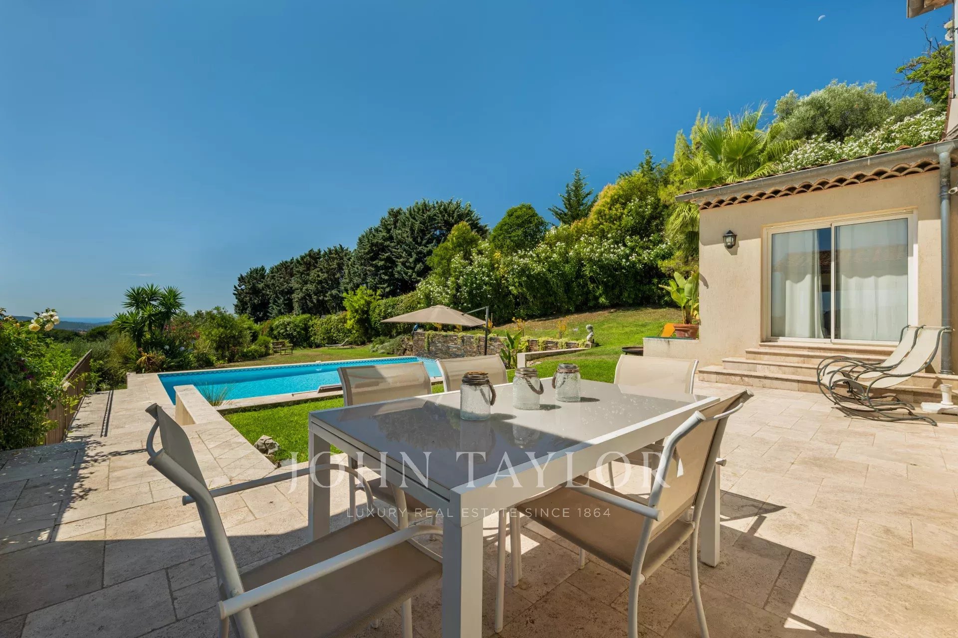 Perchée dans une position dominante mais tranquillement cachée, cette villa lumineuse et élégante de 305 m² offre des vues panoramiques exceptionnelles, y compris des aperçus de la mer, sur un terrain en pente douce de 5 839 m². La propriété comprend une maison principale et un studio indépendant entièrement équipé.