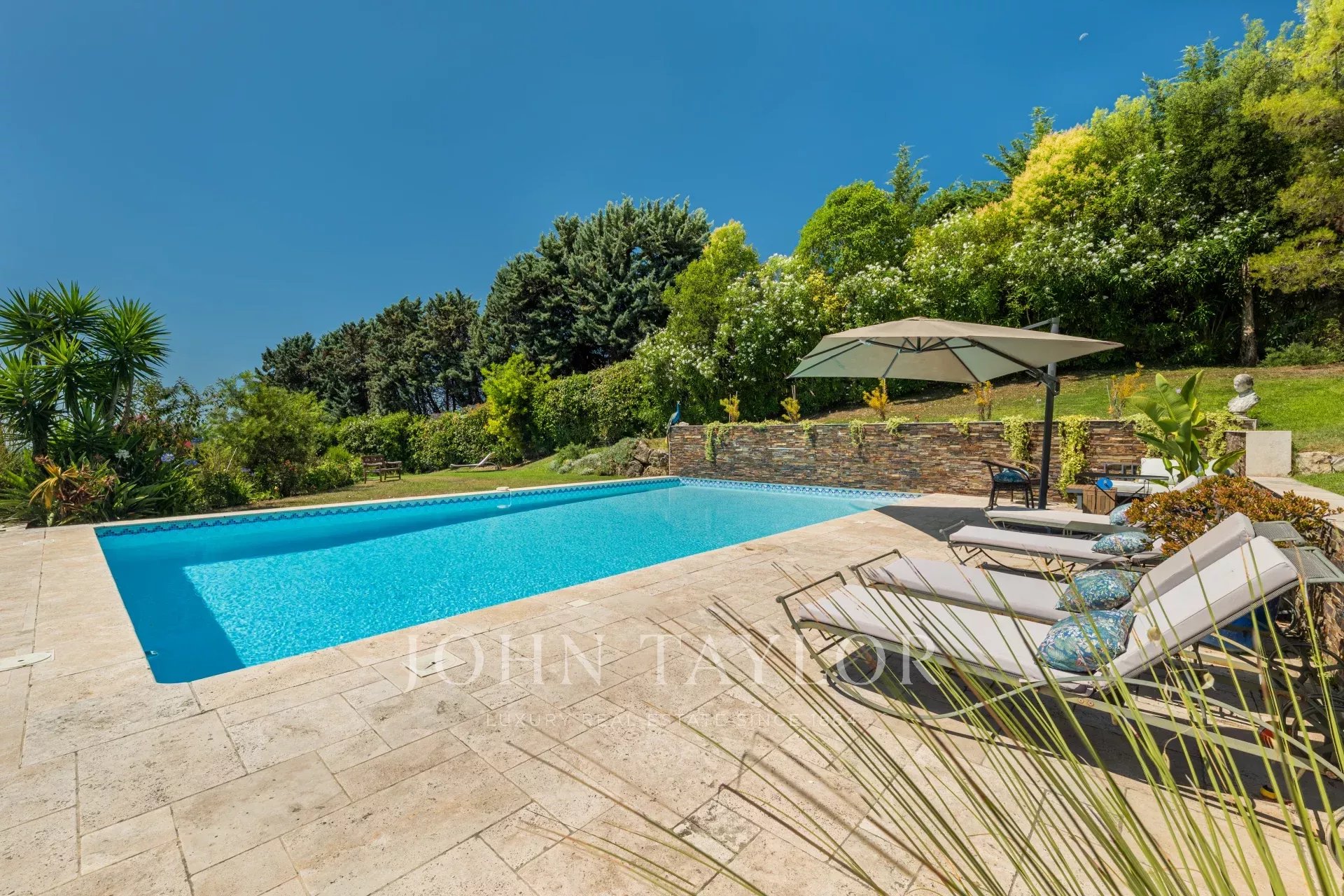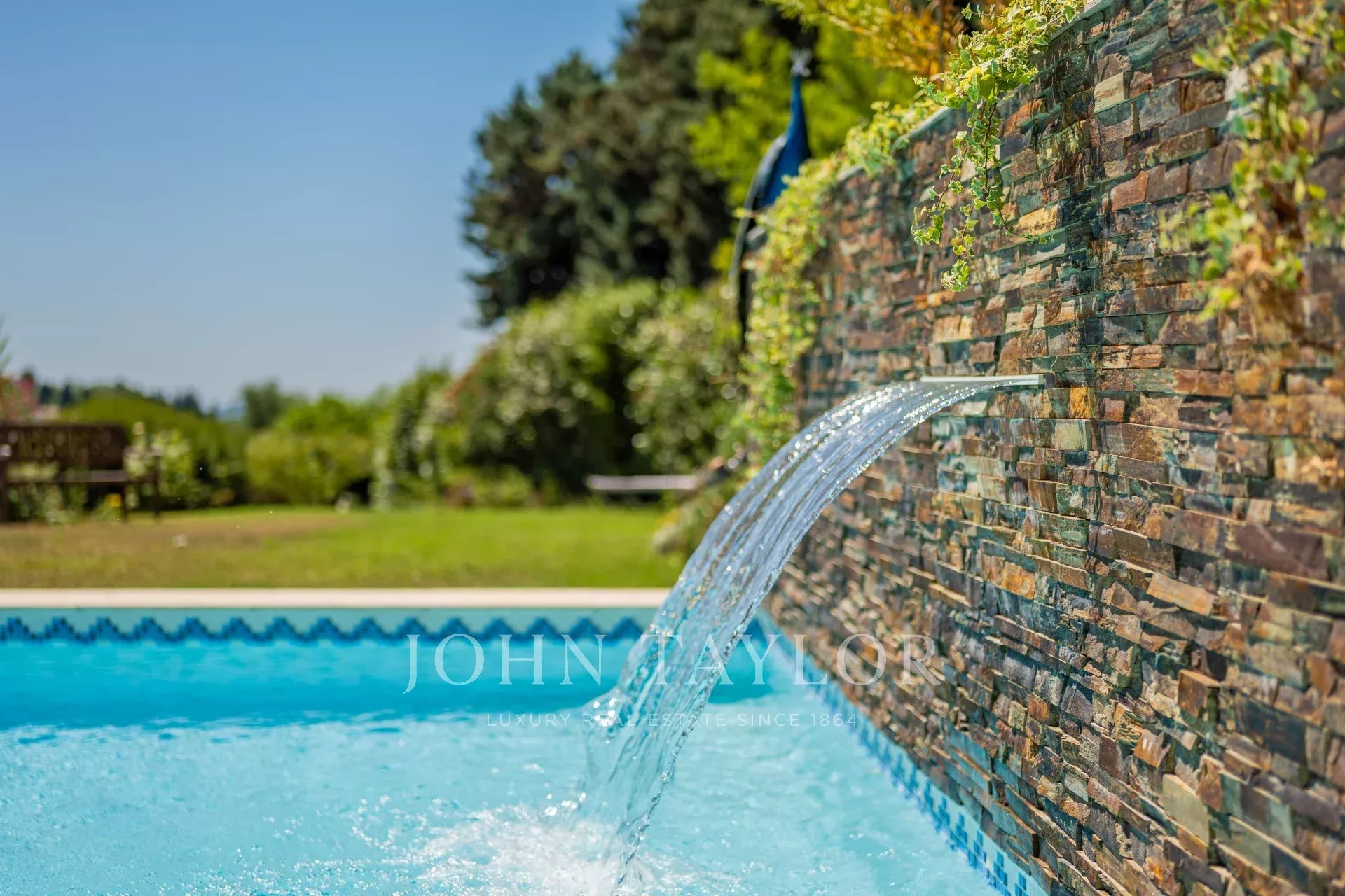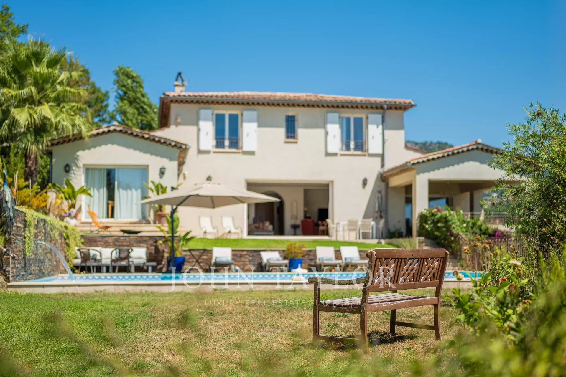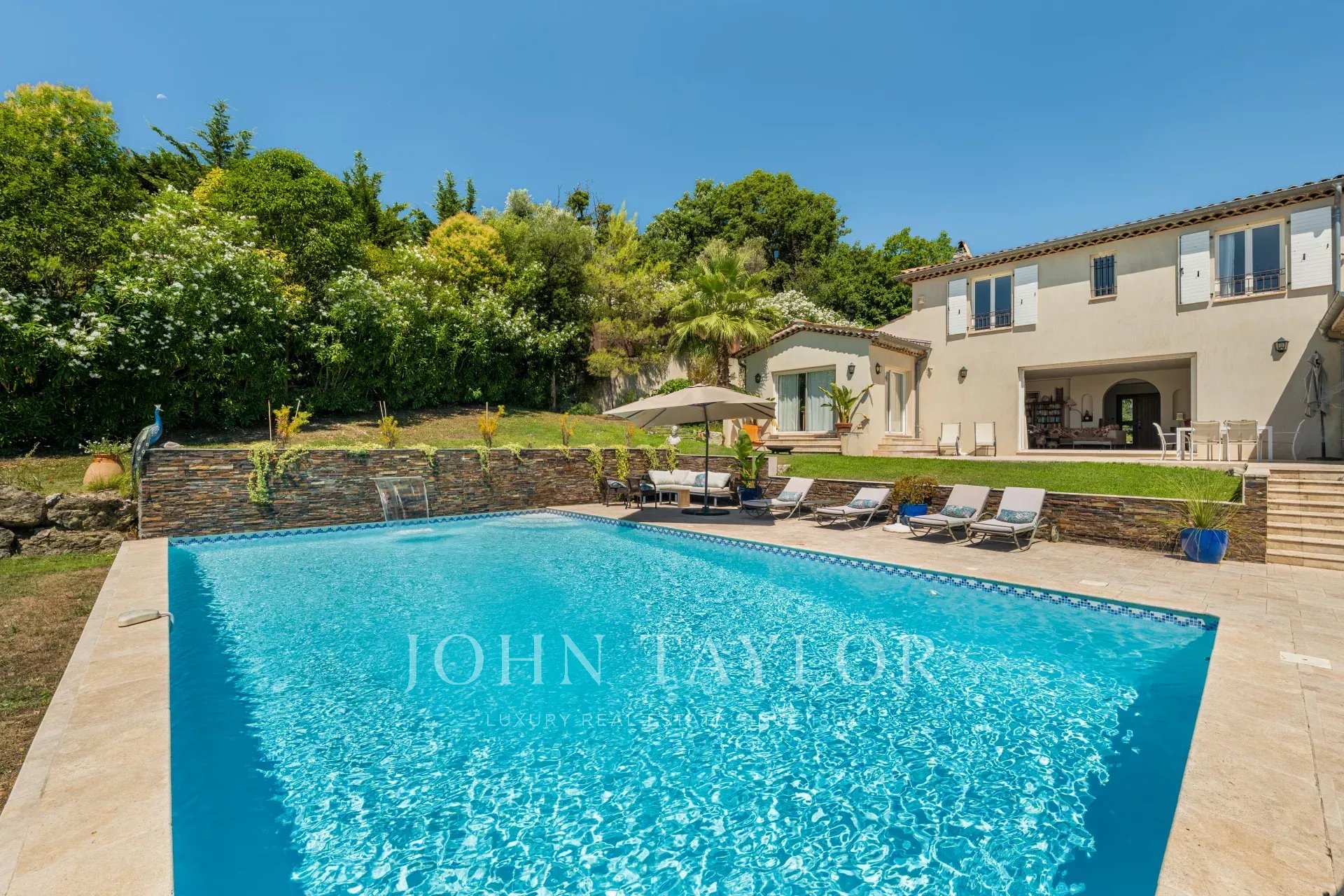 À l'extérieur, la propriété dispose d'une grande piscine avec fontaine, de jardins magnifiquement entretenus et d'une aire de jeux pour les enfants, le tout baigné de soleil grâce à une orientation plein sud. La villa est remarquablement paisible et constitue un véritable sanctuaire.
