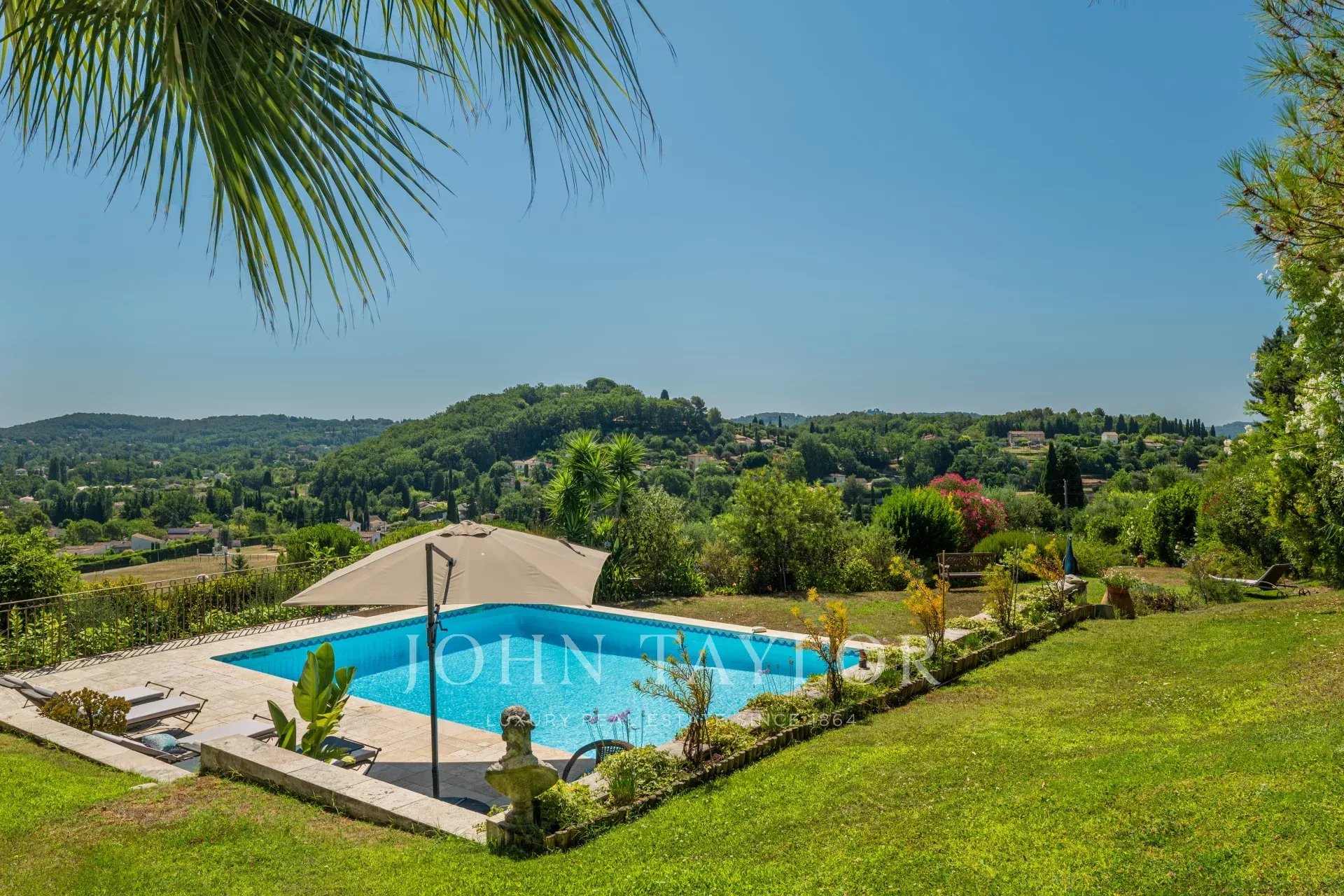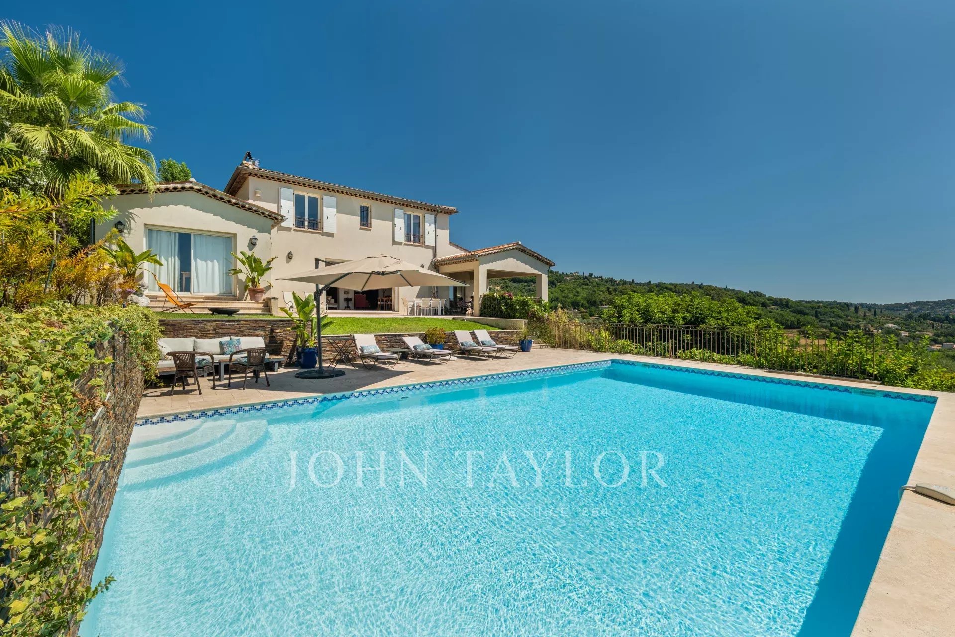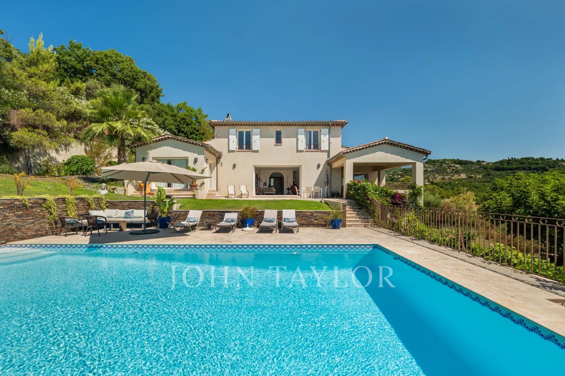 À l'extérieur, la propriété dispose d'une grande piscine avec fontaine, de jardins magnifiquement entretenus et d'une aire de jeux pour les enfants, le tout baigné de soleil grâce à une orientation plein sud. La villa est remarquablement paisible et constitue un véritable sanctuaire.