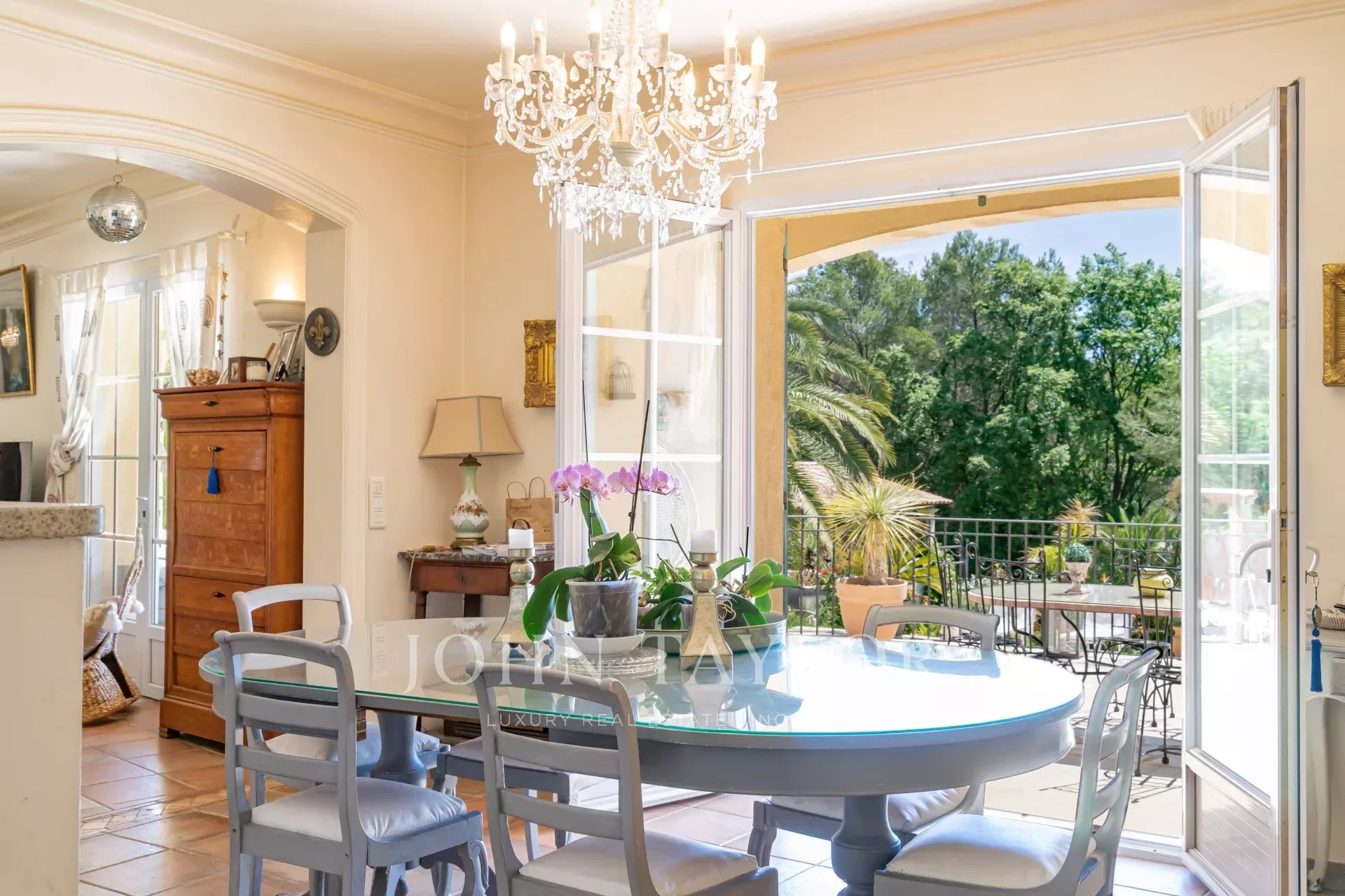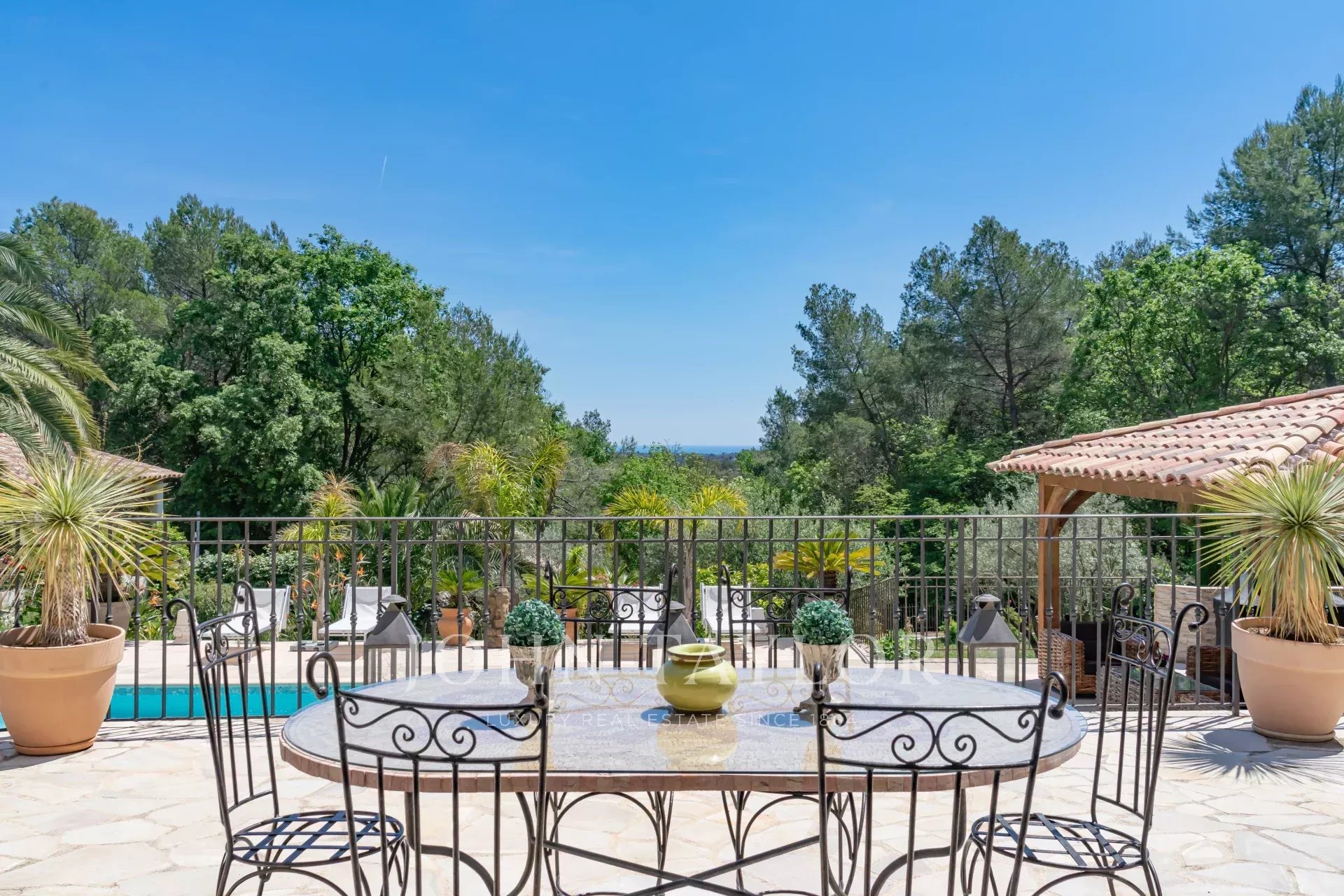 Nichée au bout d'un chemin privé, à l'abri des regards et dans un calme absolu, cette élégante maison provençale d'environ 260 m², située sur un terrain de 2 500 m² avec piscine, vous accueille dans un cadre rare et privilégié, en lisière de forêt, tout en offrant une vue partielle sur la mer selon les perspectives.