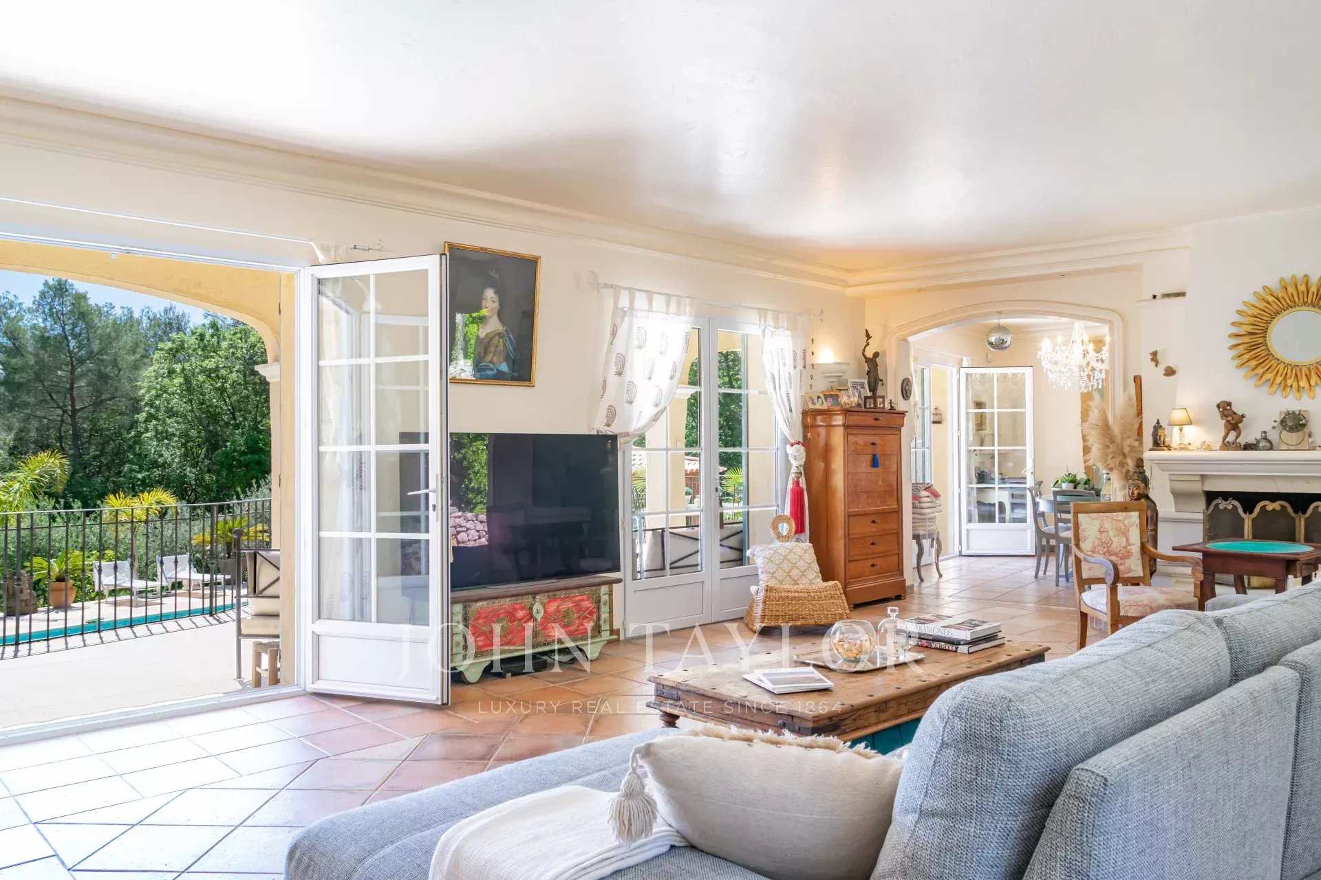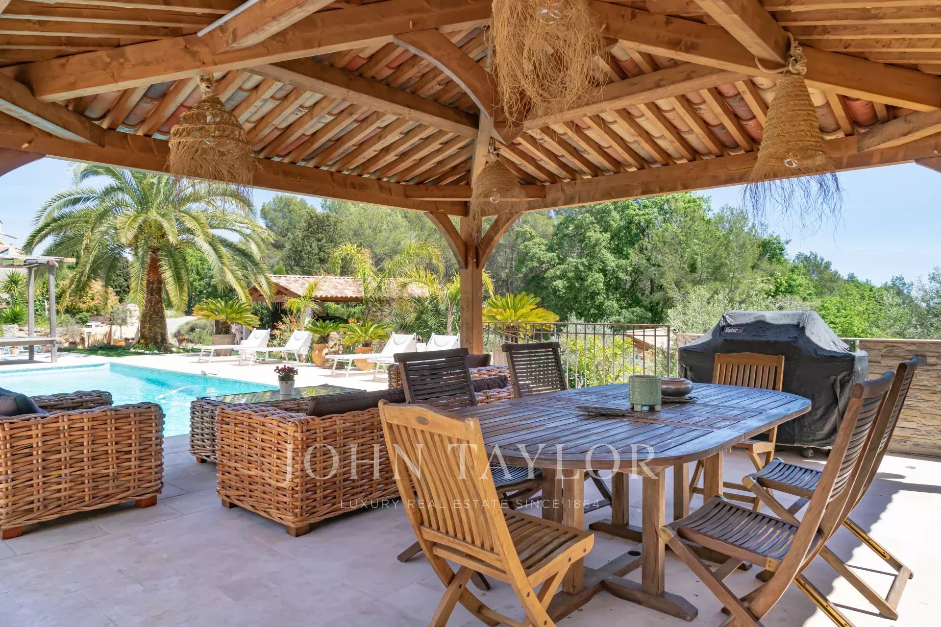 À l'extérieur, le charme opère immédiatement : jardin méditerranéen soigné, piscine entourée de larges terrasses, pool-house, terrain de pétanque, deux carports – le tout dans un décor verdoyant propice au repos et à la convivialité.