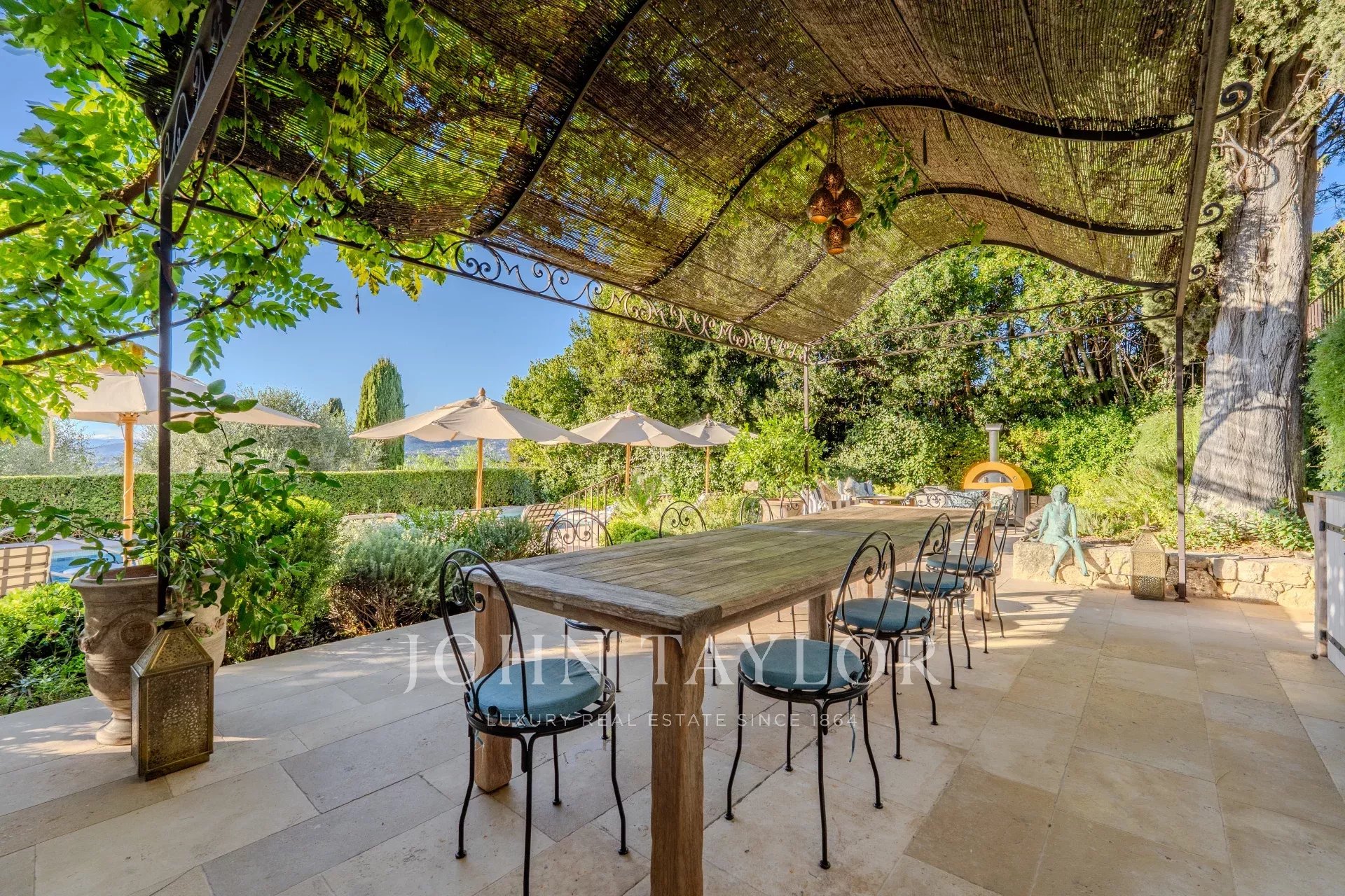 Le jardin en restanques paysagées sur 4 530 m², orné de magnifiques oliviers centenaires et d’une fontaine de pierre, s’organise autour d’une grande piscine, parfaitement intégrée à son environnement naturel.