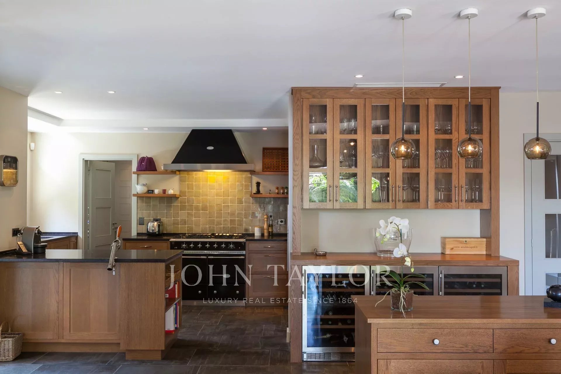 Derrière la cuisine, une buanderie moderne avec de nombreux espaces de rangement se mène au garage, ce qui souligne encore le grand confort de la propriété.