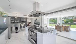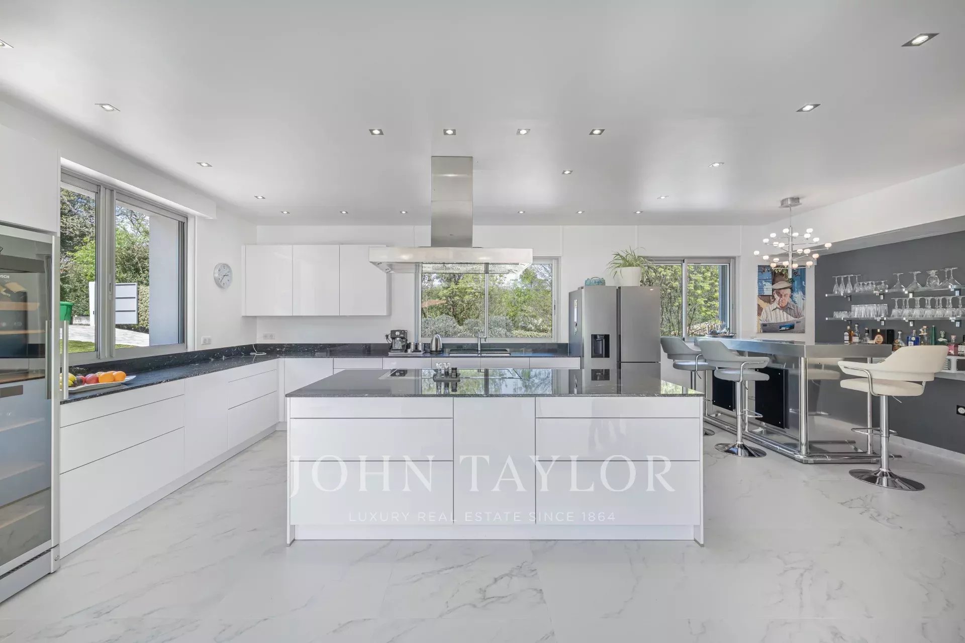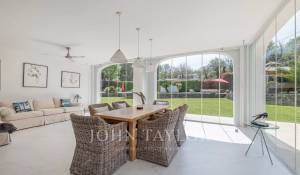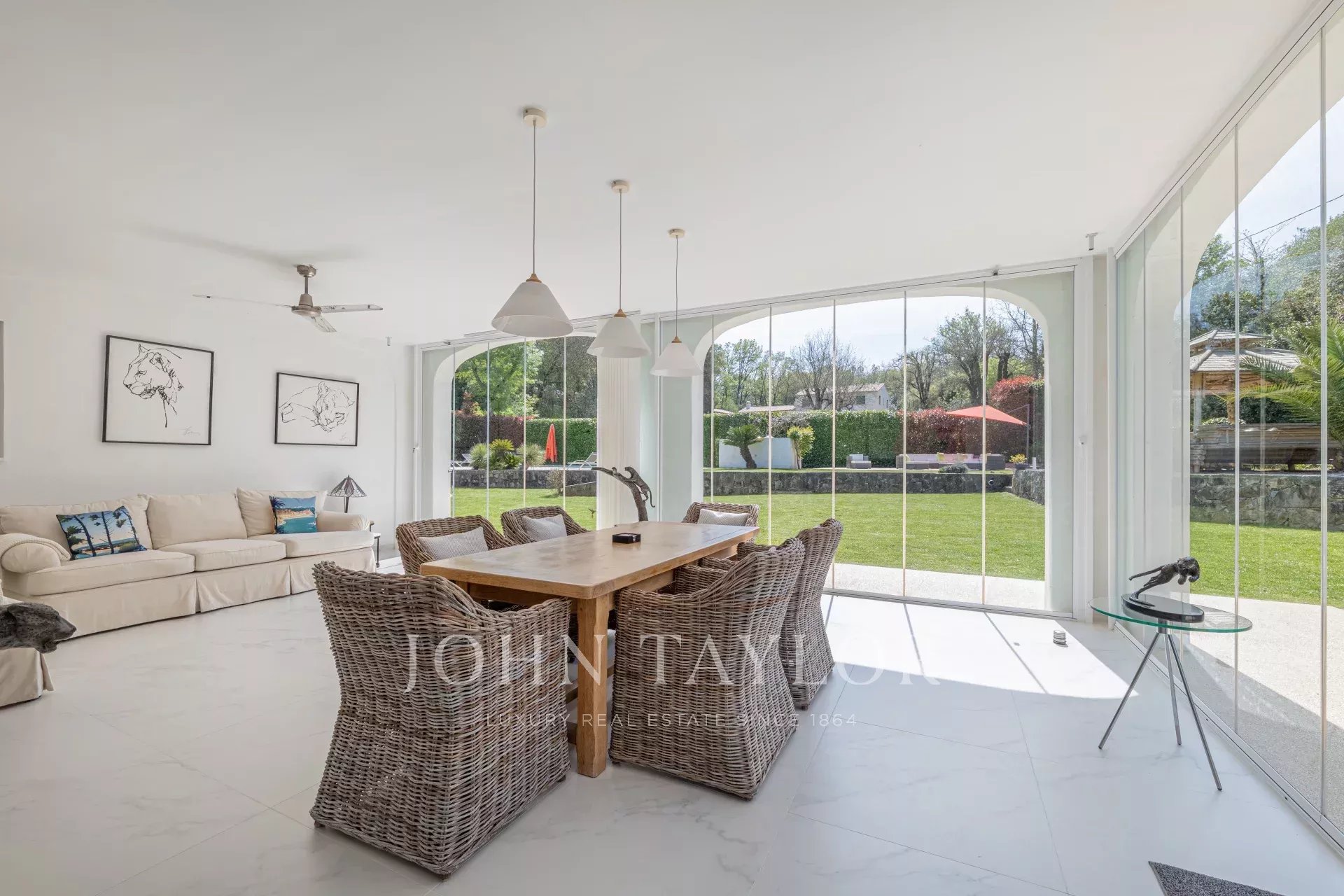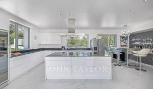 Une lumineuse véranda vitrée vous accueille, offrant une transition harmonieuse entre l’intérieur et l’extérieur. Cet espace s’ouvre sur une cuisine moderne, entièrement équipée, qui communique avec une salle à manger et un vaste salon profitant de vues sur la piscine et le jardin.