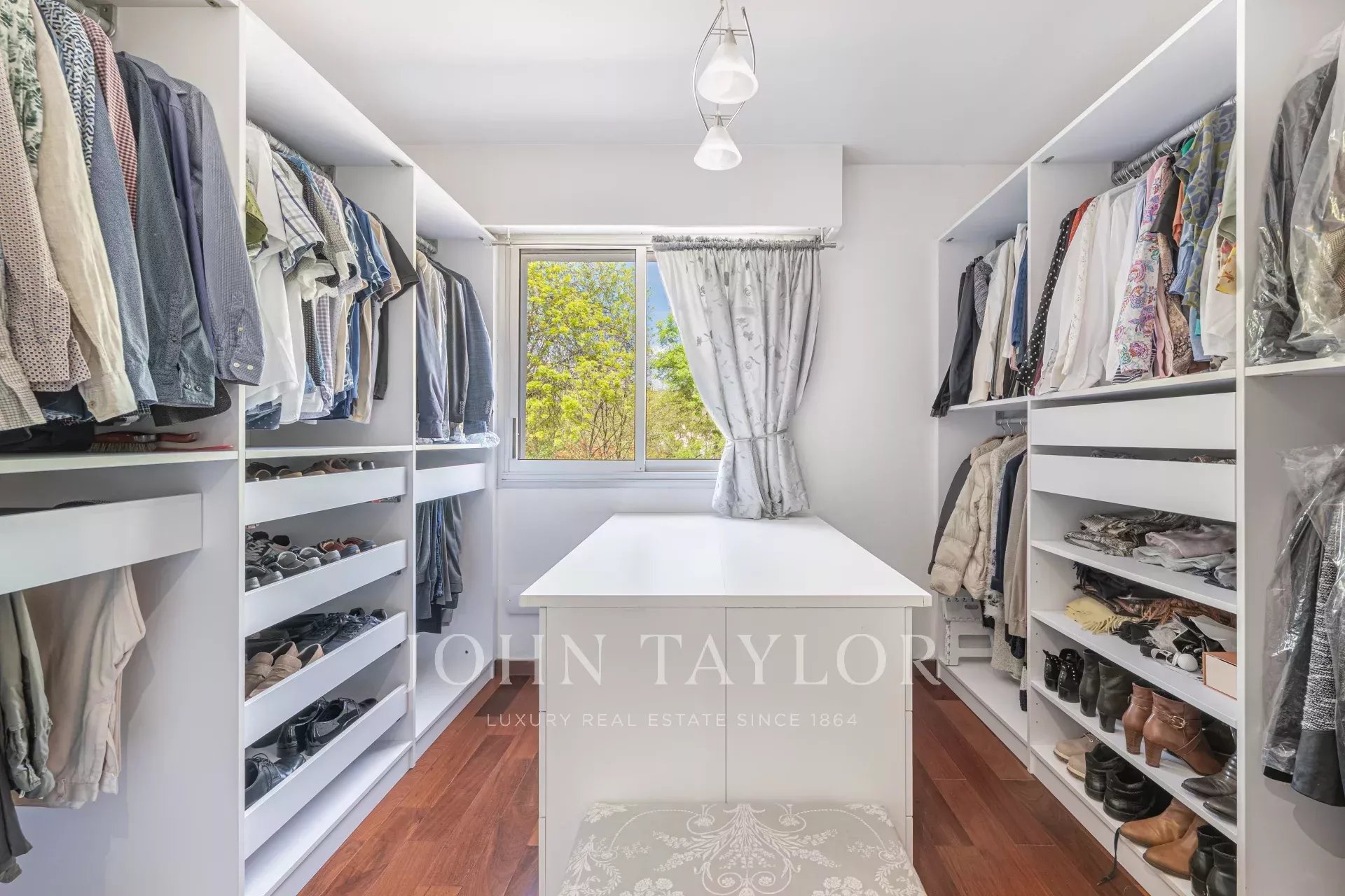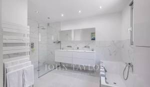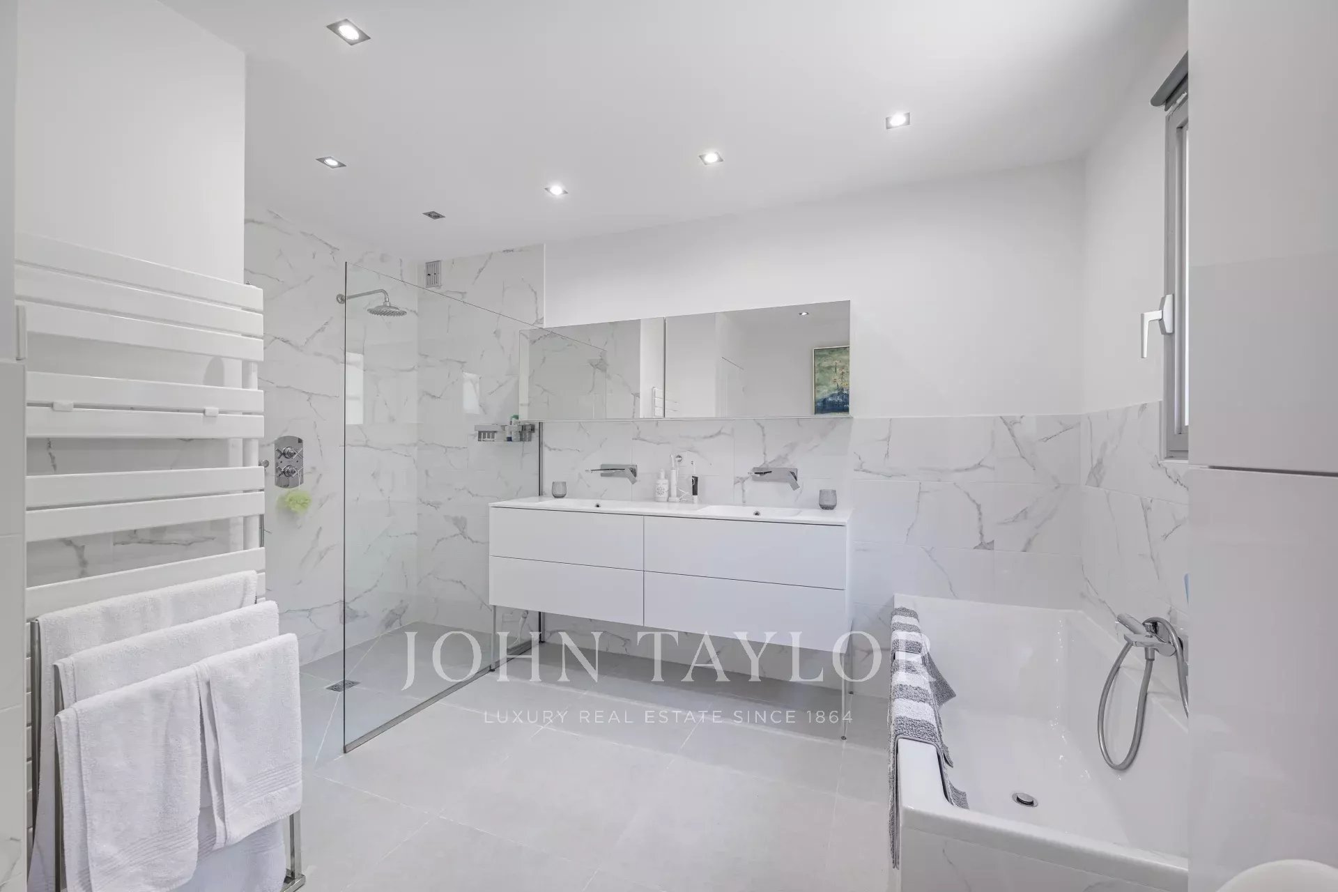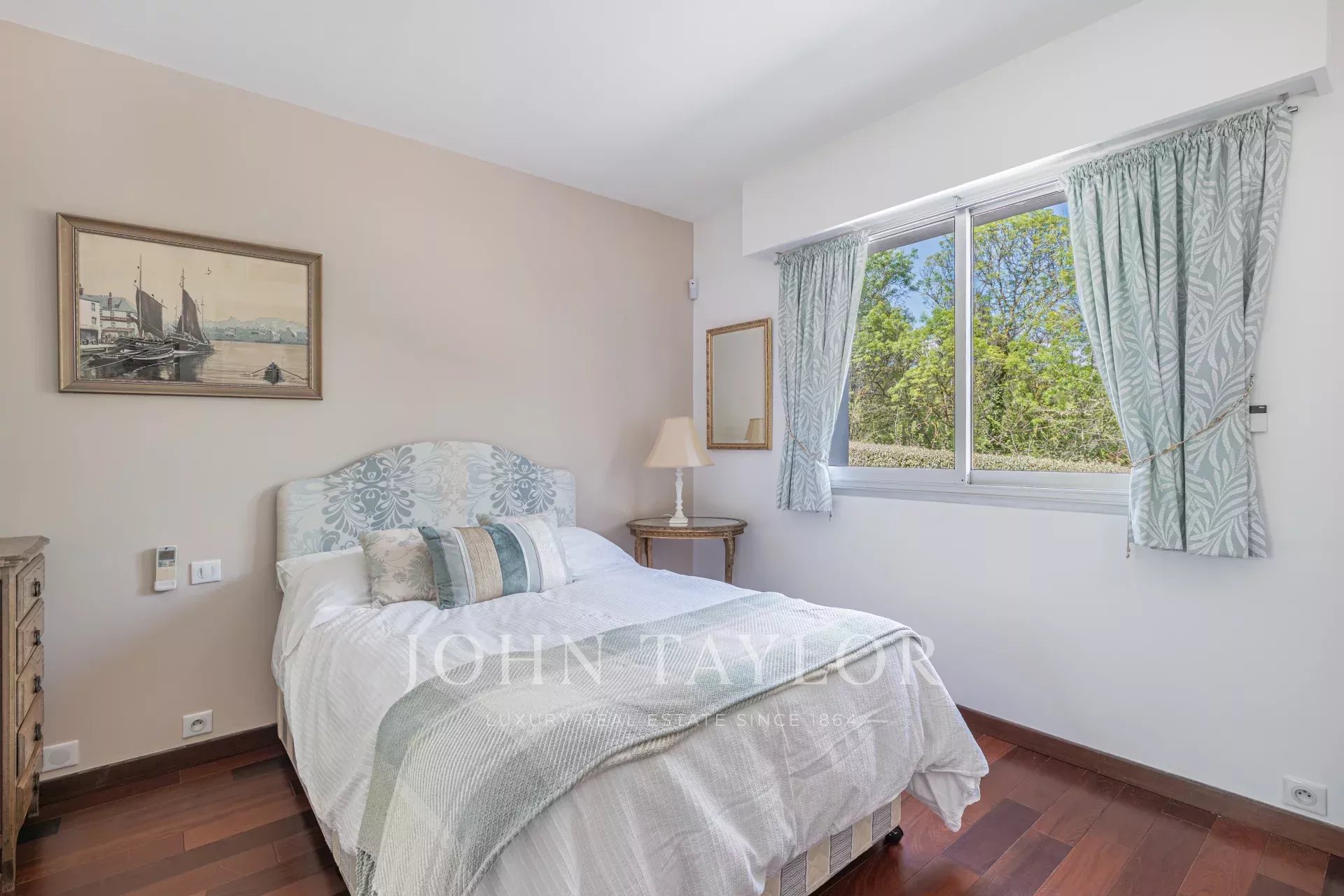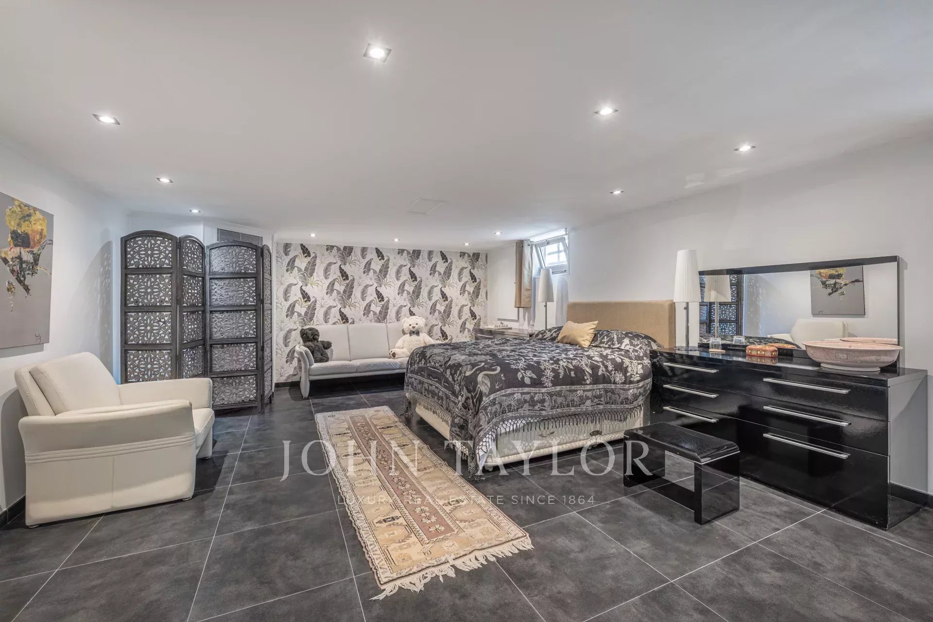 Le rez-de-chaussée comprend une suite parentale avec salle de bains, dressing et accès direct au jardin et à la piscine, ainsi qu’une seconde chambre en suite.
