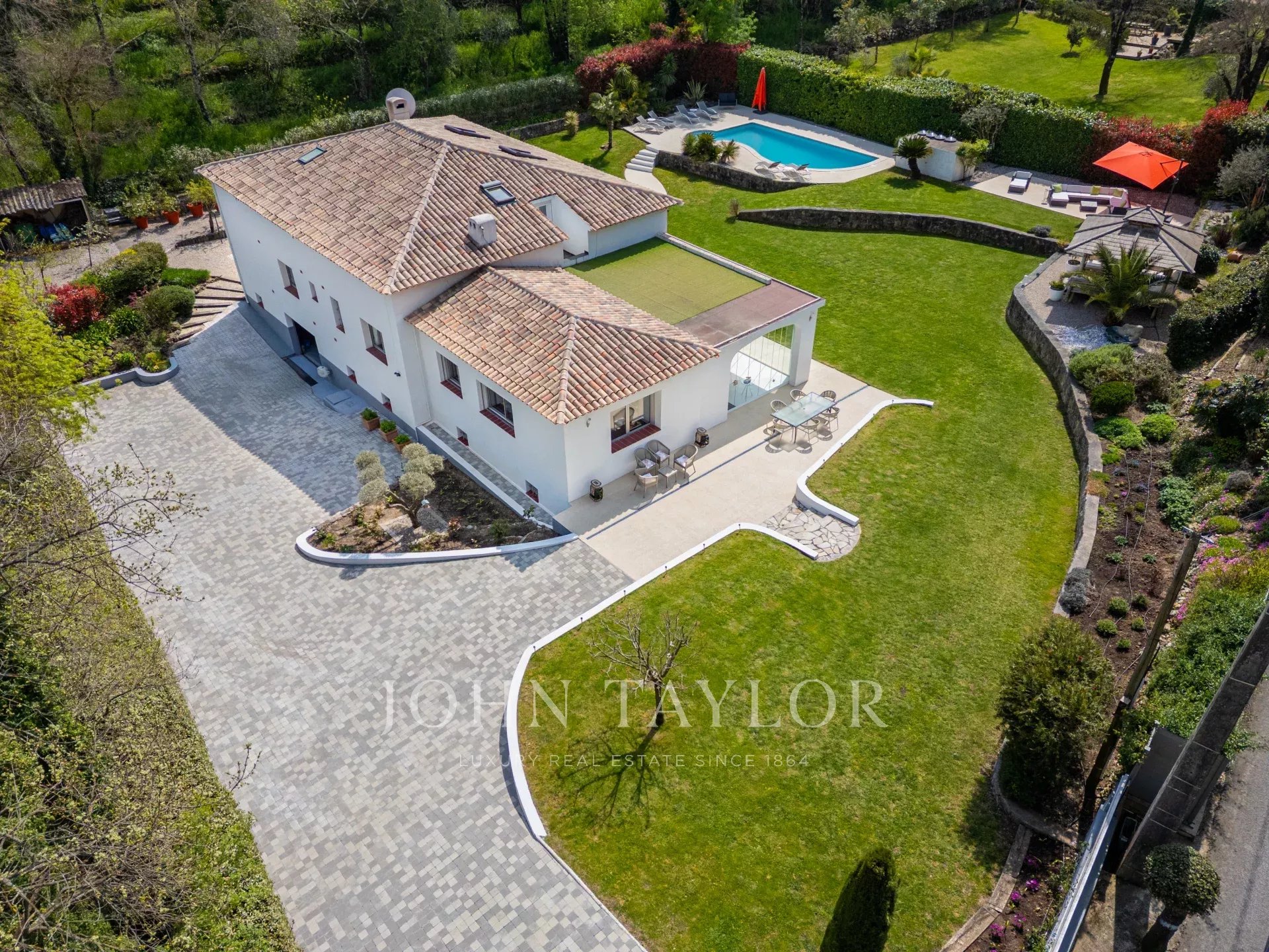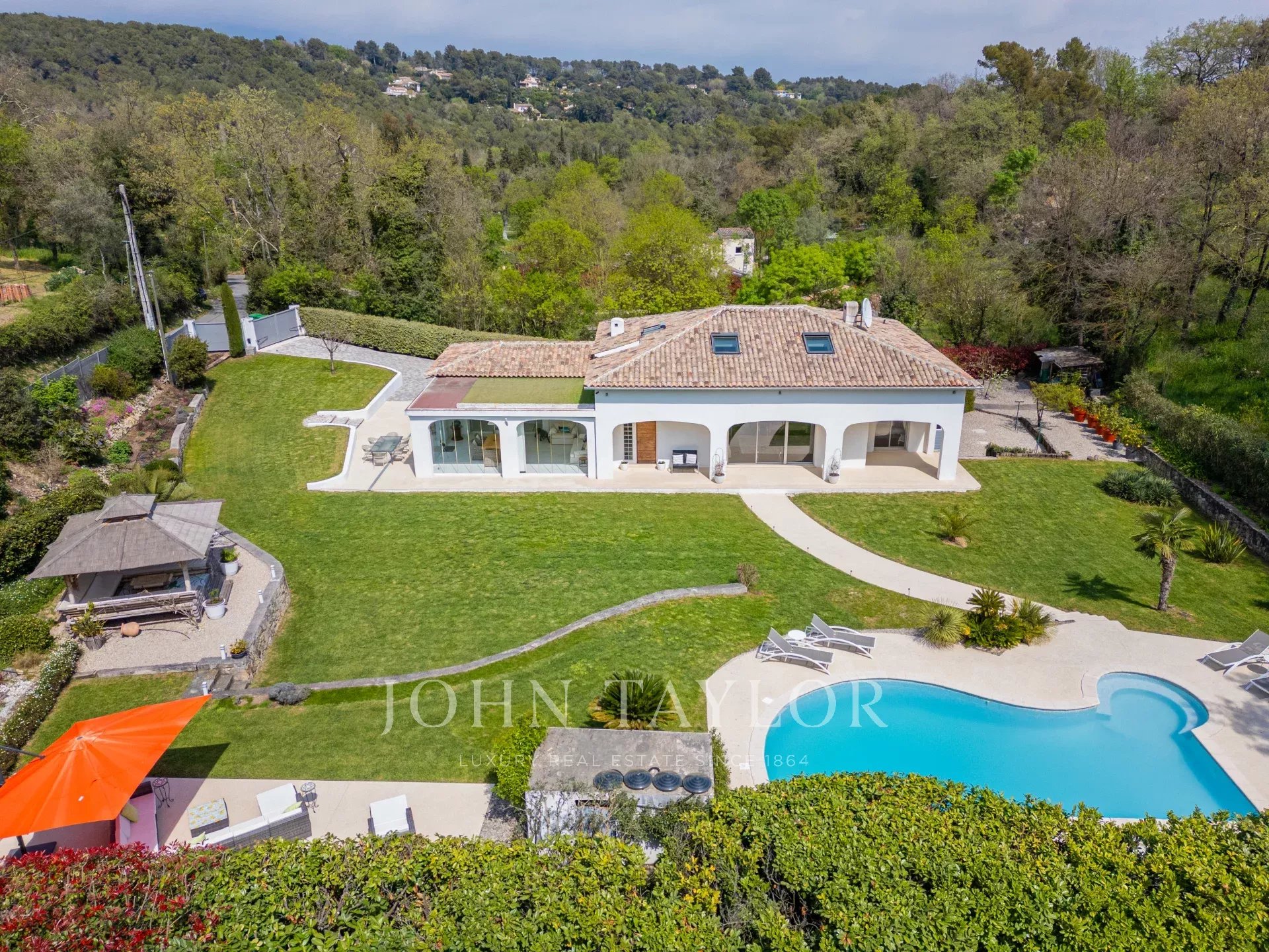 Nichée dans un magnifique jardin paysager, orienté ouest et au calme, cette spacieuse villa bénéficie d’un emplacement privilégié à proximité du village de Valbonne, avec un accès facile à Sophia Antipolis.