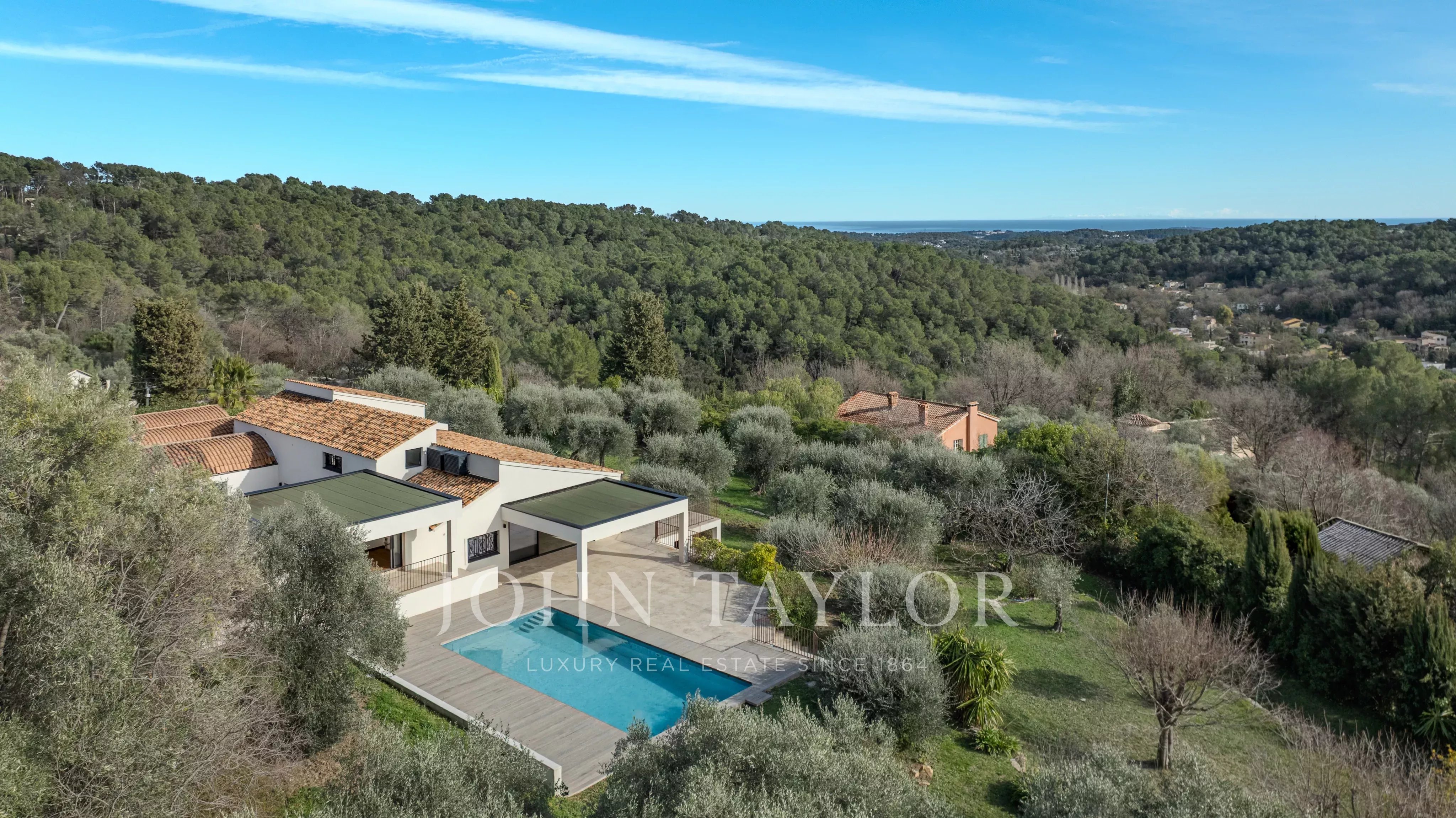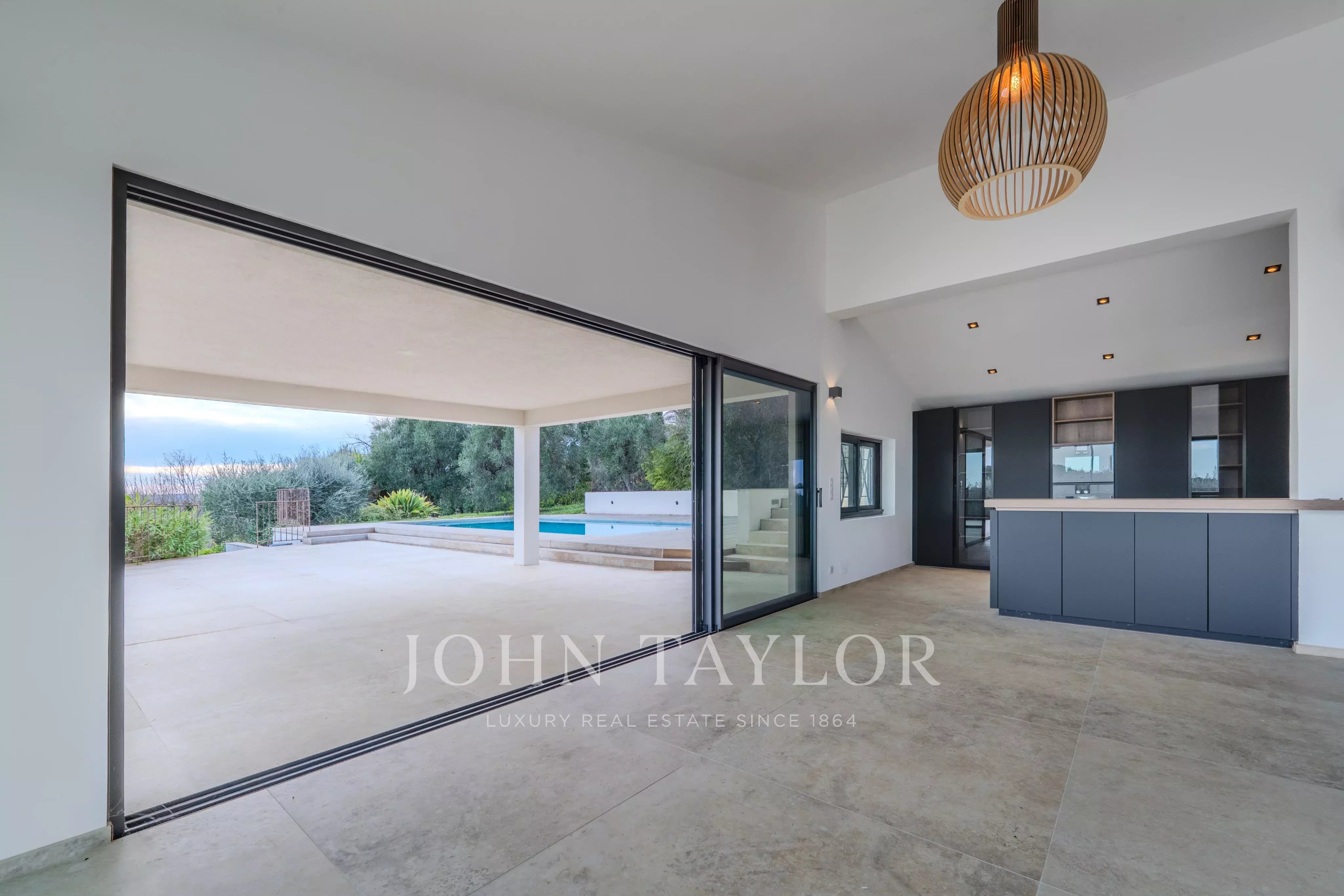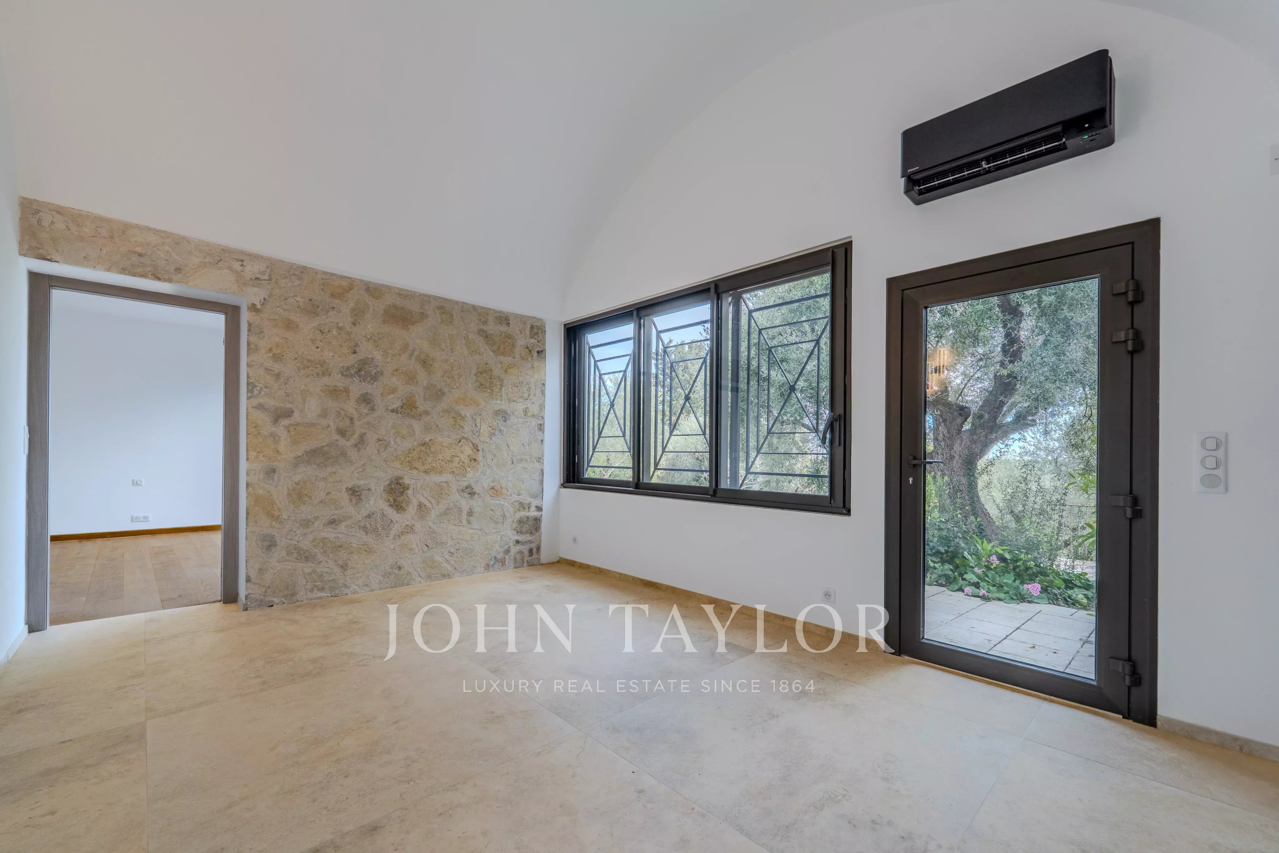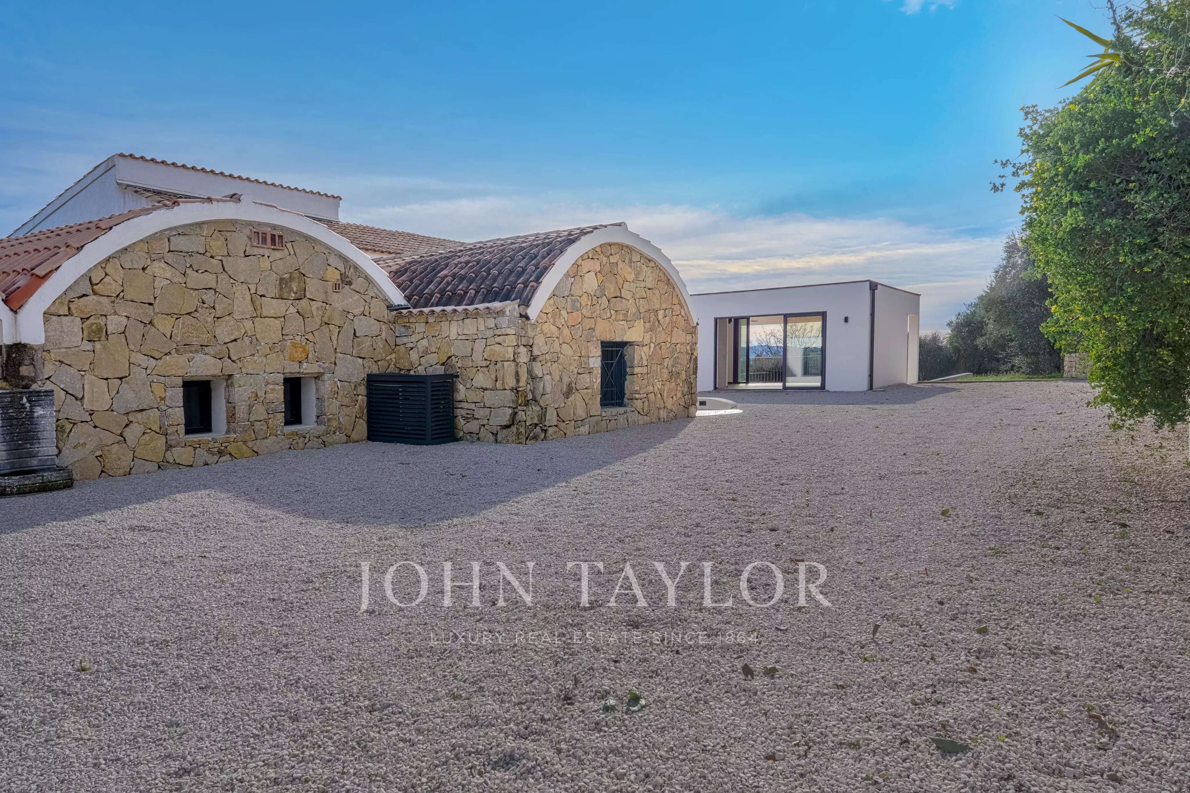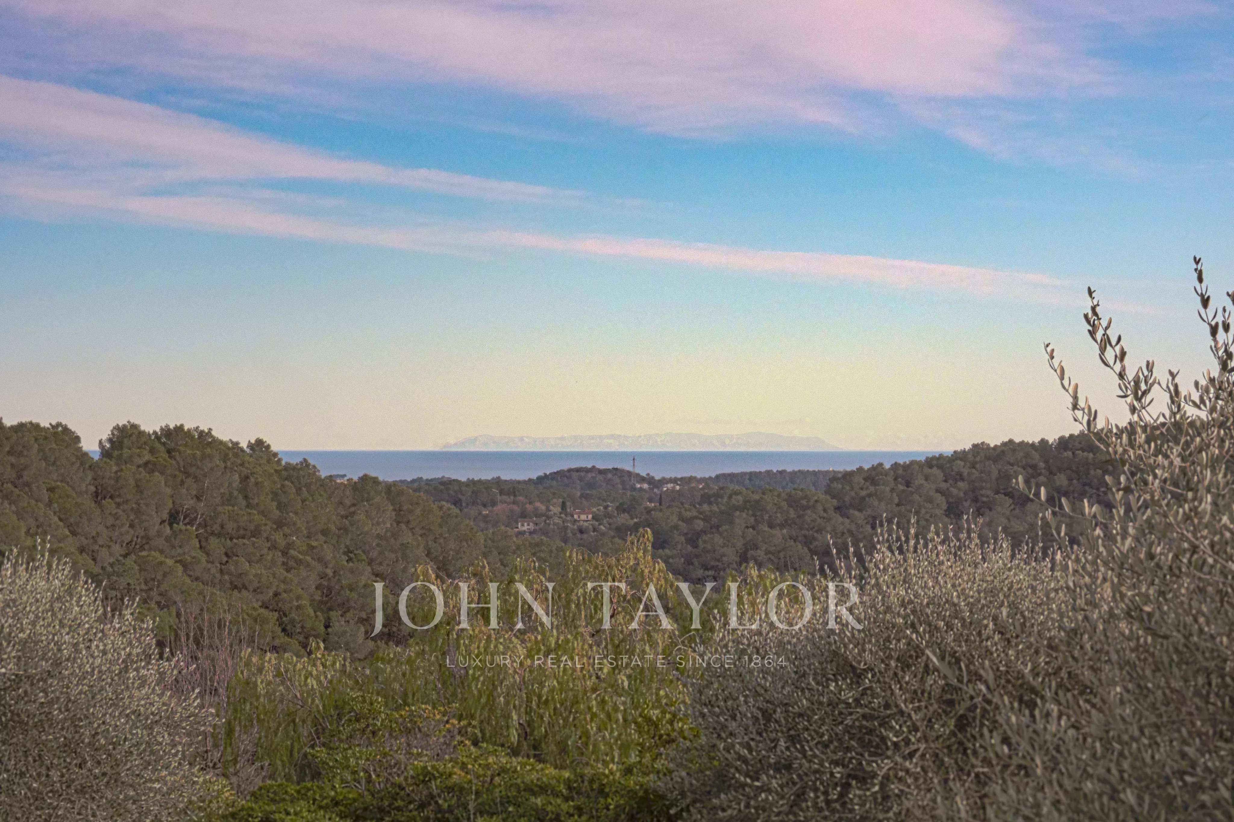 Avec une vue panoramique à 180° sur la mer Méditerranée et la campagne verdoyante, sans aucune autre habitation à l’horizon, elle constitue une oasis de tranquillité à seulement quelques pas de la Côte d’Azur.