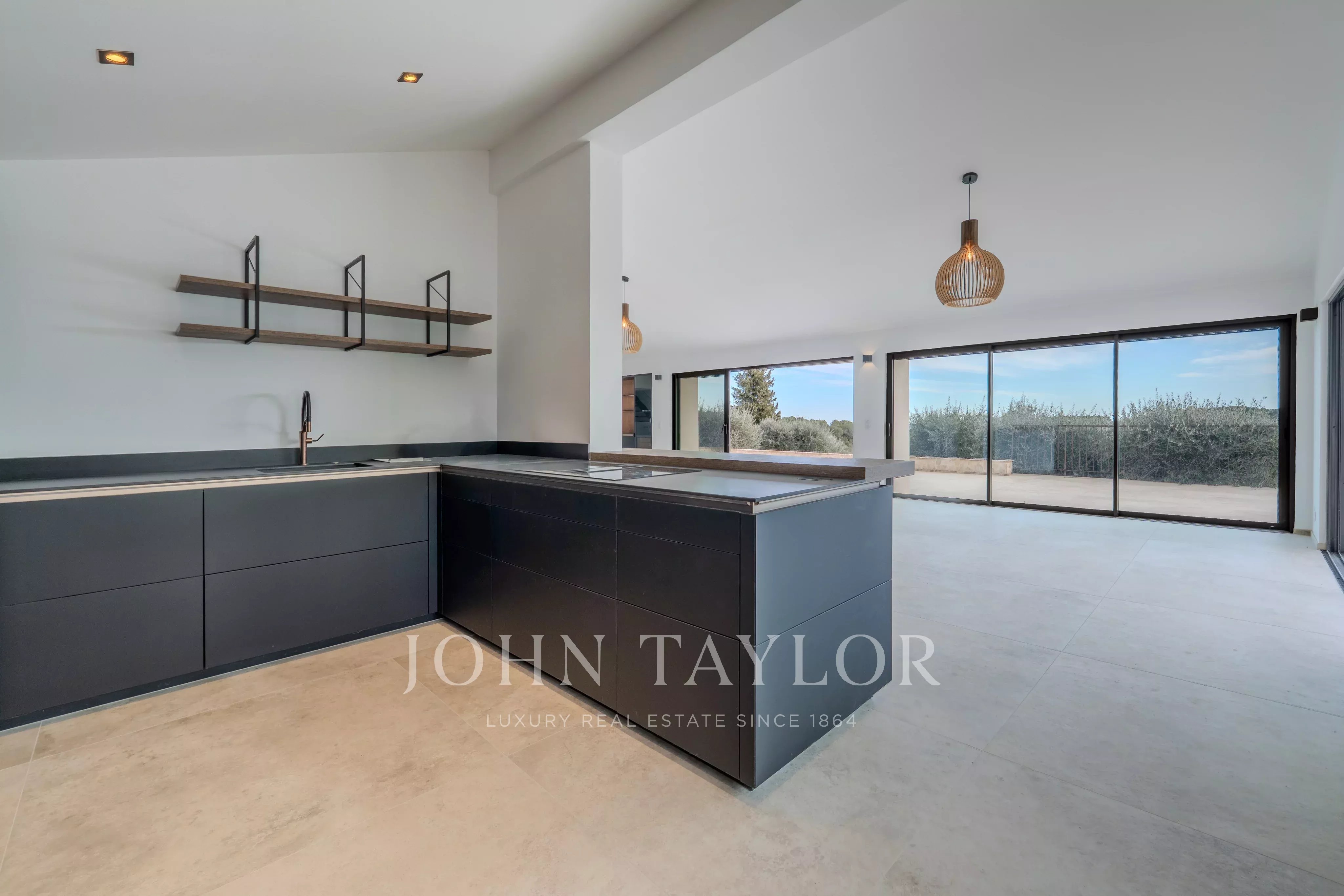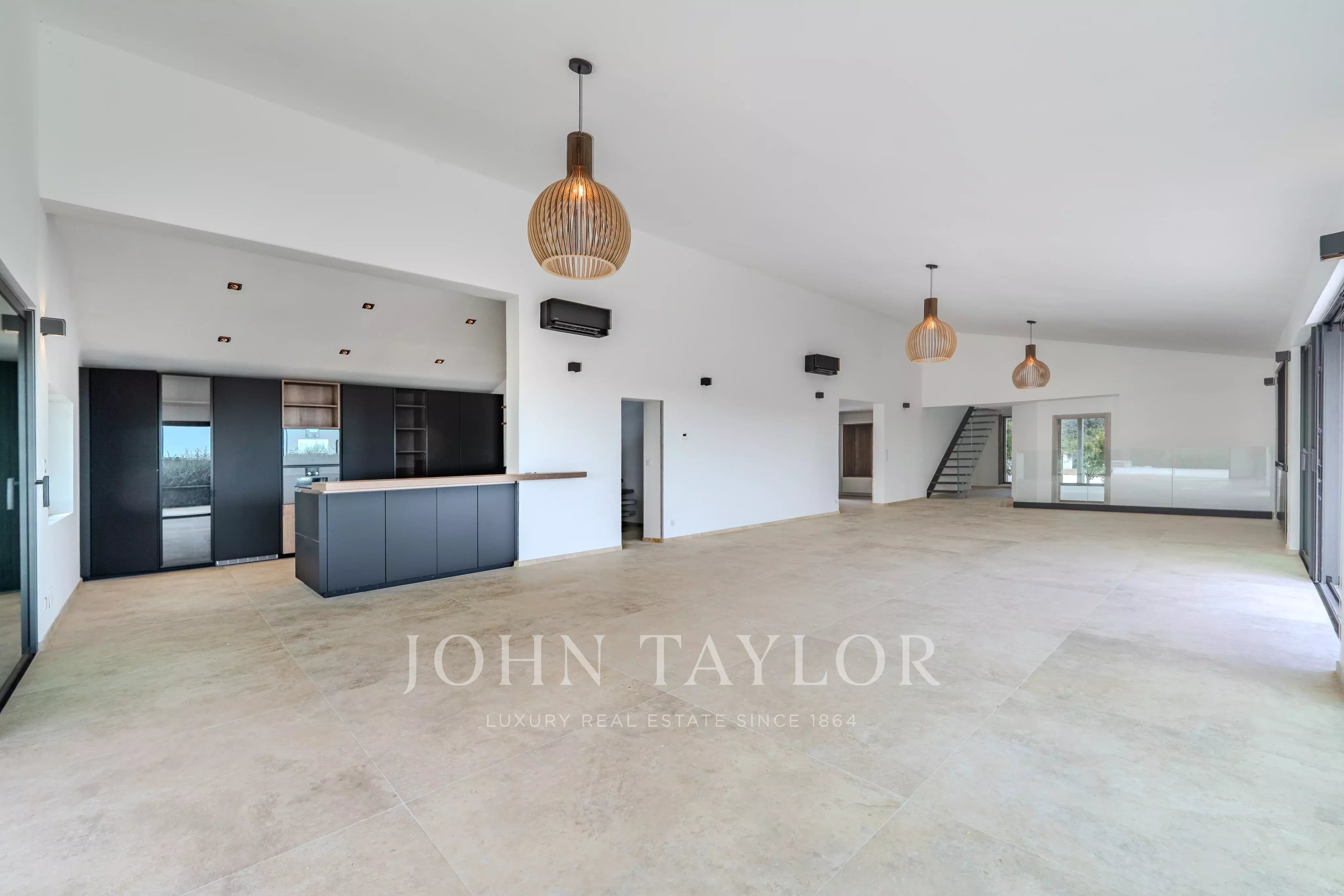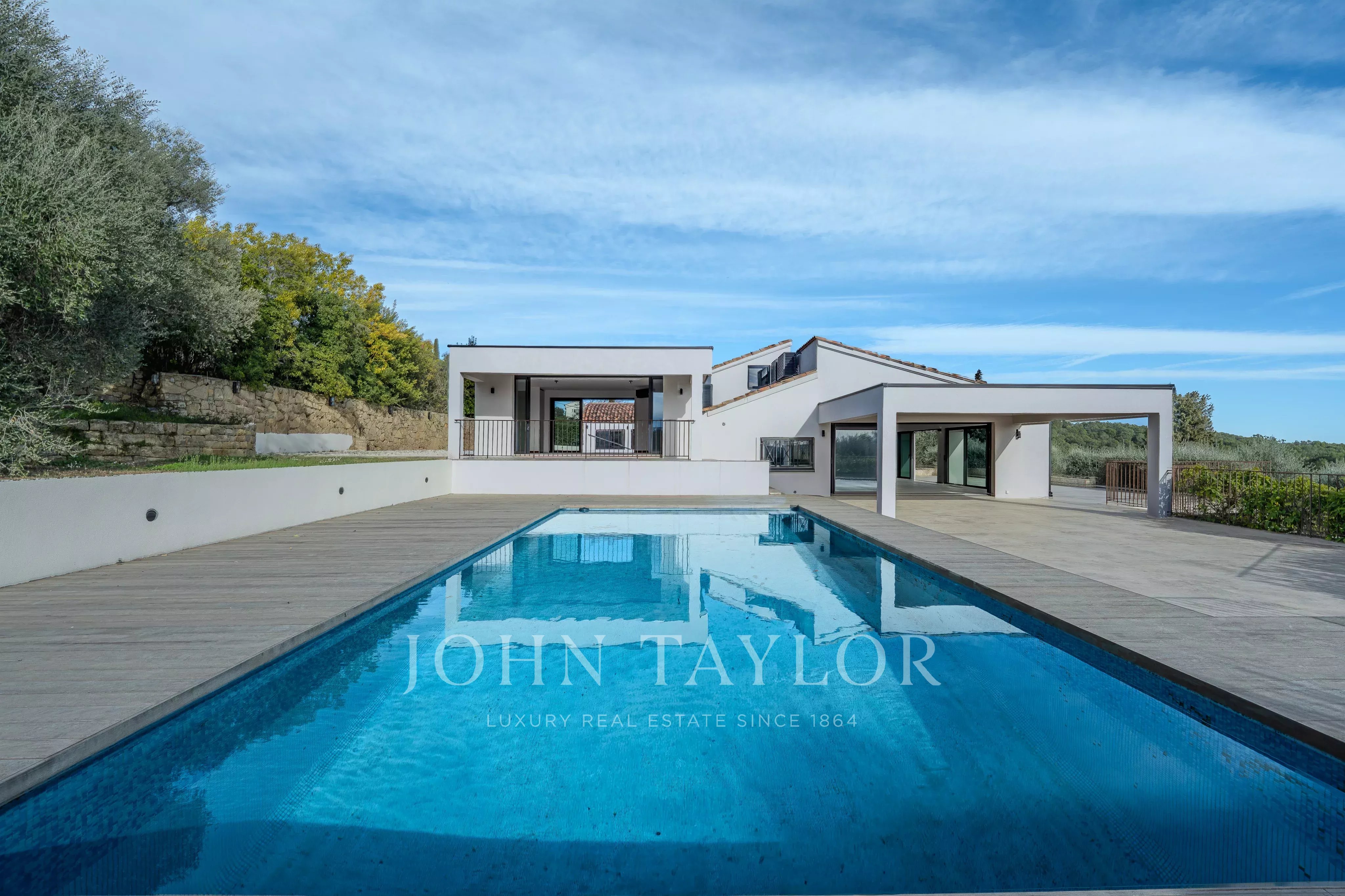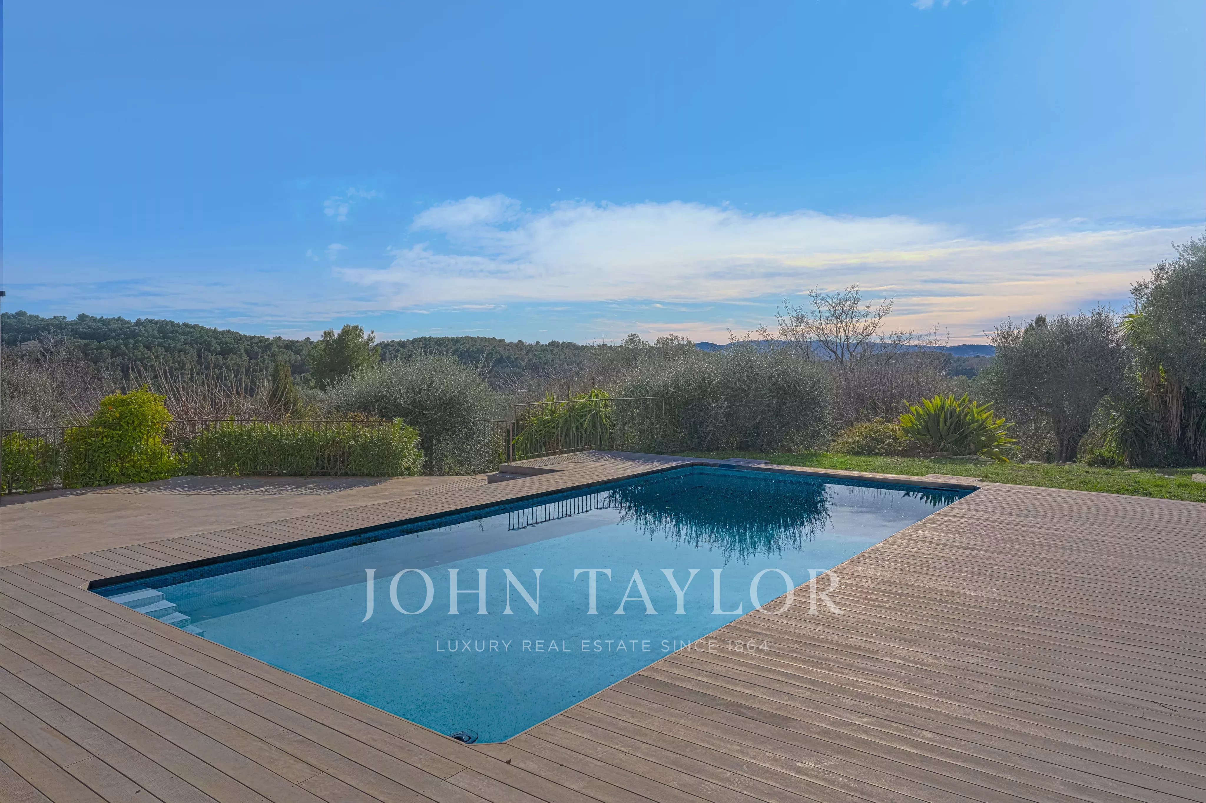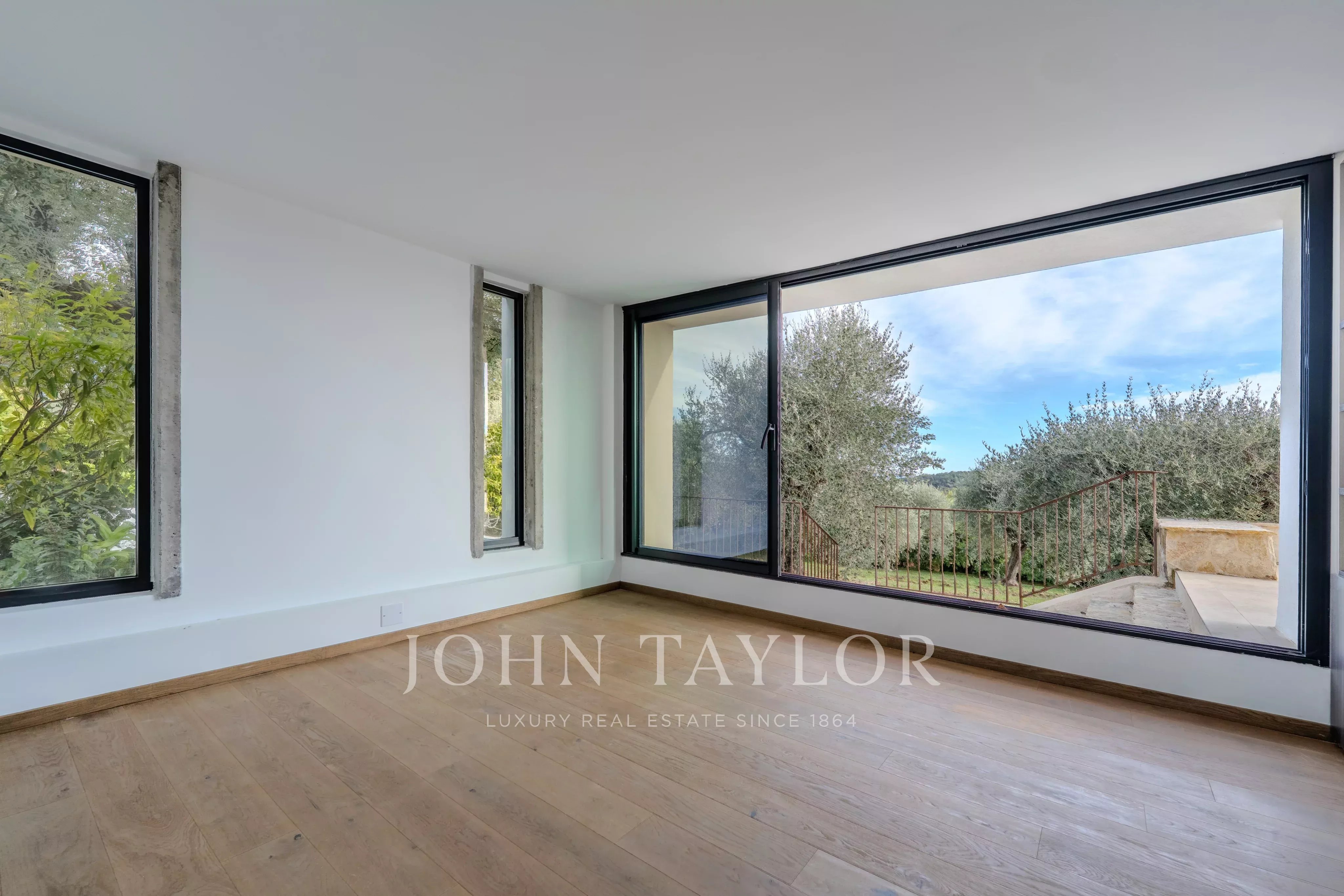 Avec une vue panoramique à 180° sur la mer Méditerranée et la campagne verdoyante, sans aucune autre habitation à l’horizon, elle constitue une oasis de tranquillité à seulement quelques pas de la Côte d’Azur.