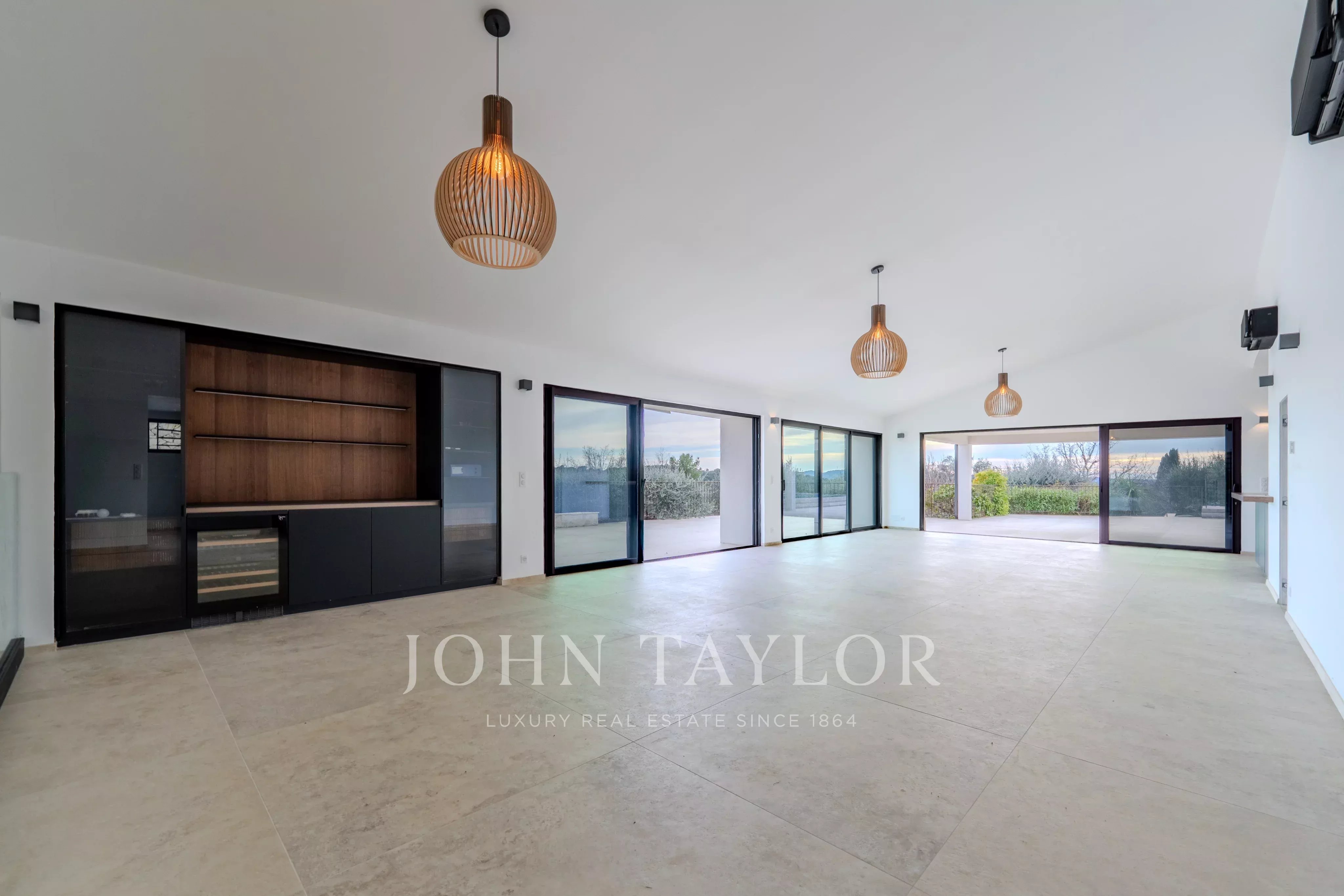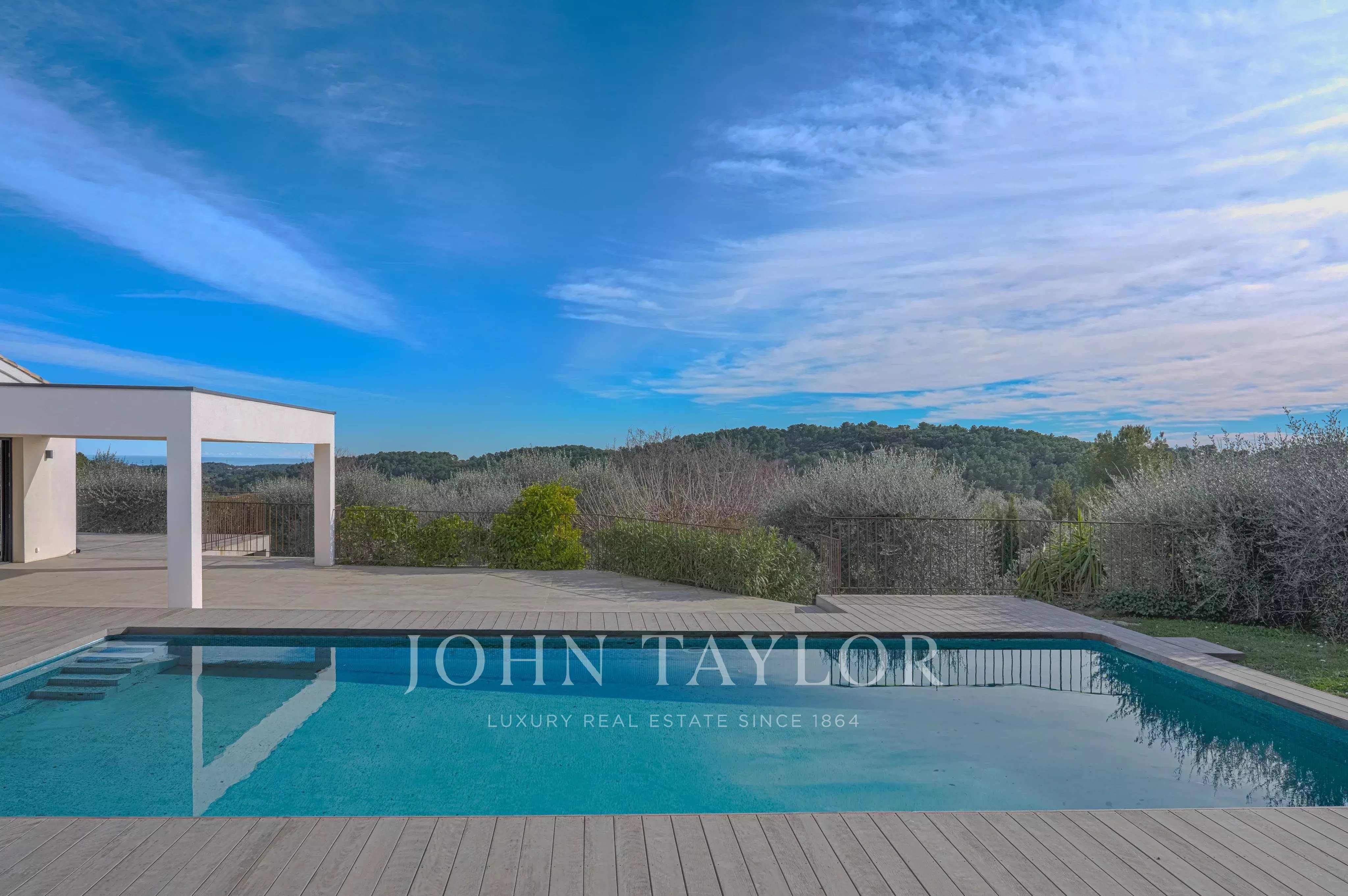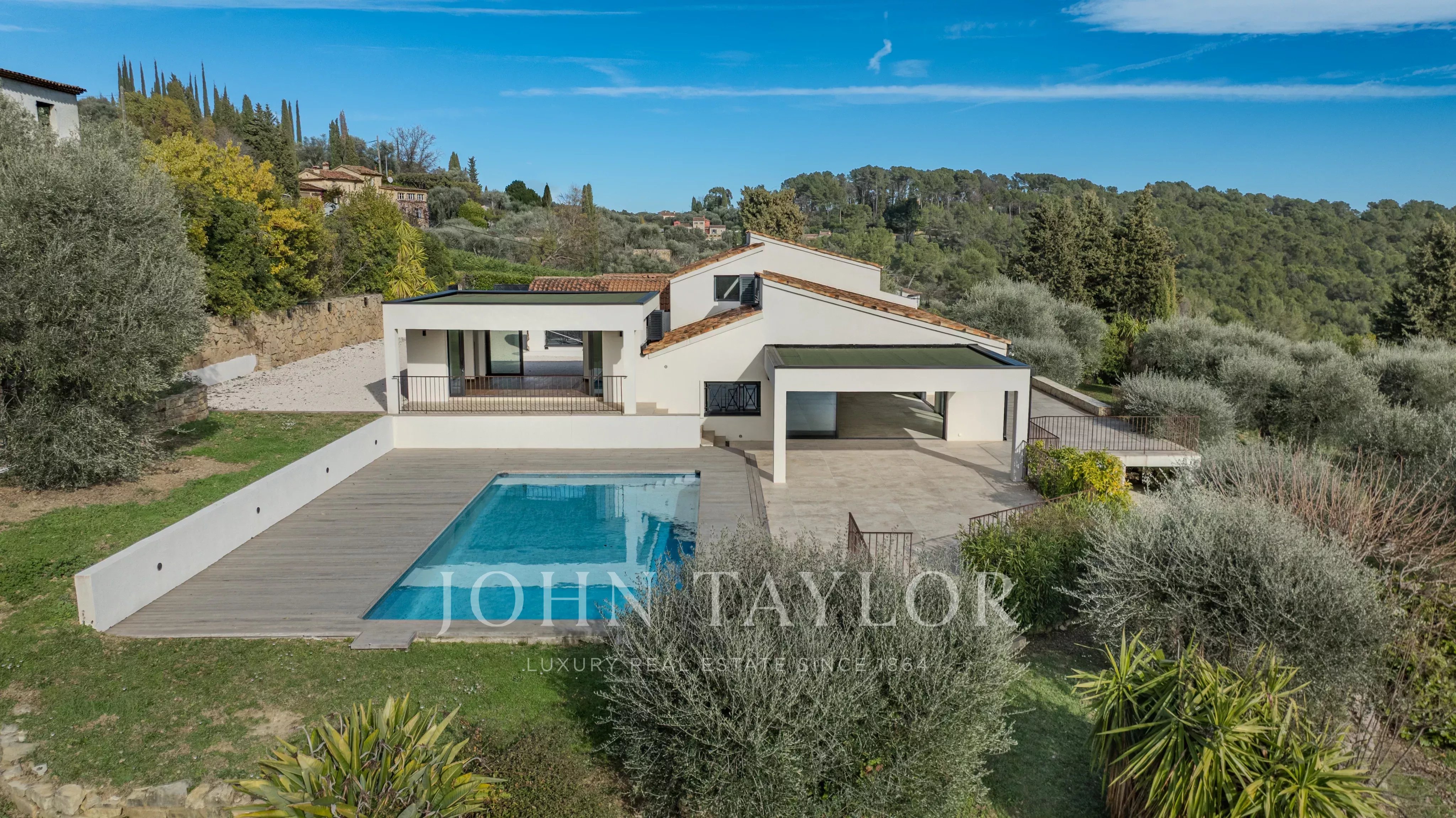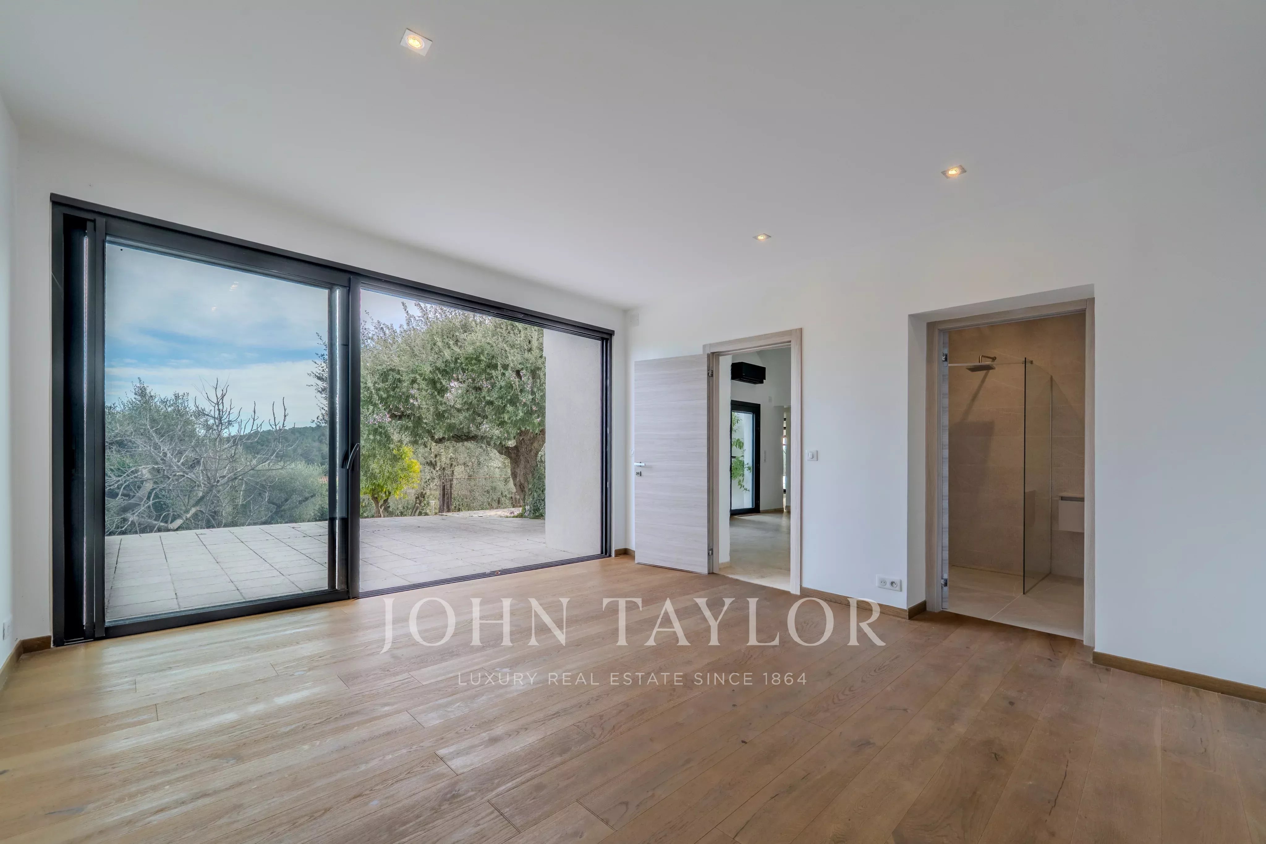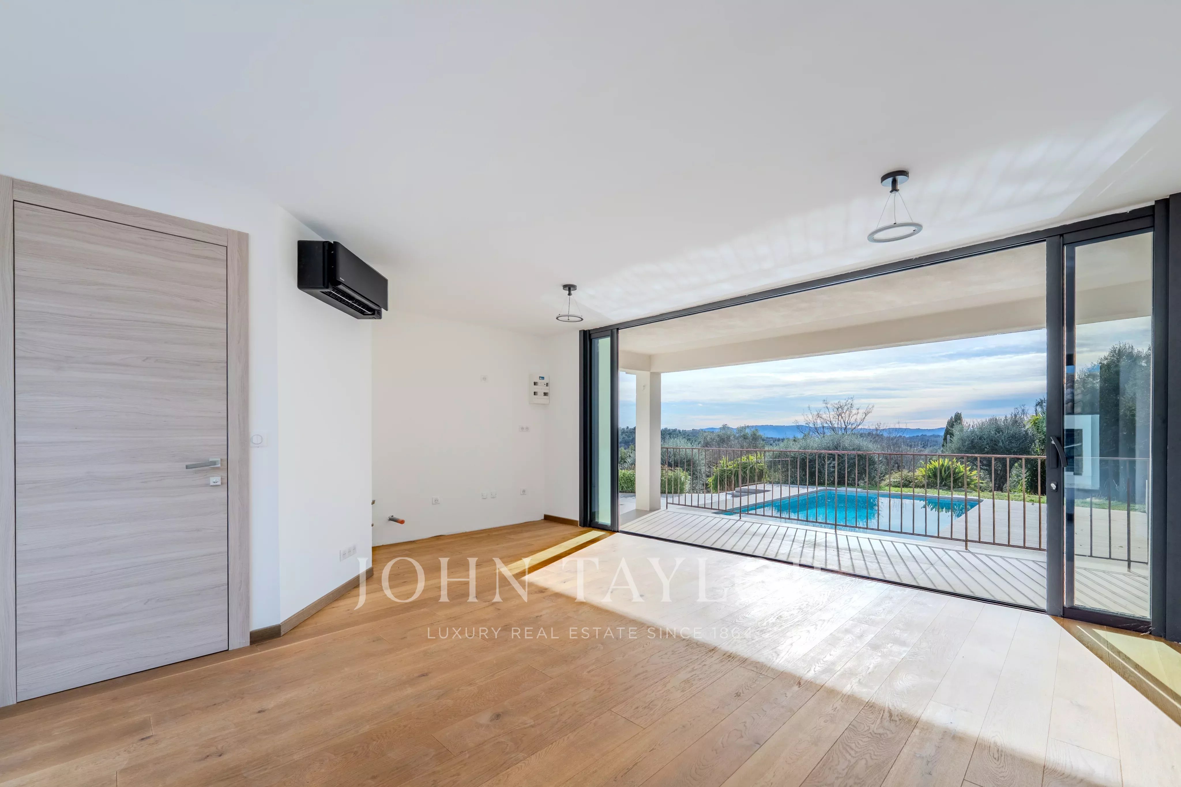 Avec une vue panoramique à 180° sur la mer Méditerranée et la campagne verdoyante, sans aucune autre habitation à l’horizon, elle constitue une oasis de tranquillité à seulement quelques pas de la Côte d’Azur.