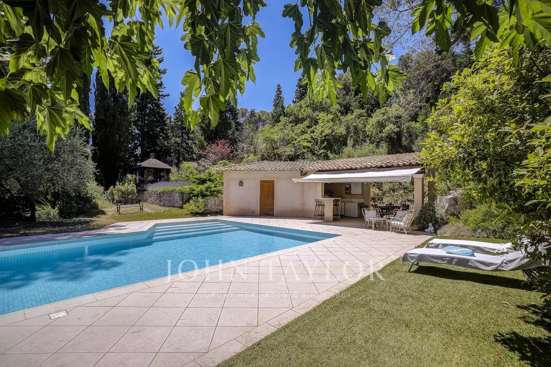 À l’extérieur, le terrain de 1 988 m² accueille un superbe espace piscine avec pool house, piscine au sel chauffée et sécurisée par un volet, le tout dans un cadre verdoyant et paisible.