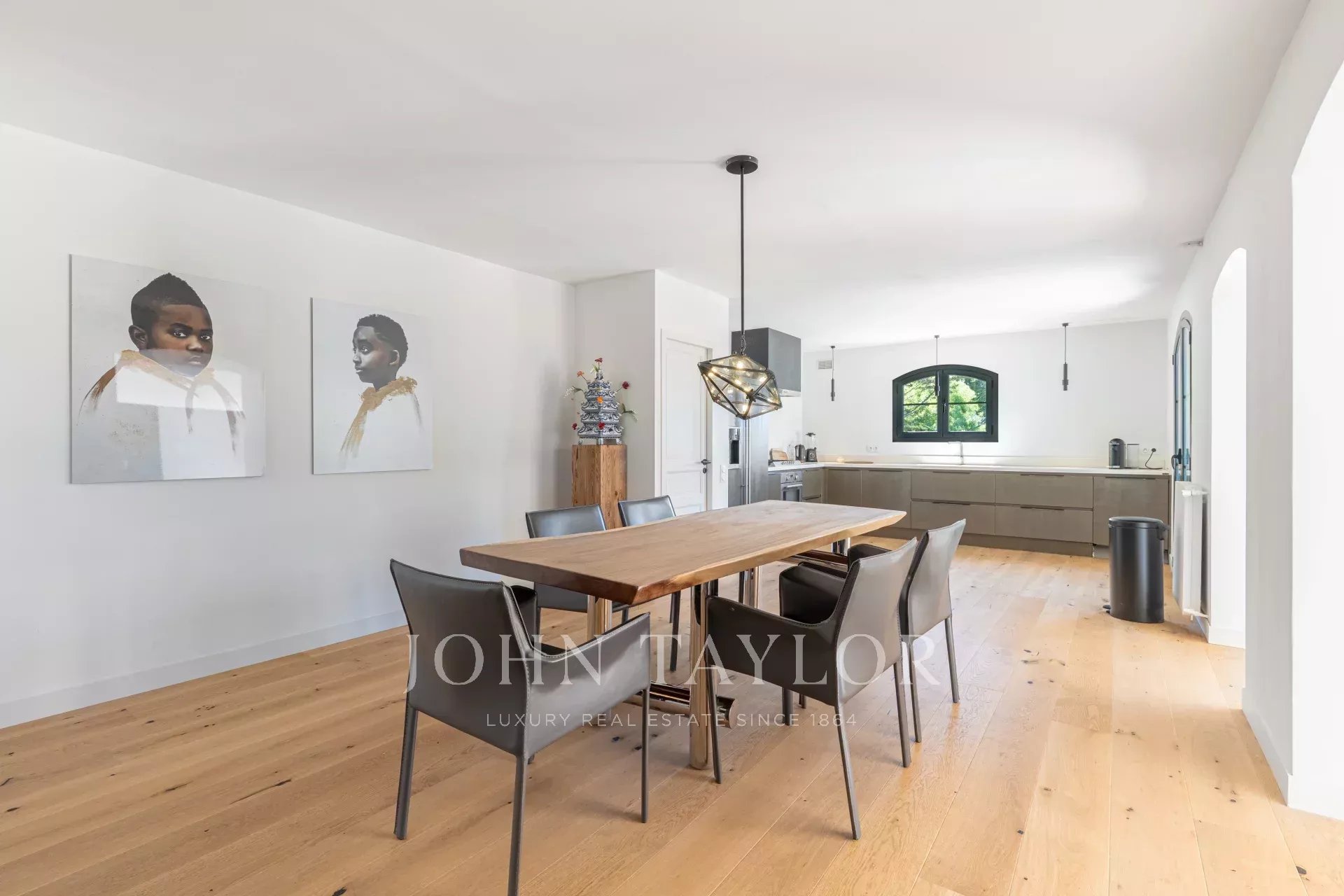 L’entrée mène à une cuisine contemporaine, ouverte et entièrement équipée, prolongée par une grande salle à manger.