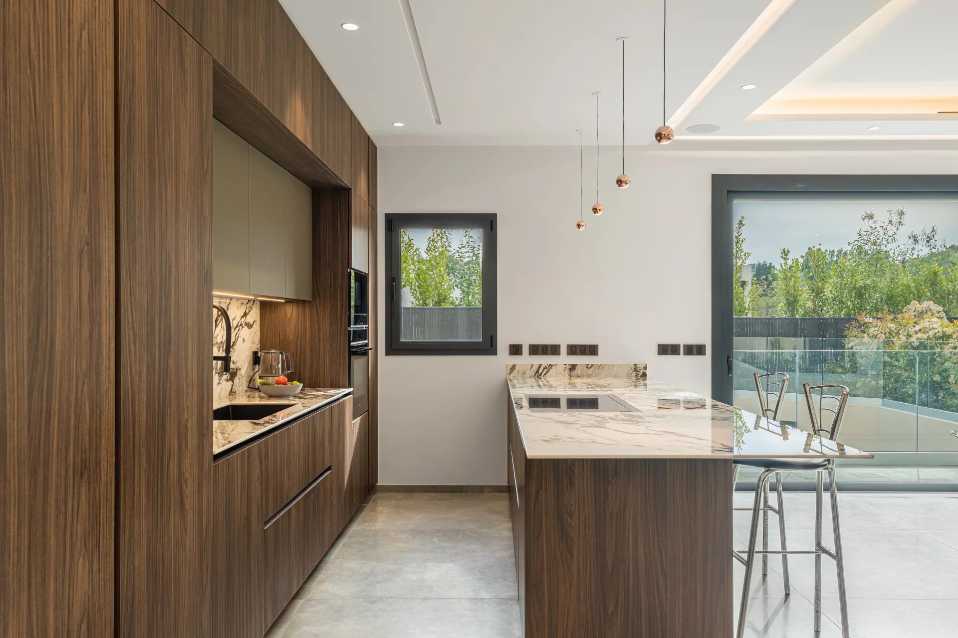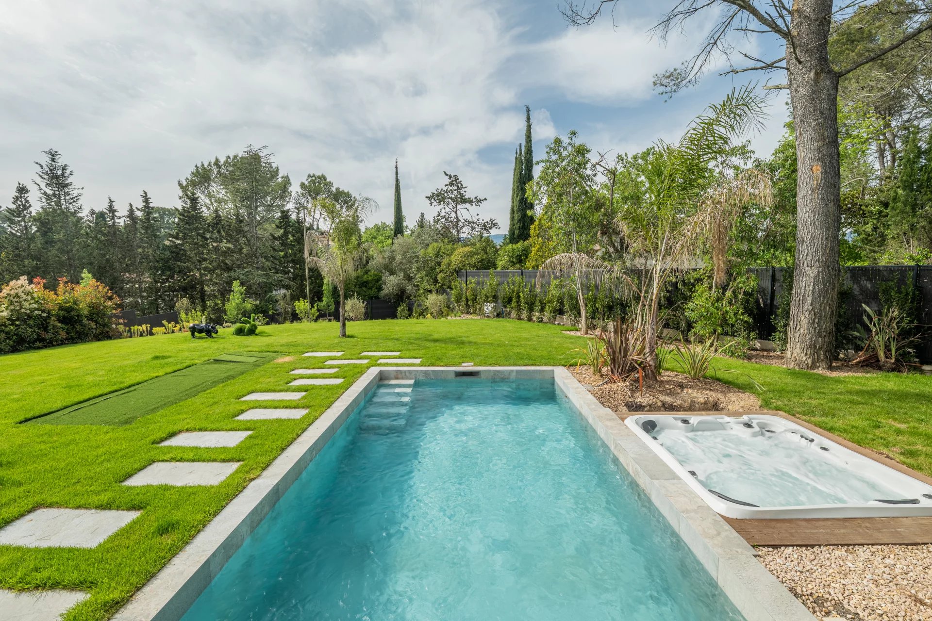 De larges baies vitrées créent une transition naturelle entre l’intérieur raffiné et la spacieuse terrasse couverte, dévoilant une magnifique piscine accompagnée d’un jacuzzi.