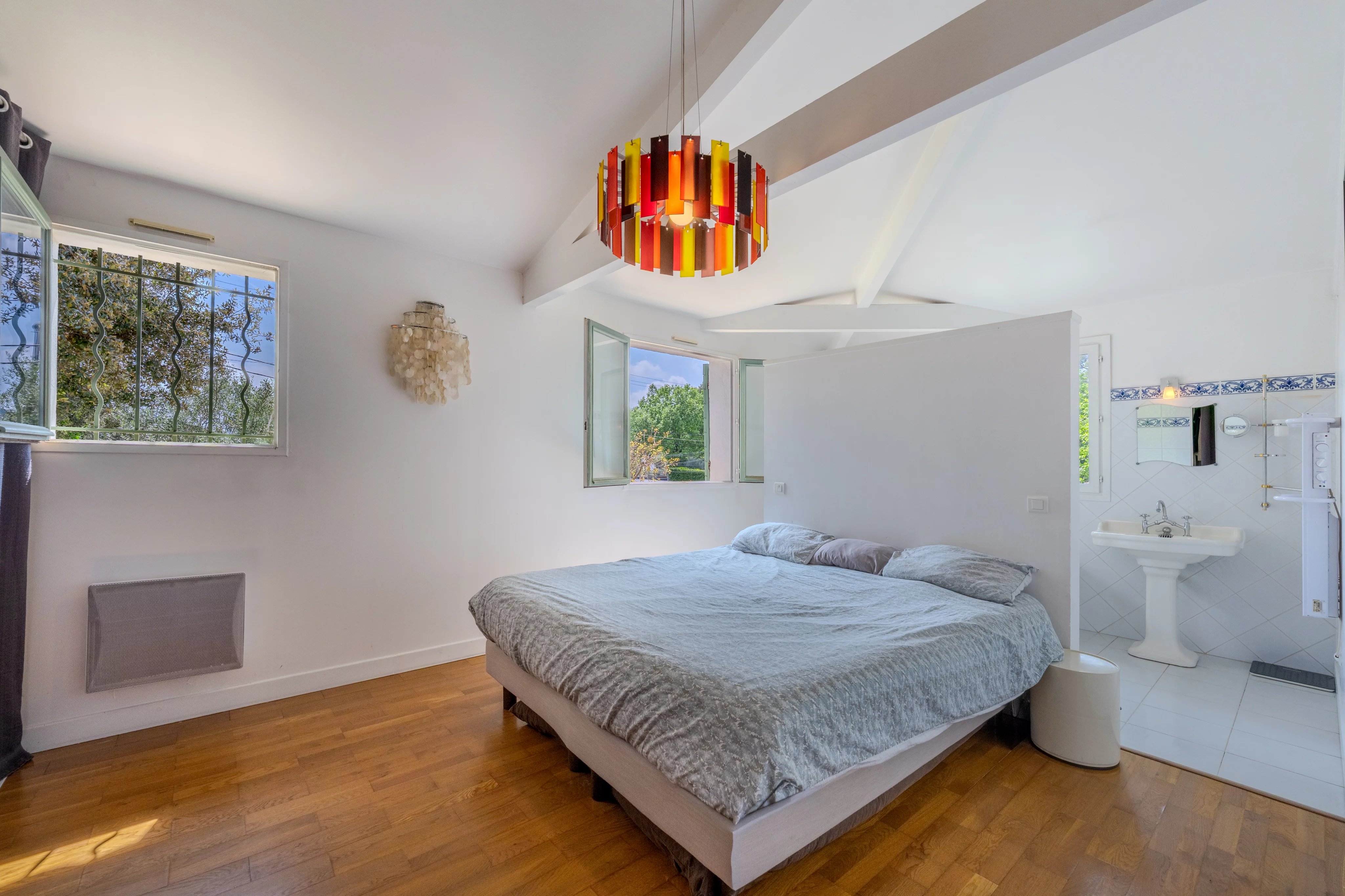 Le rez-de-chaussée accueille une chambre en suite, offrant un confort de plain-pied particulièrement apprécié. À l’étage, une élégante chambre de maître avec sa salle de bains et trois chambres supplémentaires se partagent une salle de bains, idéales pour une grande famille ou pour recevoir.