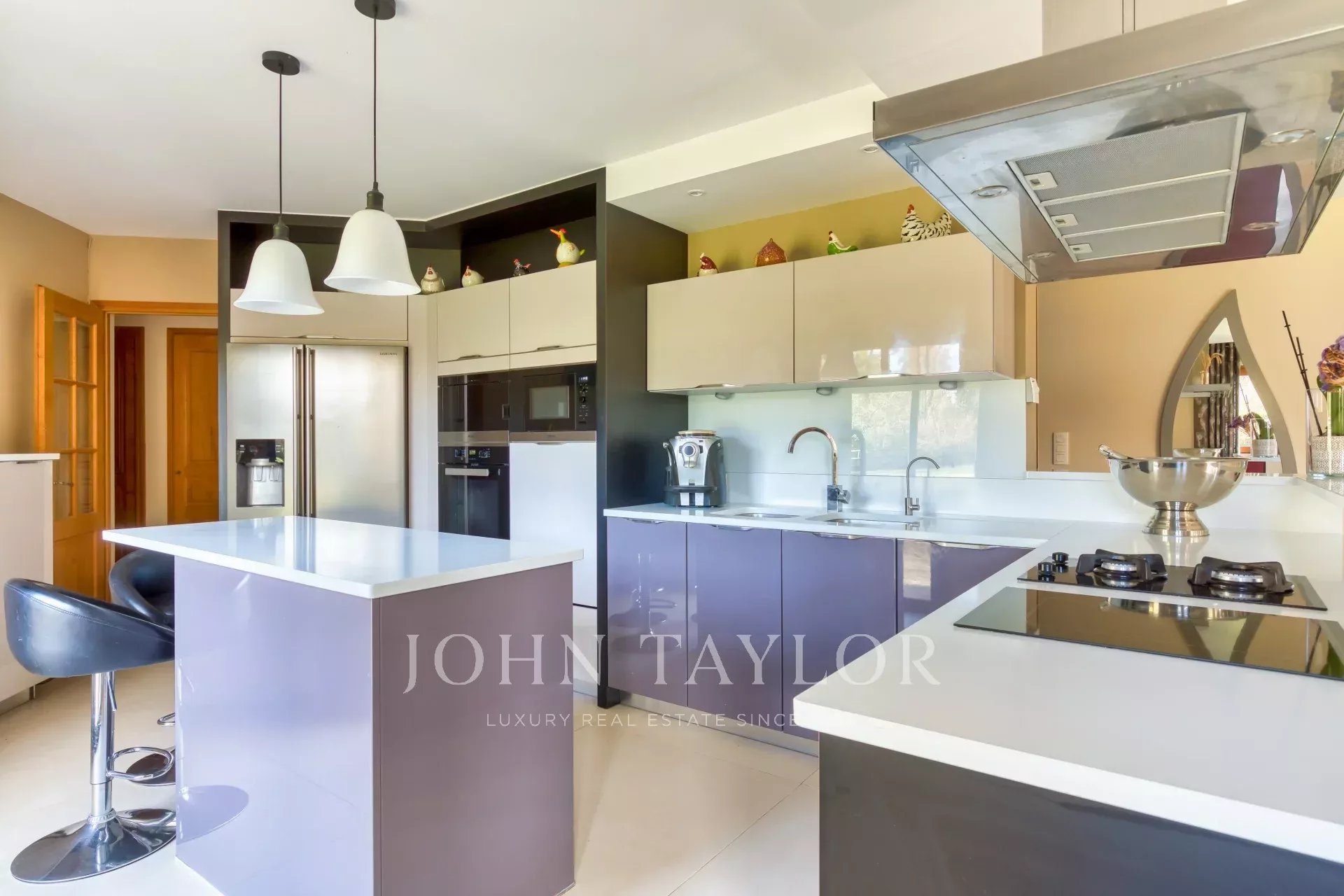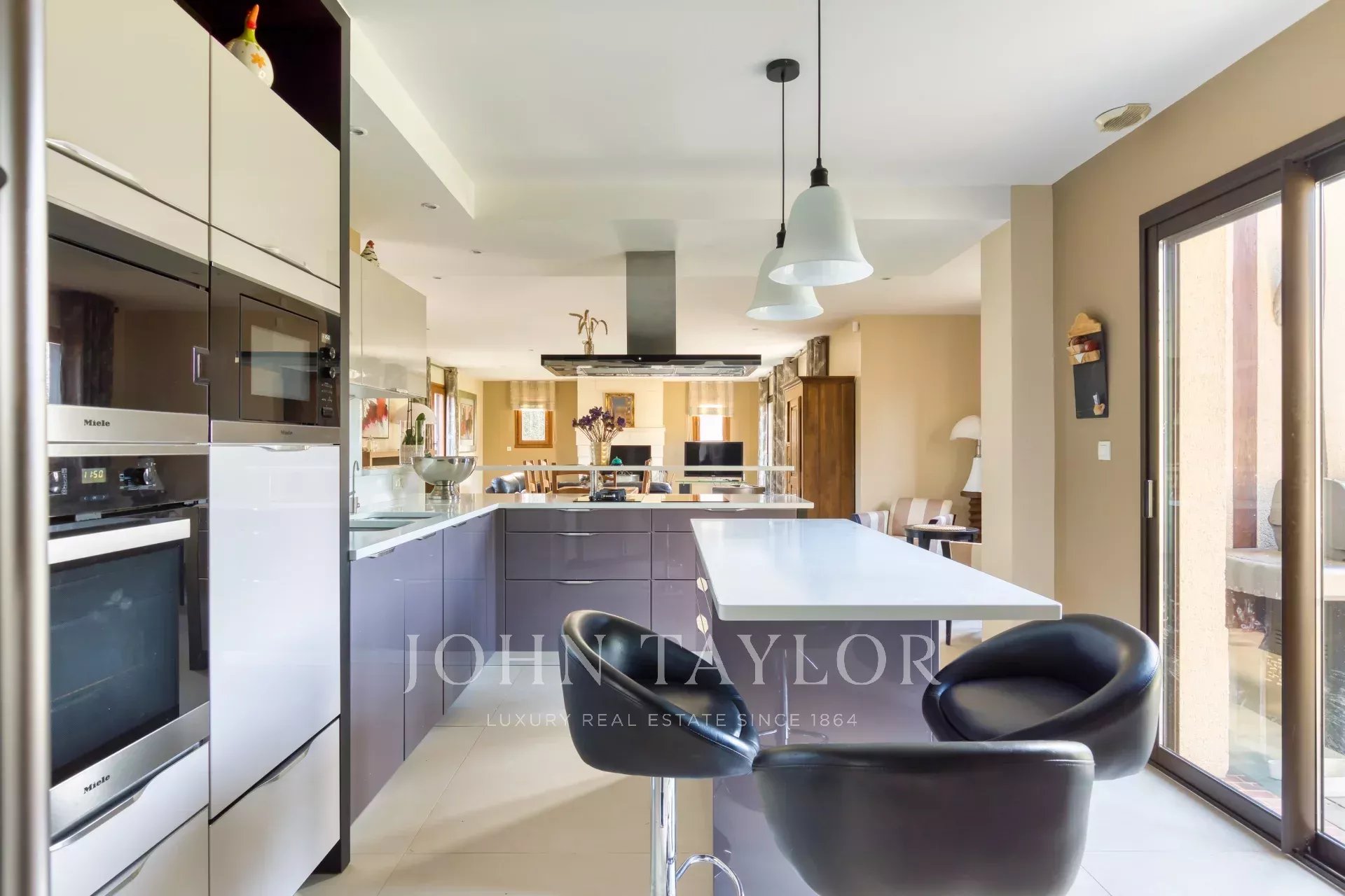 - une belle pièce de vie avec cuisine américaine, coin repas et salon avec cheminée donnant sur une grande terrasse exposée sud ouest