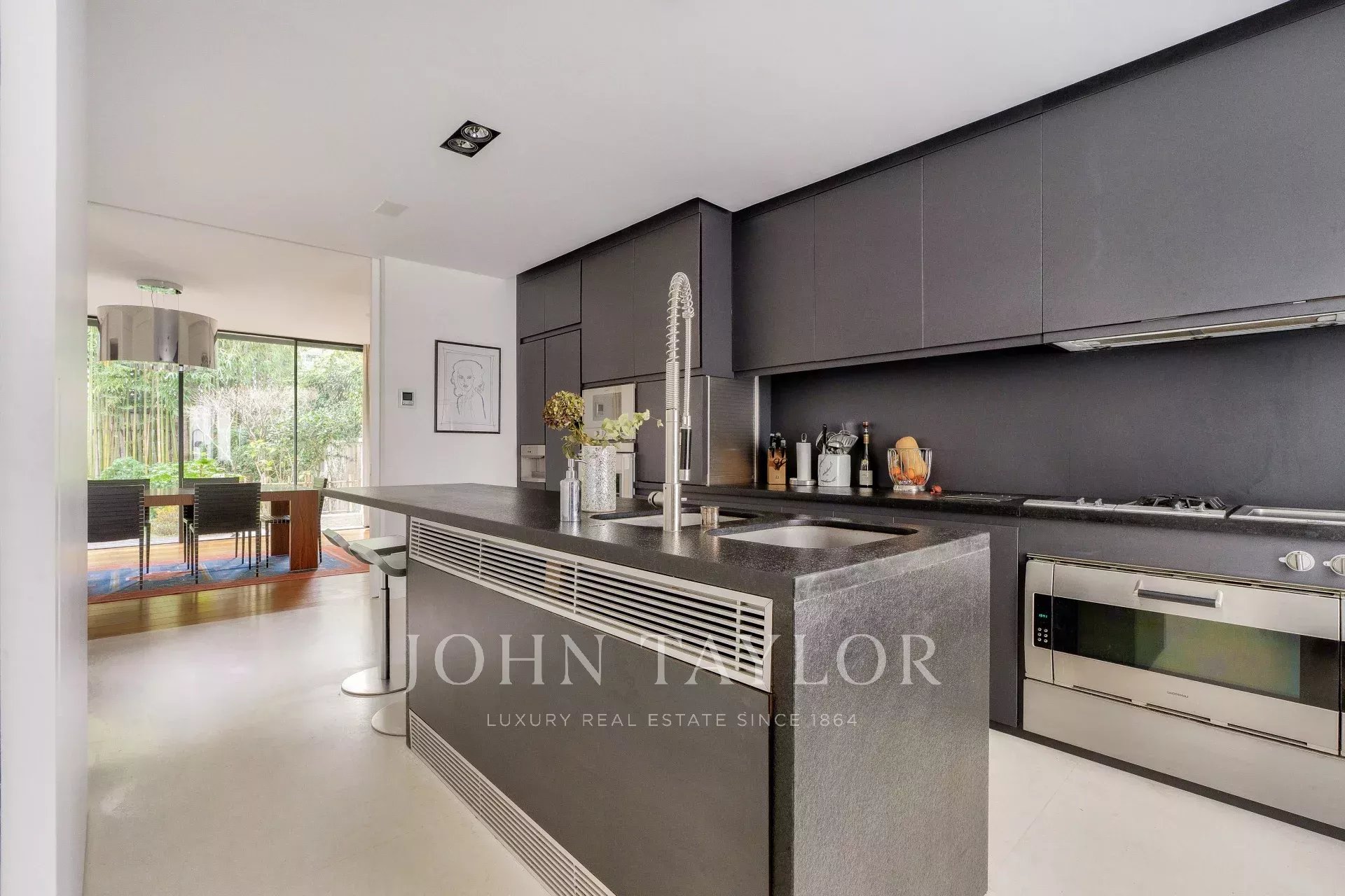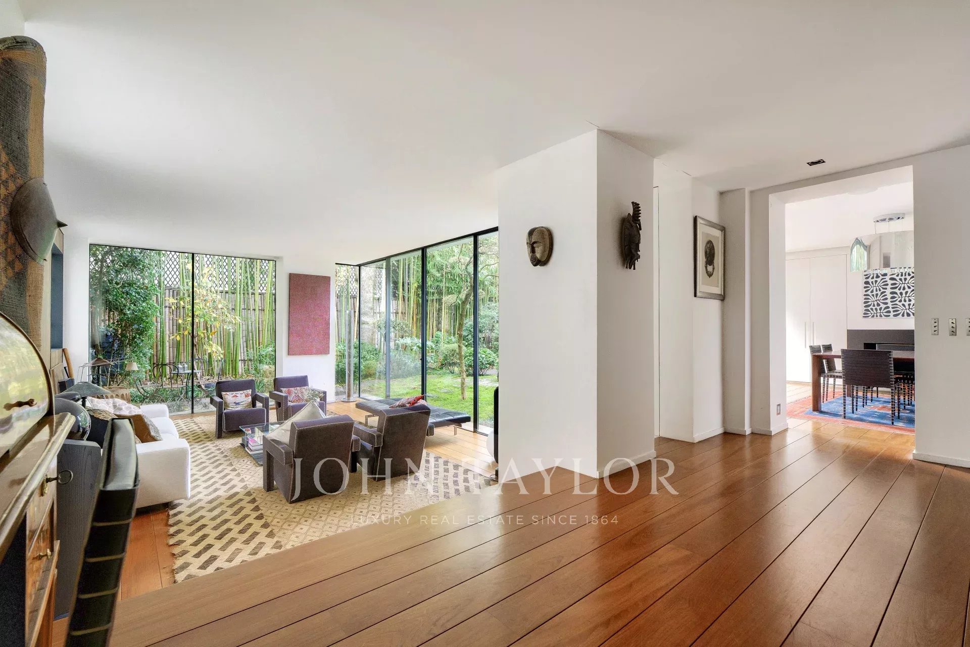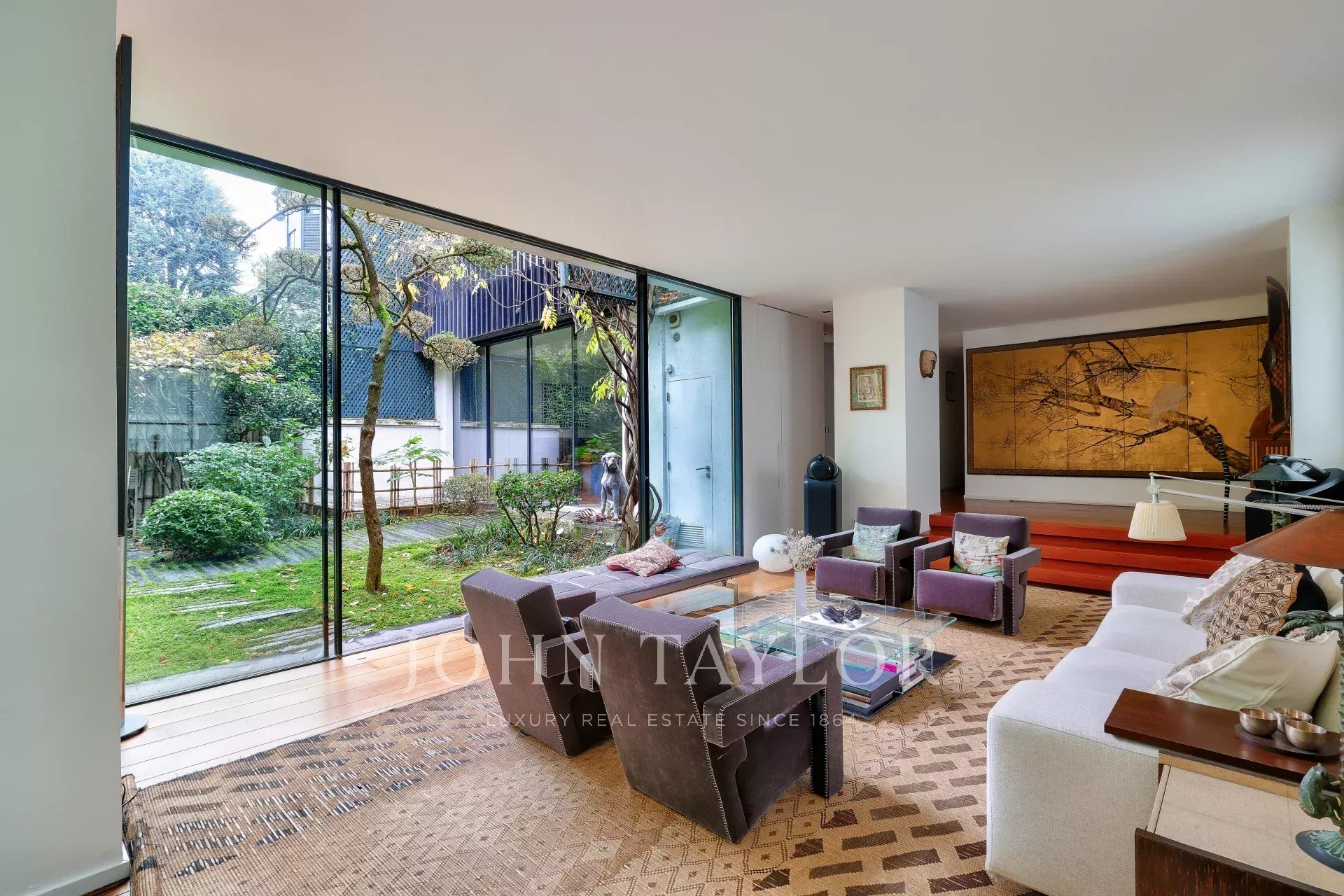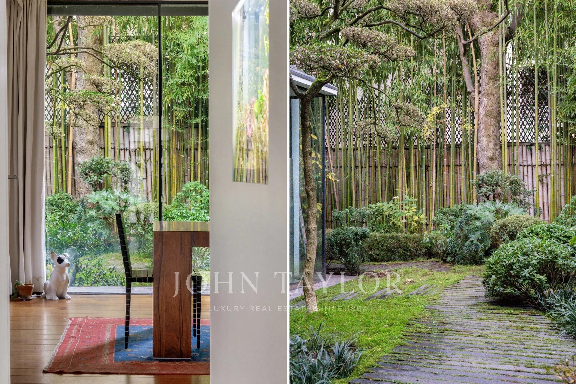 - Un vaste séjour / salle à manger ouvrant grâce à ses larges baies-vitrées sur un sublime écrin de verdure Japonisant : un travail d’'orfèvre, une oeuvre d’art enveloppant le lieu et lui donnant une intimité rare.