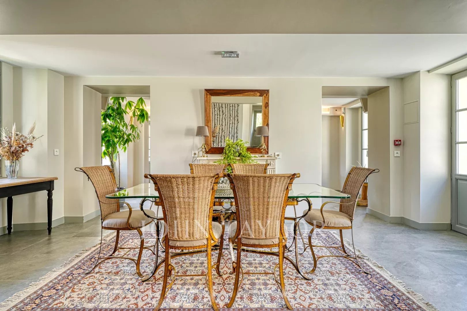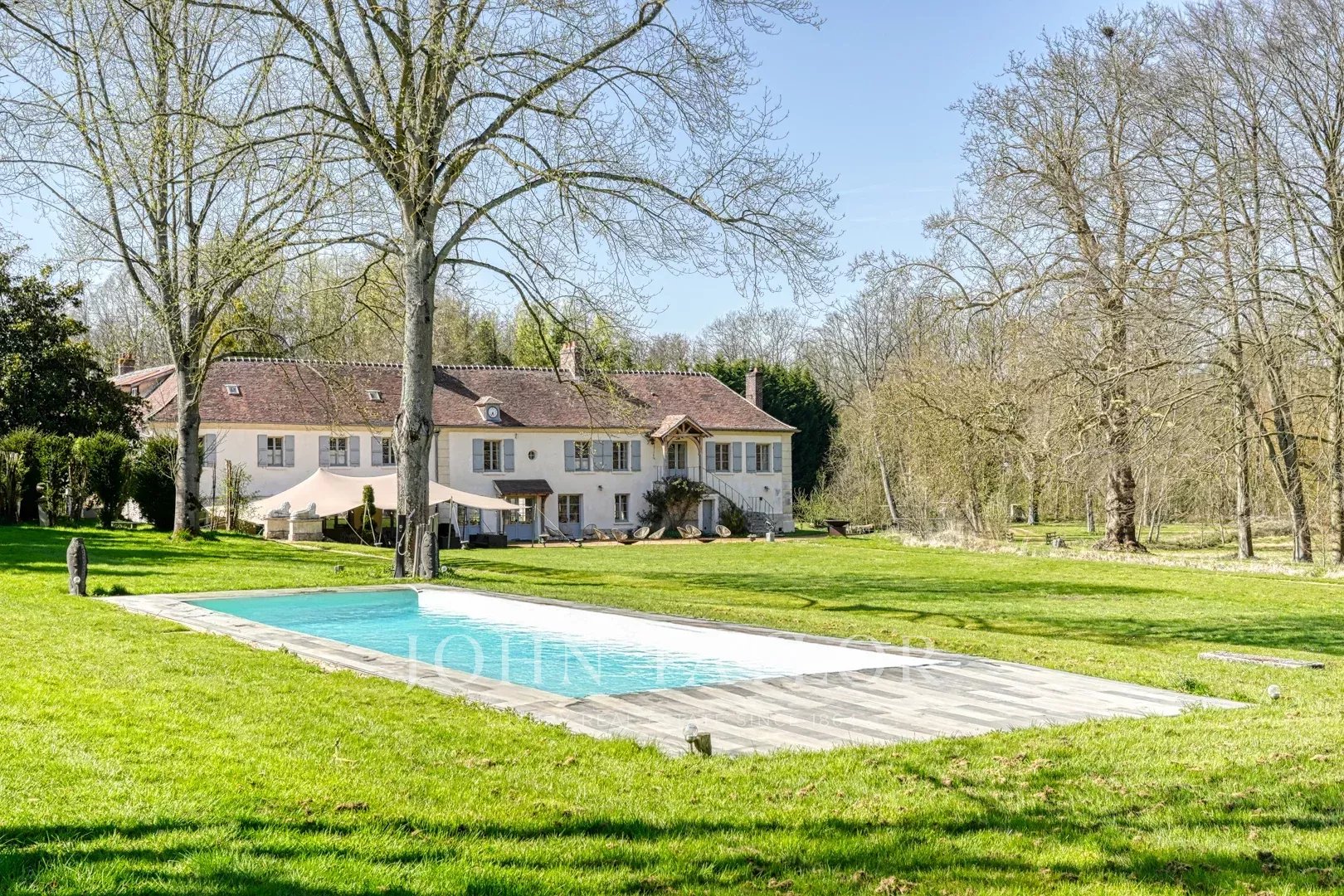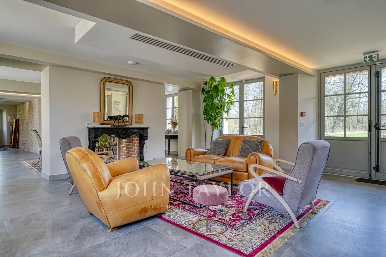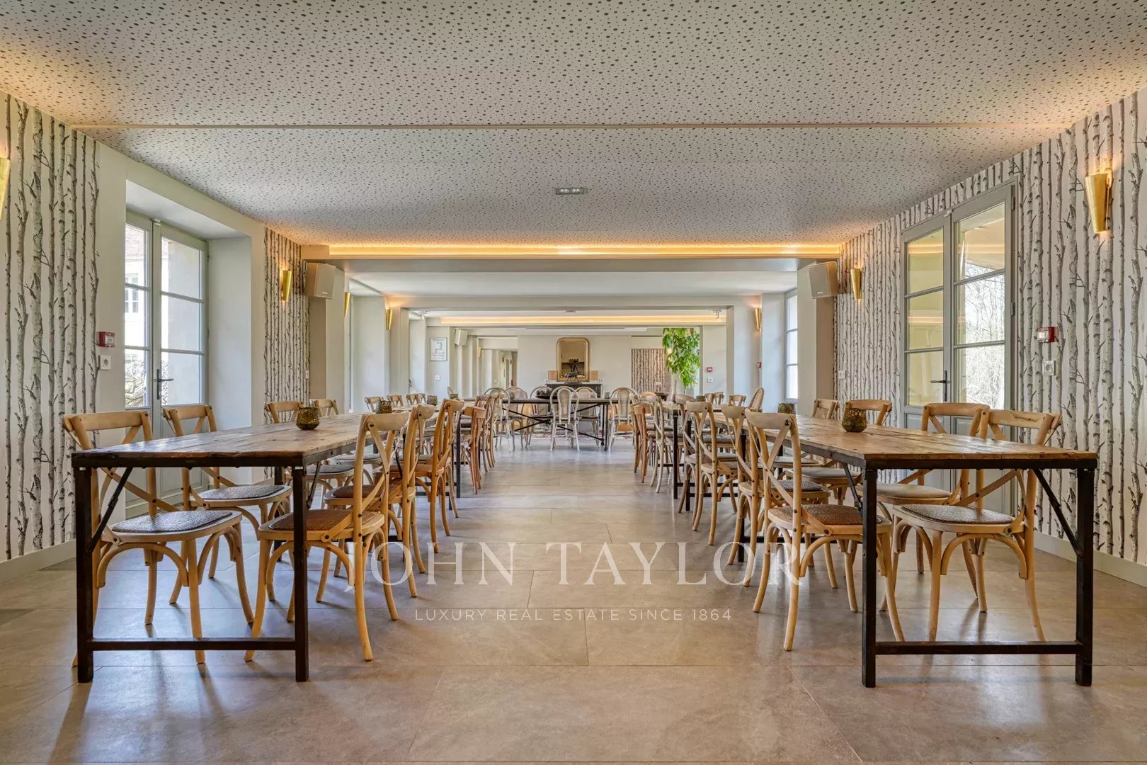 Au cœur de la demeure, une vaste salle de réception de 160 m² s’ouvre sur une terrasse de 300 m², orientée vers le parc doté d’une piscine chauffée et d’un terrain de tennis.