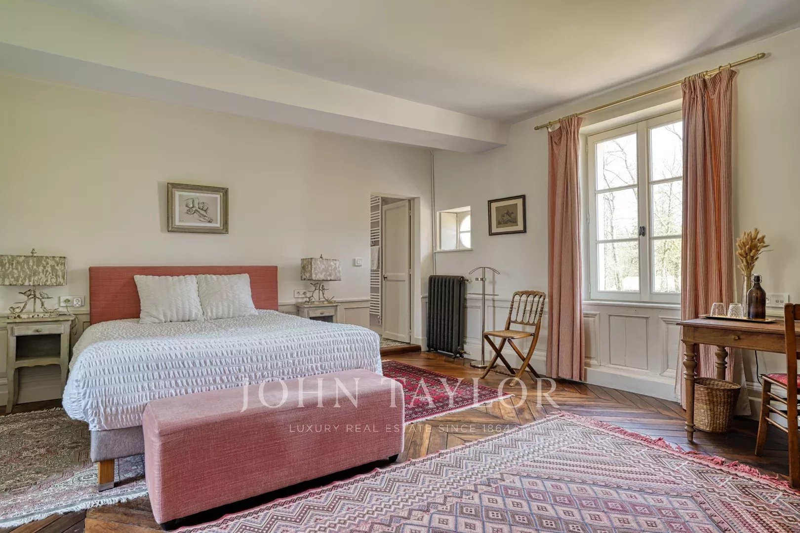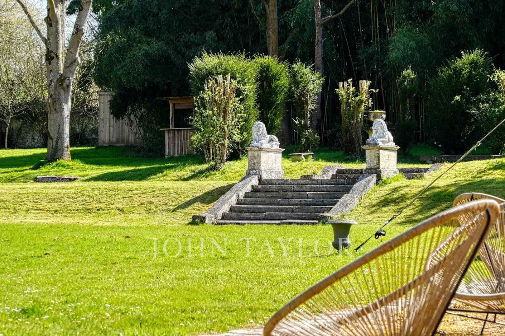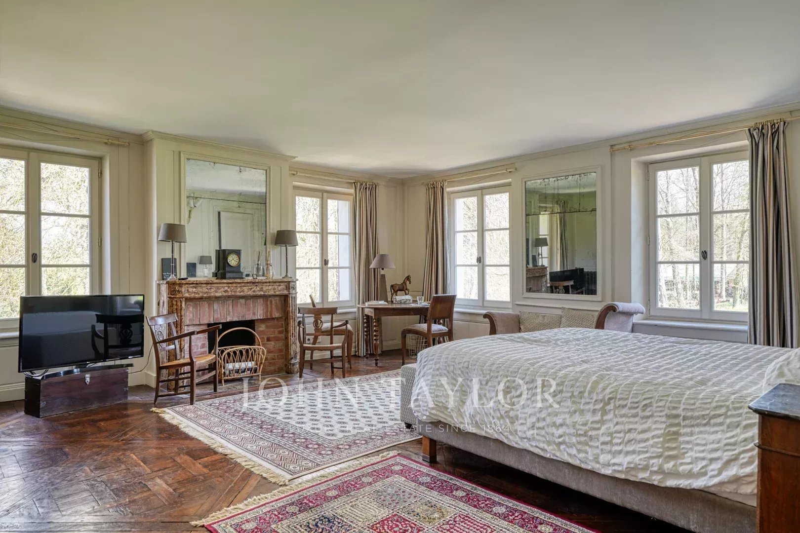À l’étage, de nombreuses chambres, toutes en suite, offrent une vue imprenable sur un parc d’exception aux arbres centenaires.