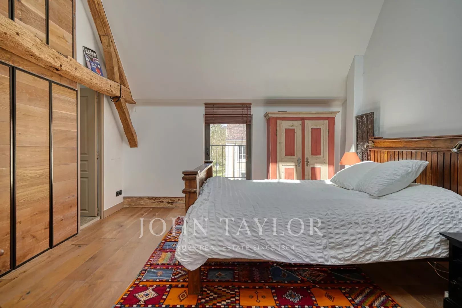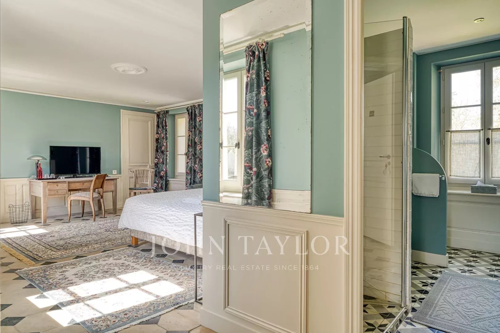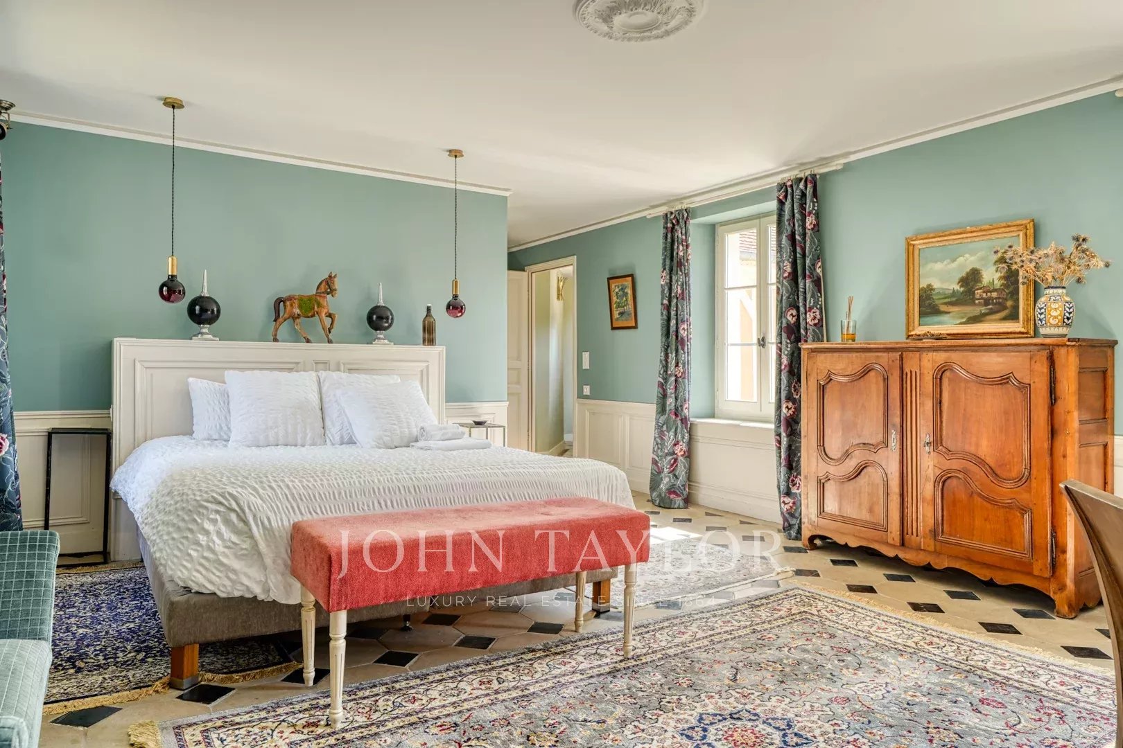À l’étage, de nombreuses chambres, toutes en suite, offrent une vue imprenable sur un parc d’exception aux arbres centenaires.