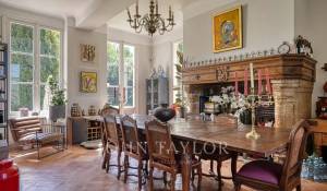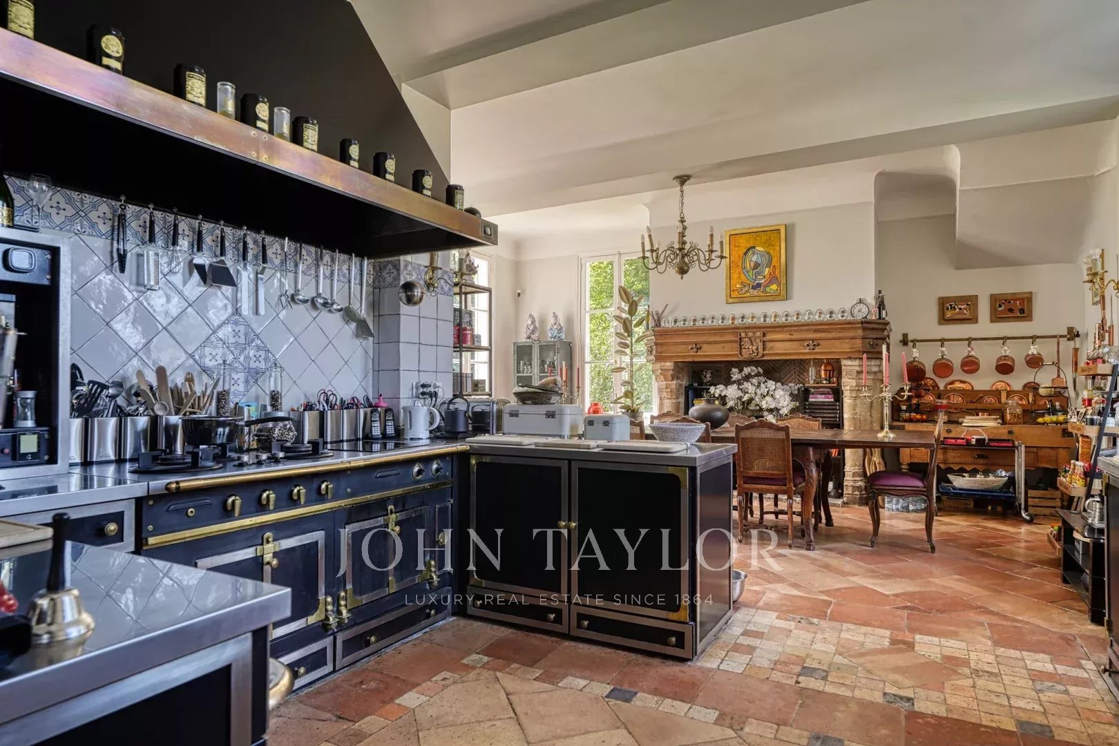 La vaste cuisine, véritable cœur vivant de la maison, séduit par son atmosphère familiale ; sa magnifique cheminée monumentale, son piano de cuisine de luxe La Cornue, rare et en parfait état de marche, lui confèrent caractère et authenticité.