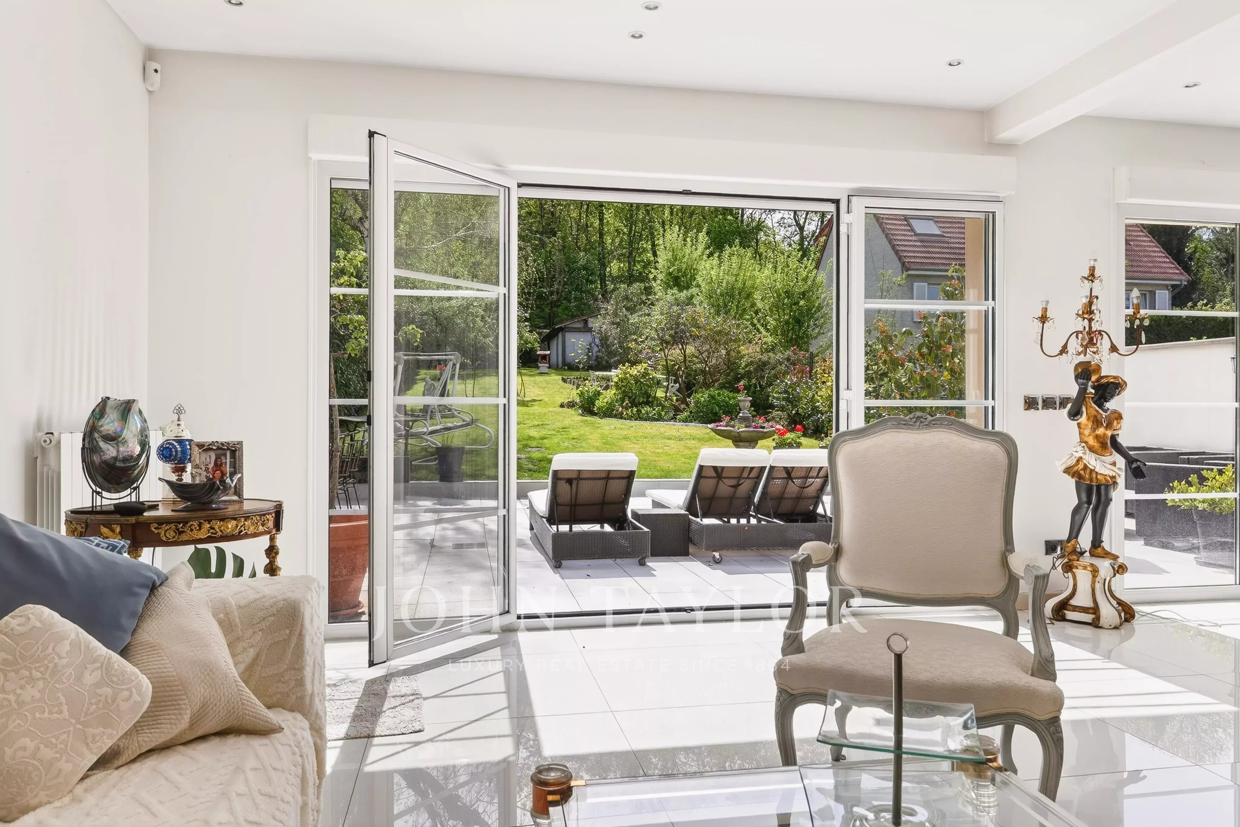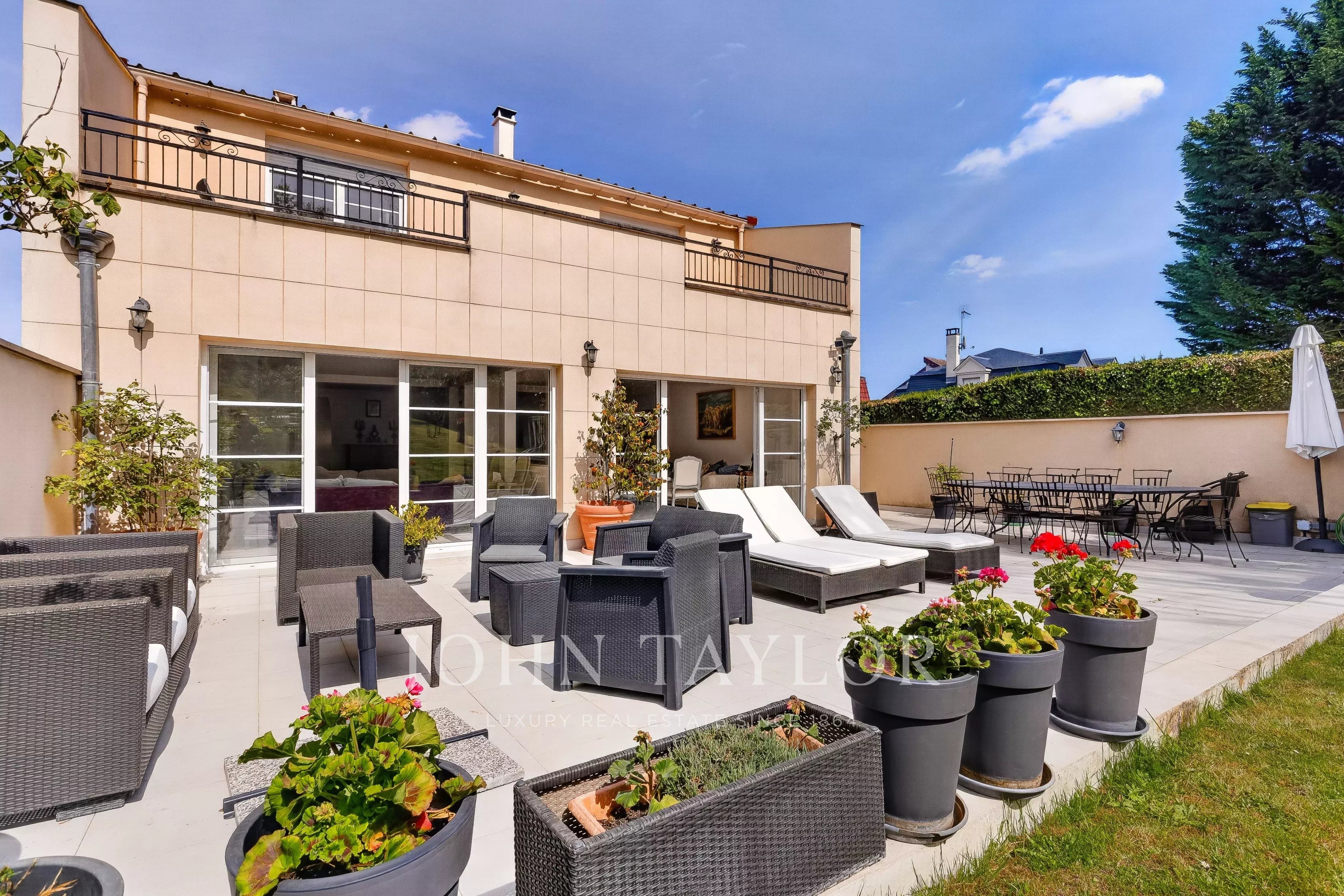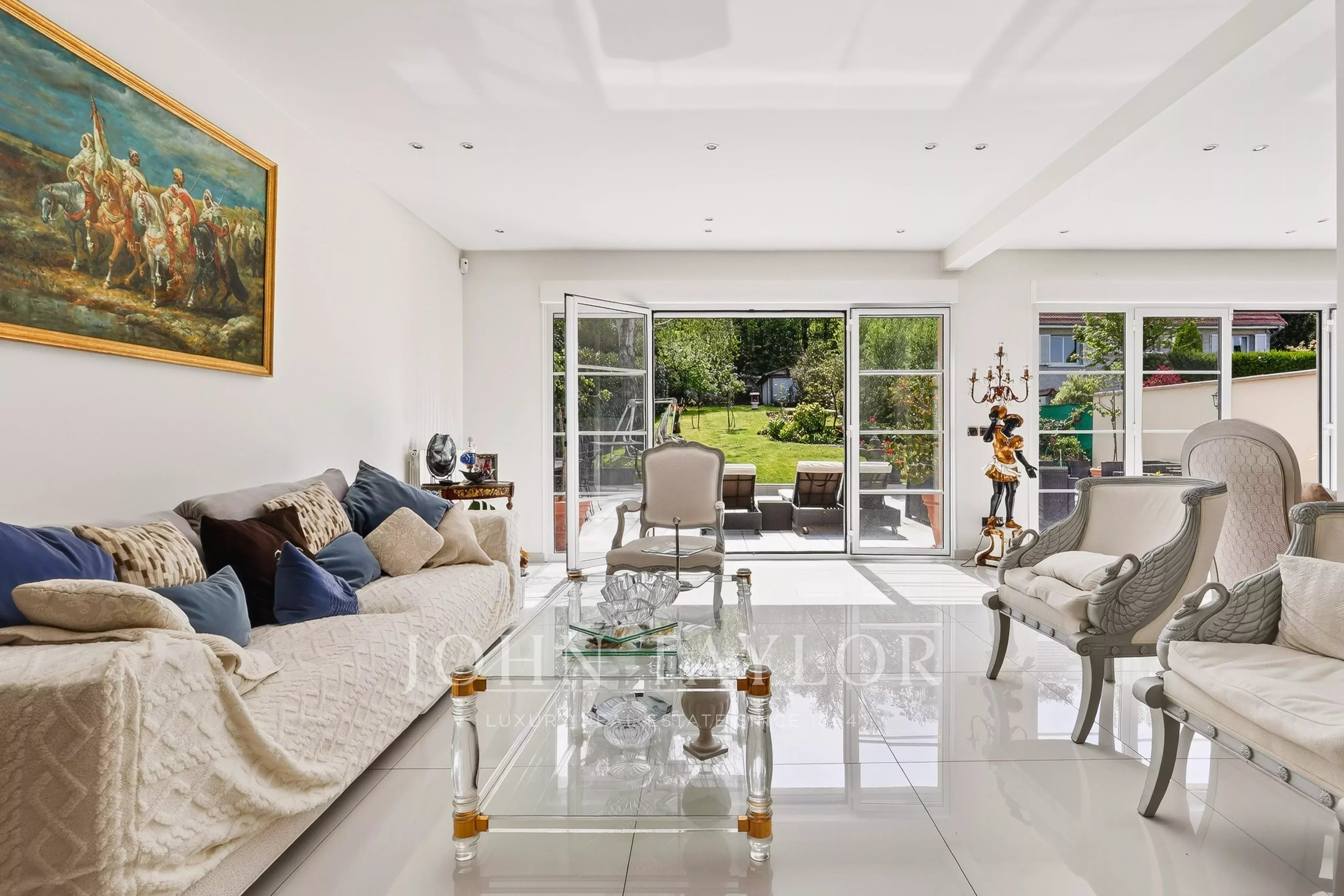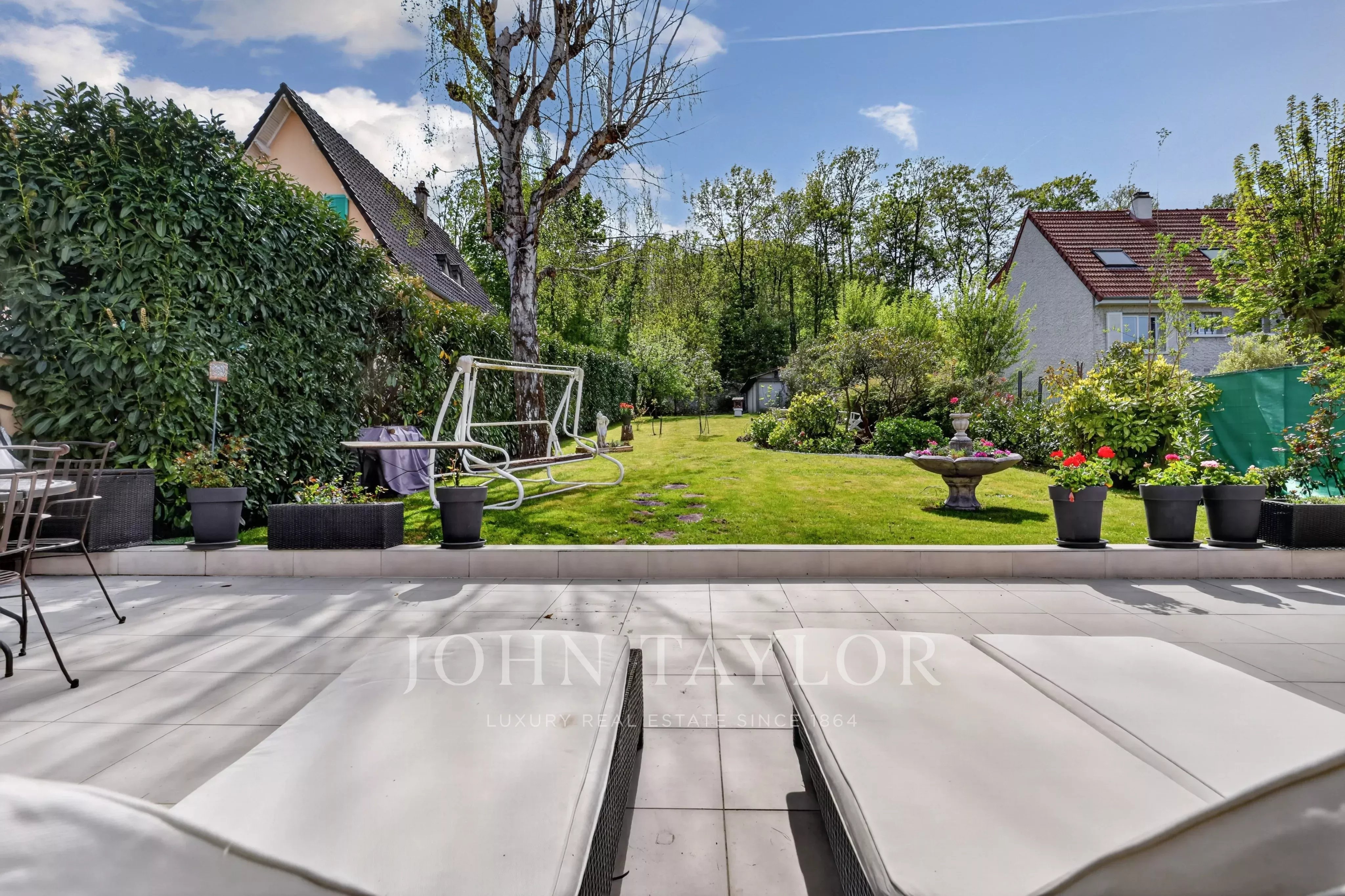 Sur les hauteurs de Rueil-Malmaison, en lisière immédiate de la forêt domaniale et à proximité des meilleurs établissements scolaires du secteur, cette élégante maison familiale développe environ 400 m² au cœur d’un terrain paysager de plus de 1 000 m².