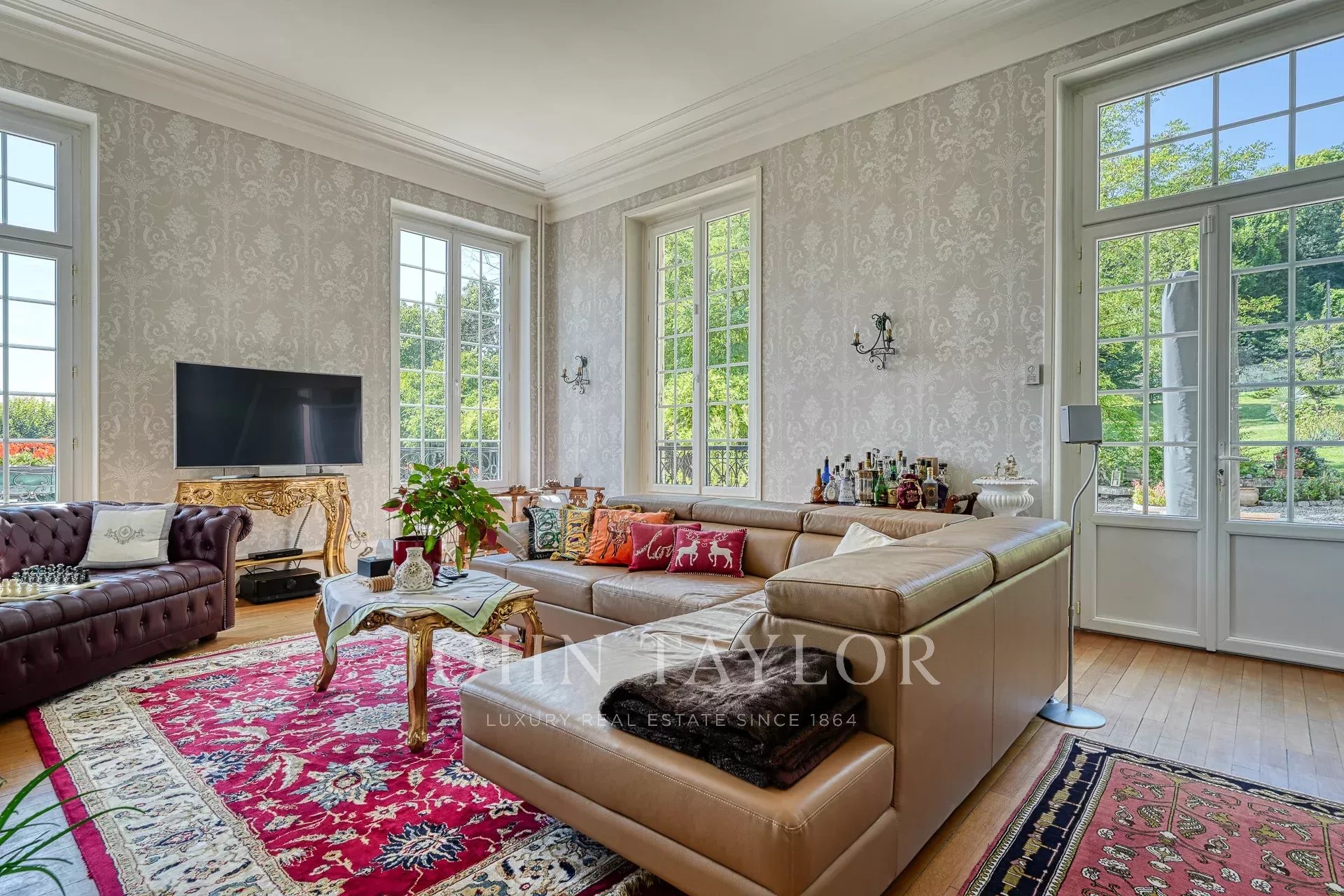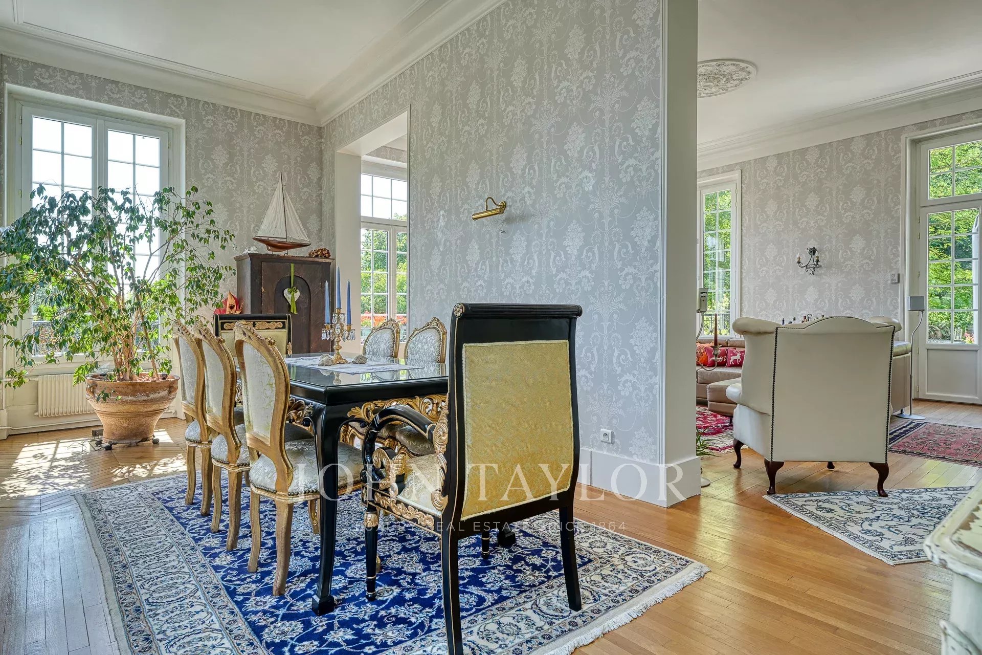 À deux pas des rives de l'Oise, dans une rue prisée proche du centre-ville de L'Isle-Adam, découvrez cette élégante maison de maître de 406 m². Nichée sur un magnifique parc arboré de 6412 m², cette demeure, aménagée sur 4 niveaux, vous accueille dès son entrée par une cour charmante.