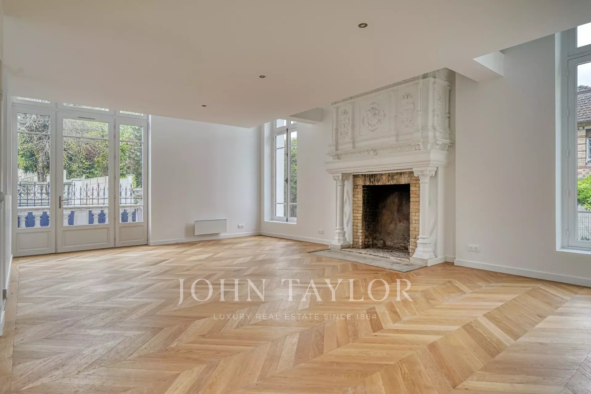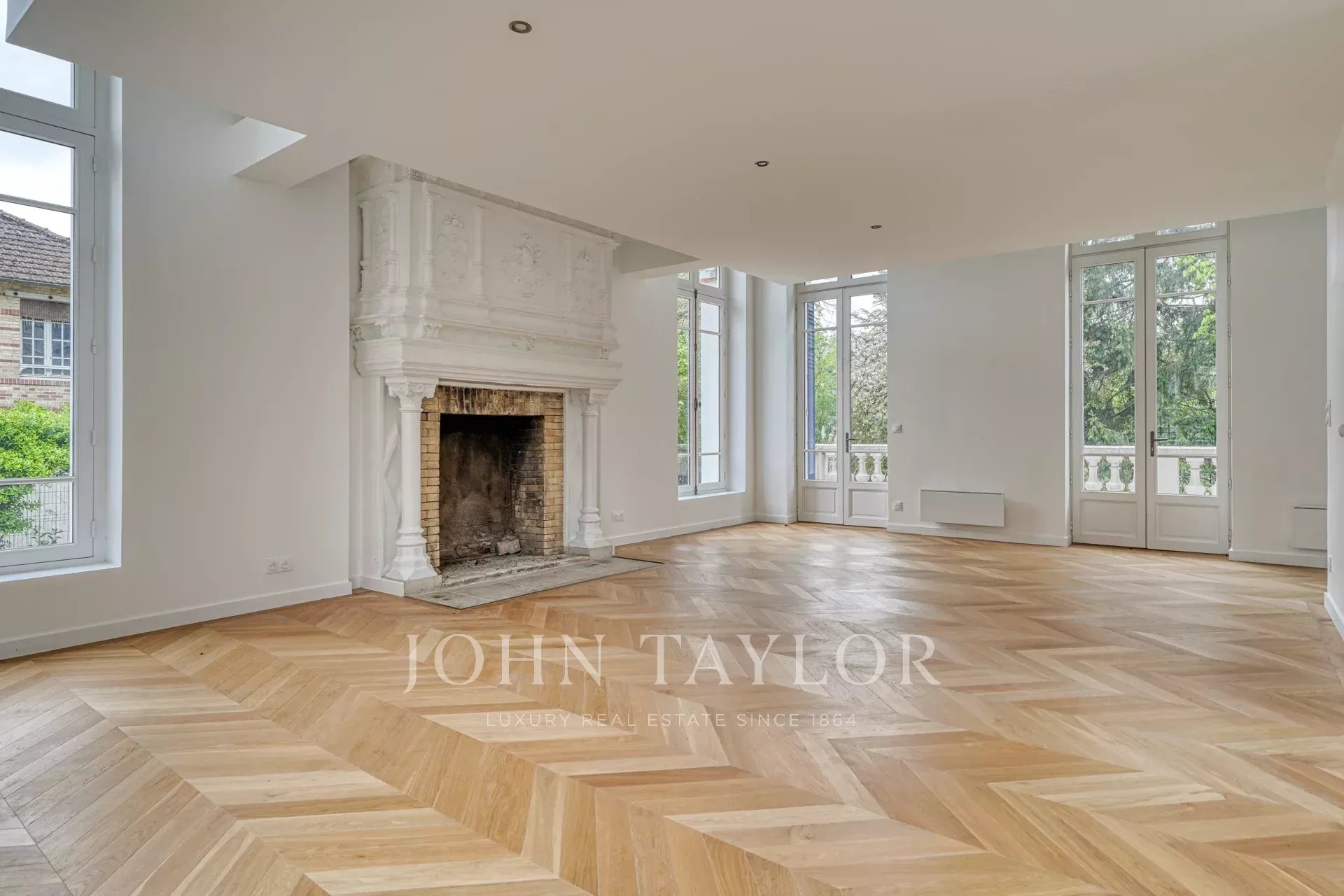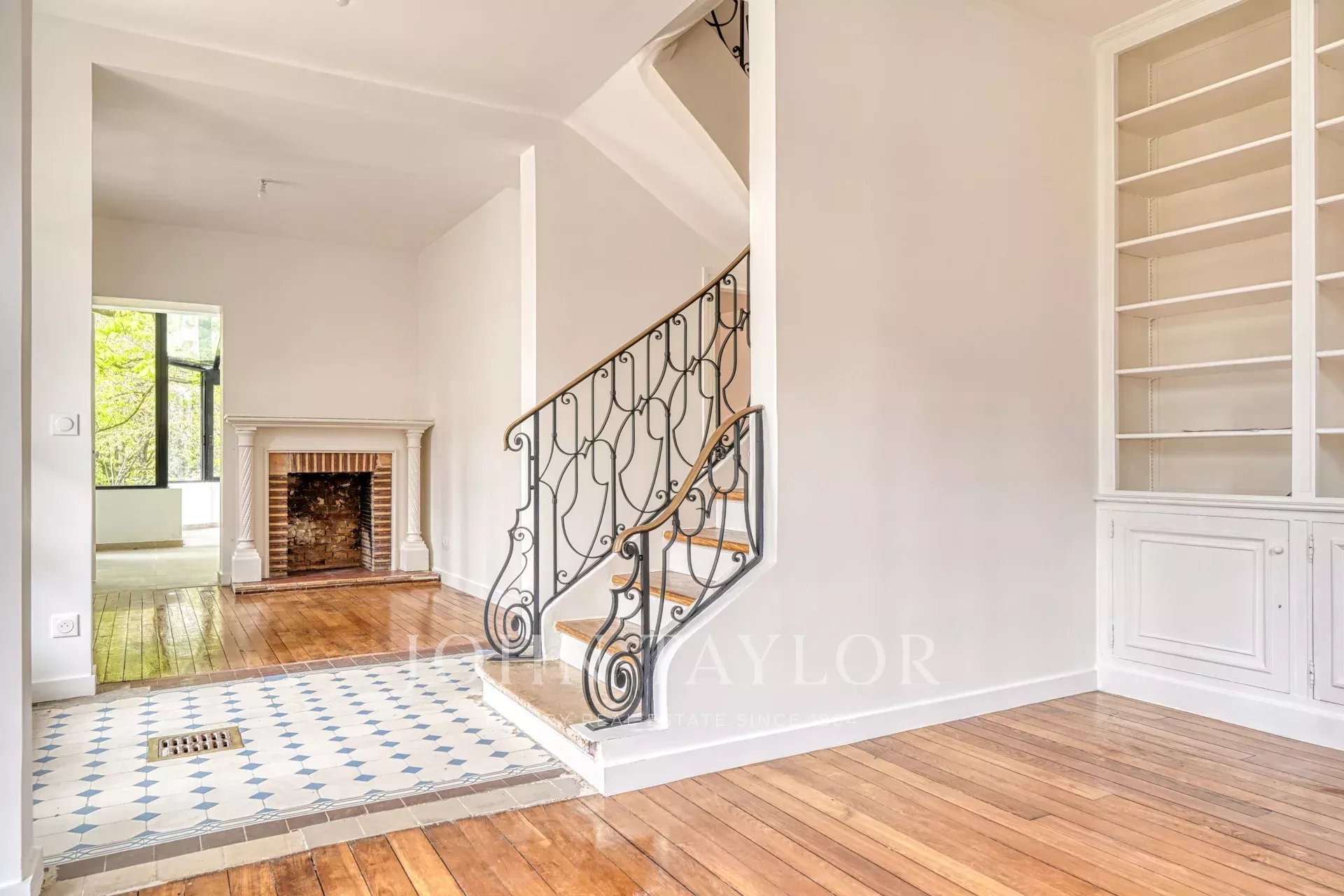 La maison offre environ 427 m² habitables ainsi que 94 m² de caves. Le rez-de-chaussée s’organise autour d’une remarquable salle de réception semi-circulaire desservie par un double accès. Elle s’ouvre sur un vaste séjour traversant prolongé par une terrasse offrant une vue dégagée sur la Marne, structuré par une cheminée monumentale. Une cuisine sous verrière ainsi qu’un espace bibliothèque complètent ce niveau.