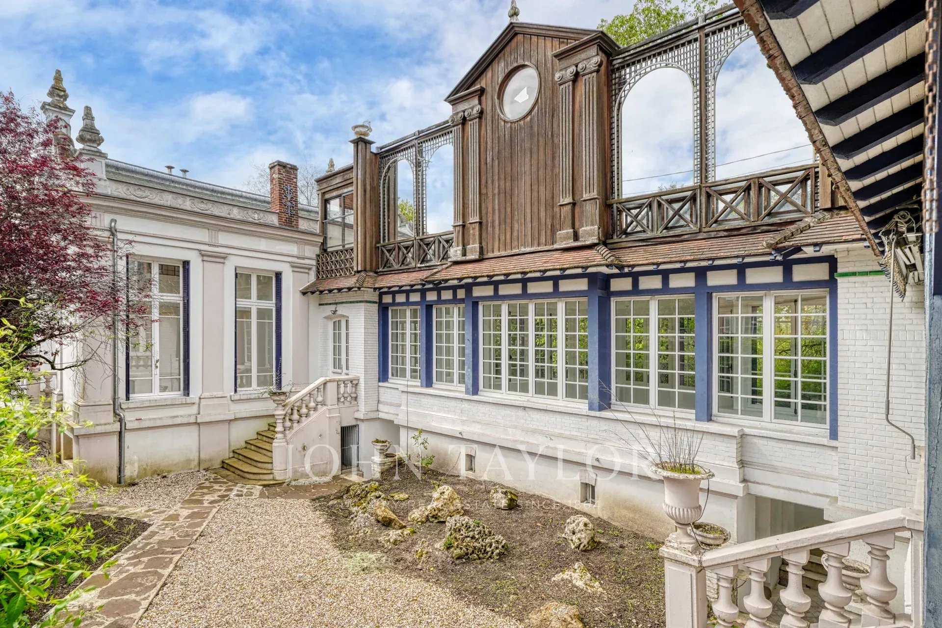 Ancienne dépendance du château des Rets, cette demeure de caractère présente une architecture singulière mêlant inspiration néo-classique et influences anglo-normandes. Son identité architecturale, atypique et immédiatement reconnaissable, en fait une véritable signature immobilière. La propriété a fait l’objet d’une restauration complète qui a su préserver son caractère.