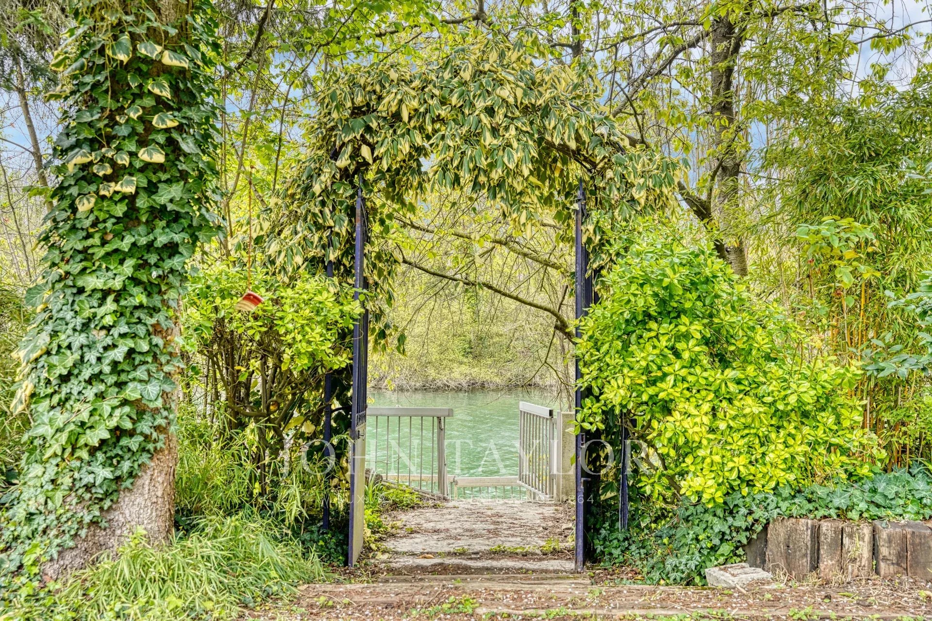 À l’extérieur, le jardin paysager s’étend jusqu’à la Marne et accompagne naturellement la propriété. En contrebas, un ponton privé permet un accès direct à la rivière.