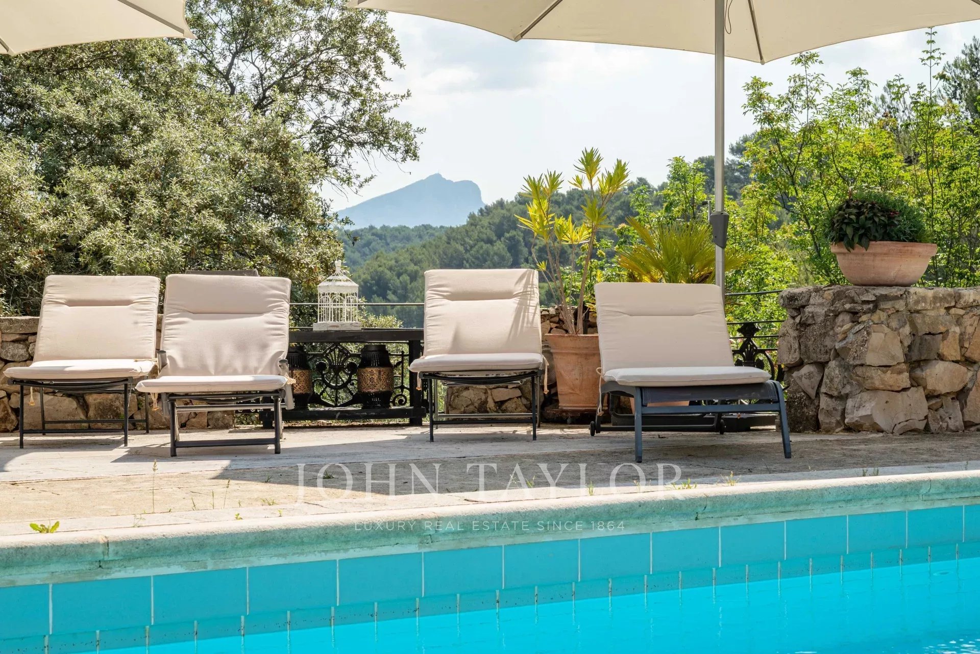 Piscine chauffée (9X5m) avec barbecue extérieur et salle d'eau entourée d'une terrasse avec vue sur la Sainte Victoire. Magnifique terrain de 1,2 ha arboré avec ornements de jardin (statues, bassins, assises en pierre) Vue panoramique sur la Sainte Victoire et la campagne aixoise.