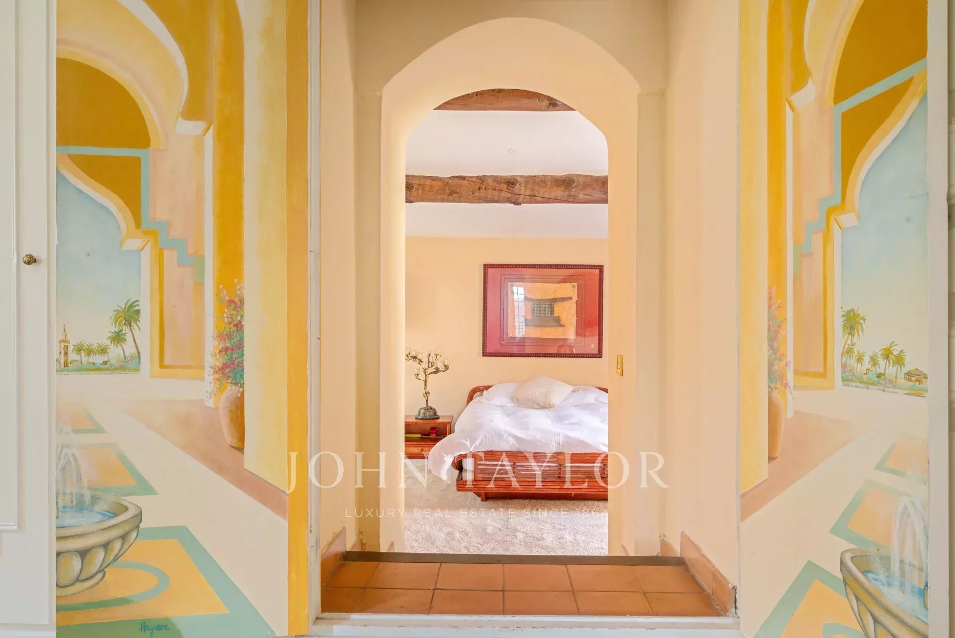 La terrasse principale dispose d'un bel espace pour se divertir ou tout simplement se détendre au soleil. Une terrasse d'angle intimiste agrémente l'entrée de la propriété par une grande fresque peinte de la campagne aixoise et d'une fontaine.