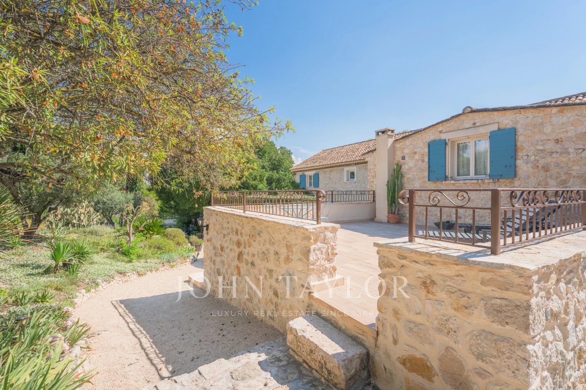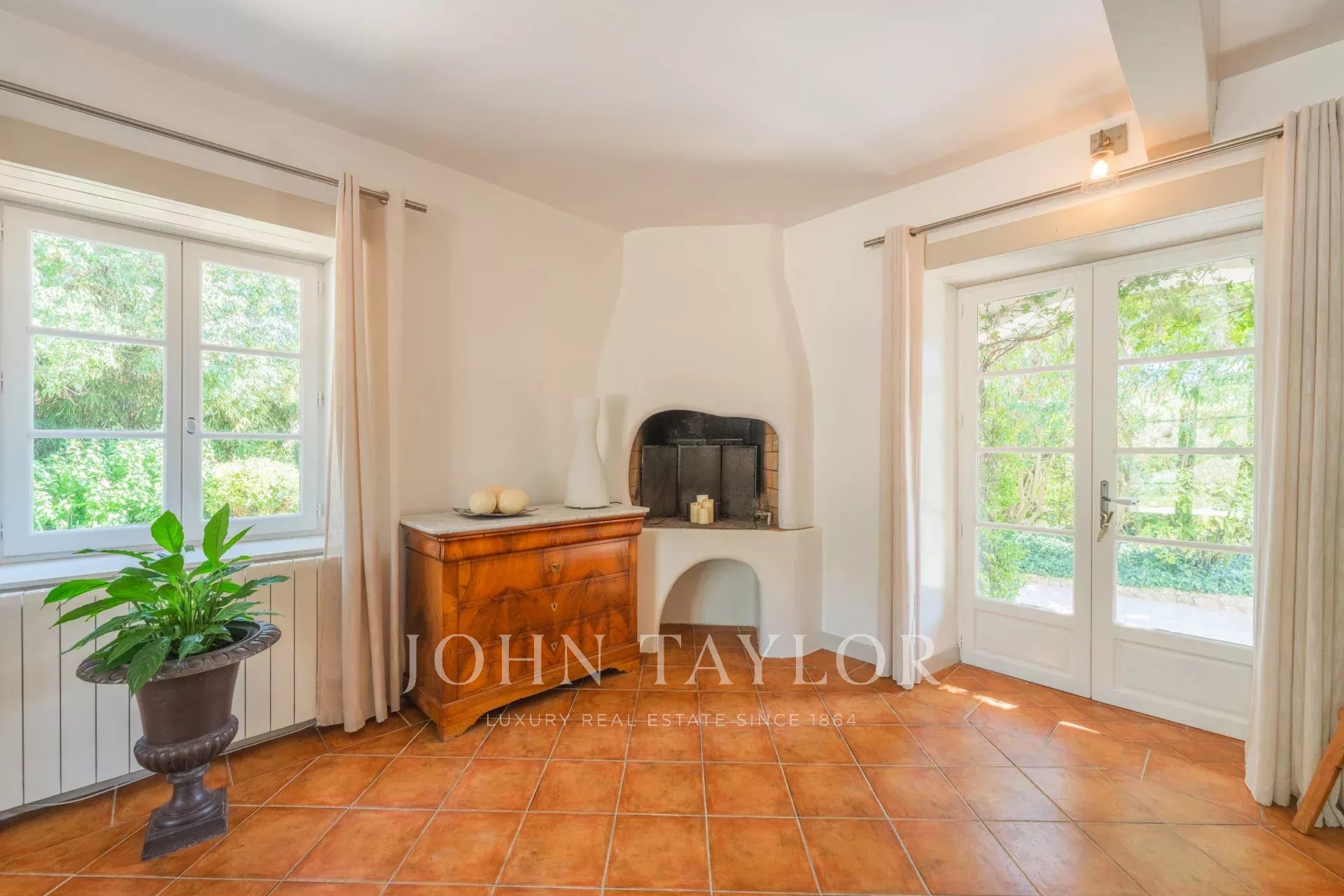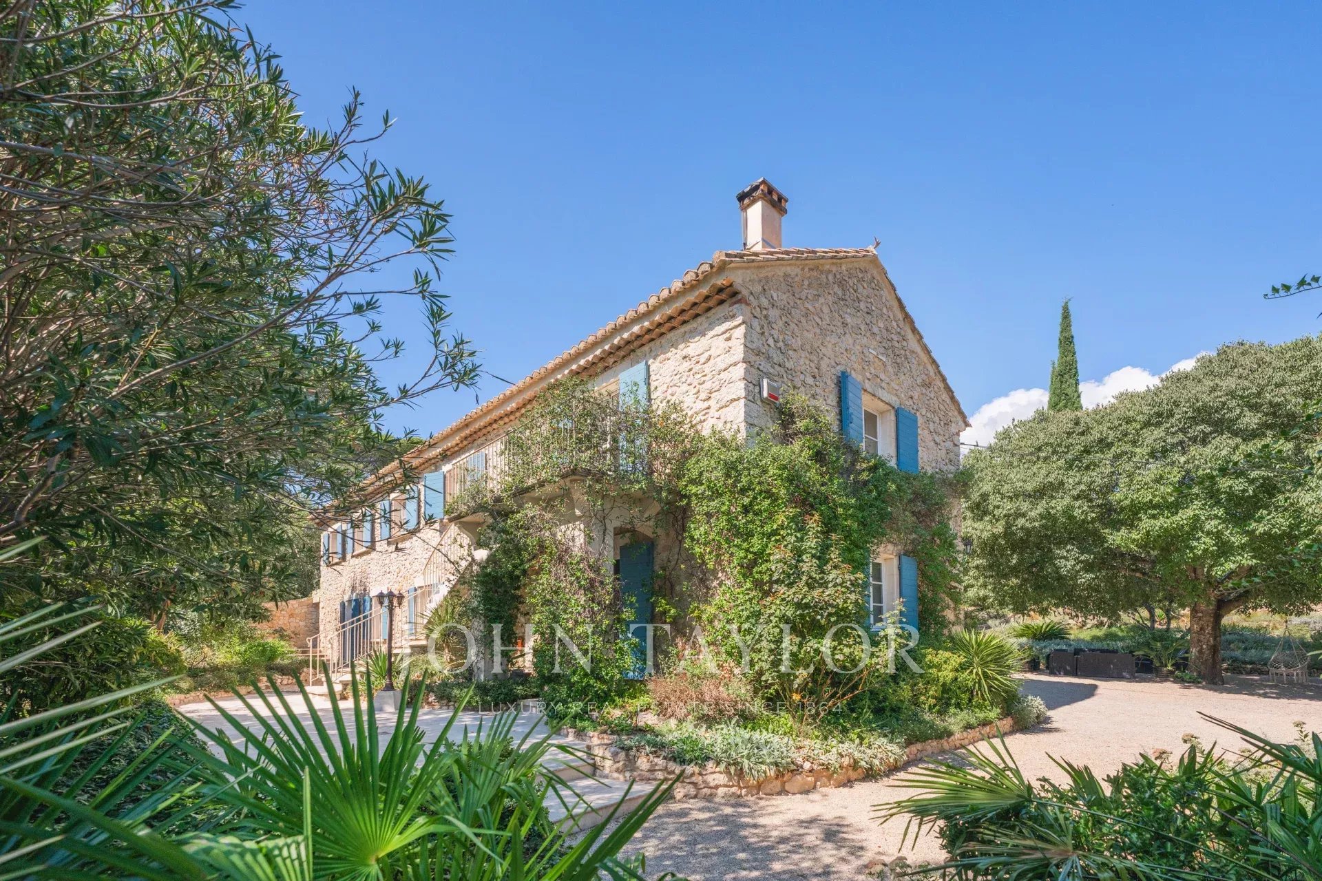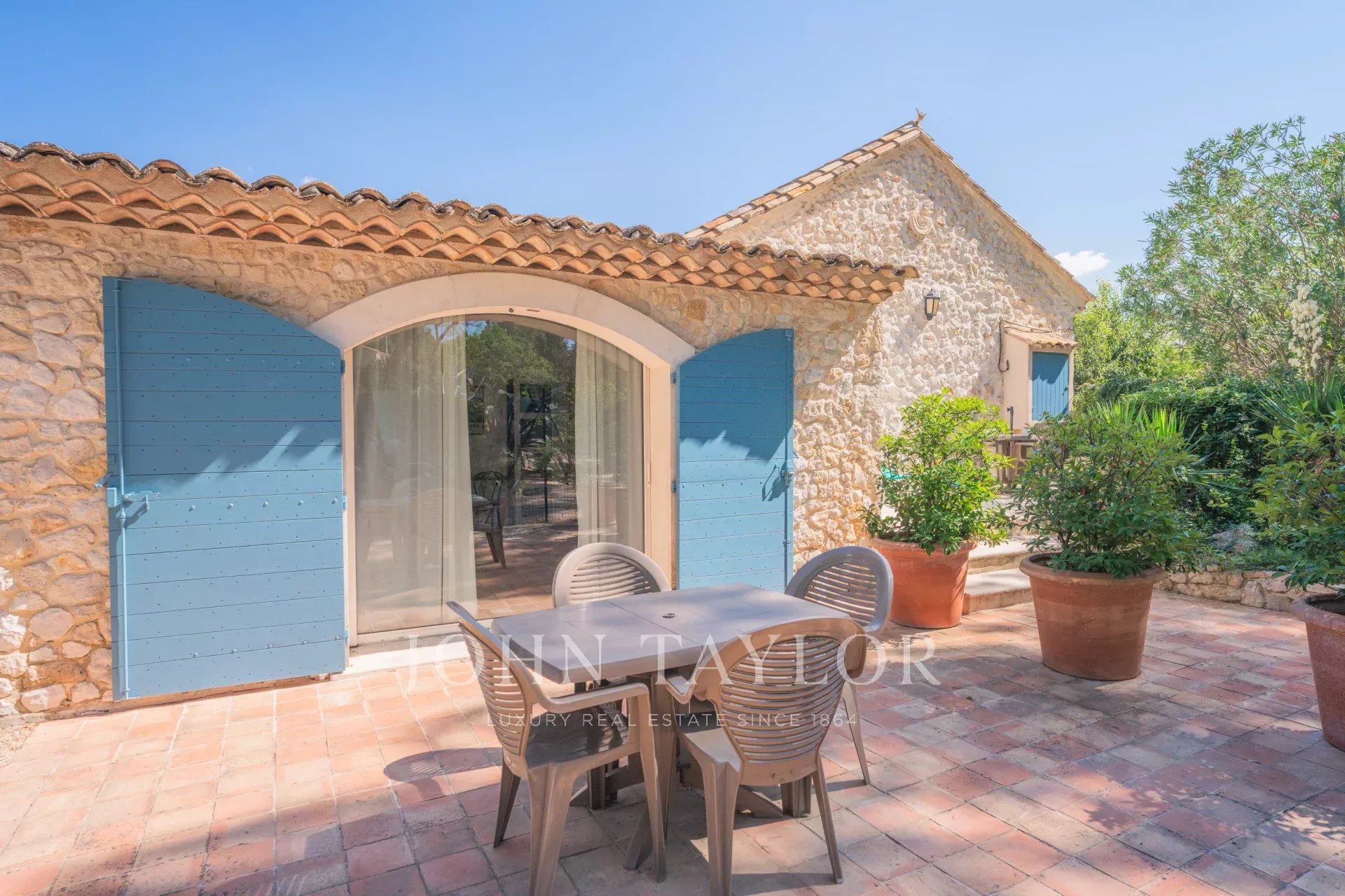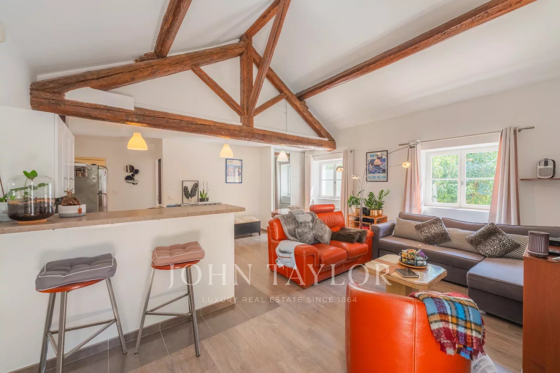 La propriété se compose d’une habitation principale de plain-pied d’environ 145 m², comprenant un salon intimiste, un vaste espace de vie avec cuisine ouverte et cheminée, deux chambres et une grande salle de bains. Toutes les pièces s’ouvrent sur des terrasses ombragées, invitant à la douceur de vivre provençale.