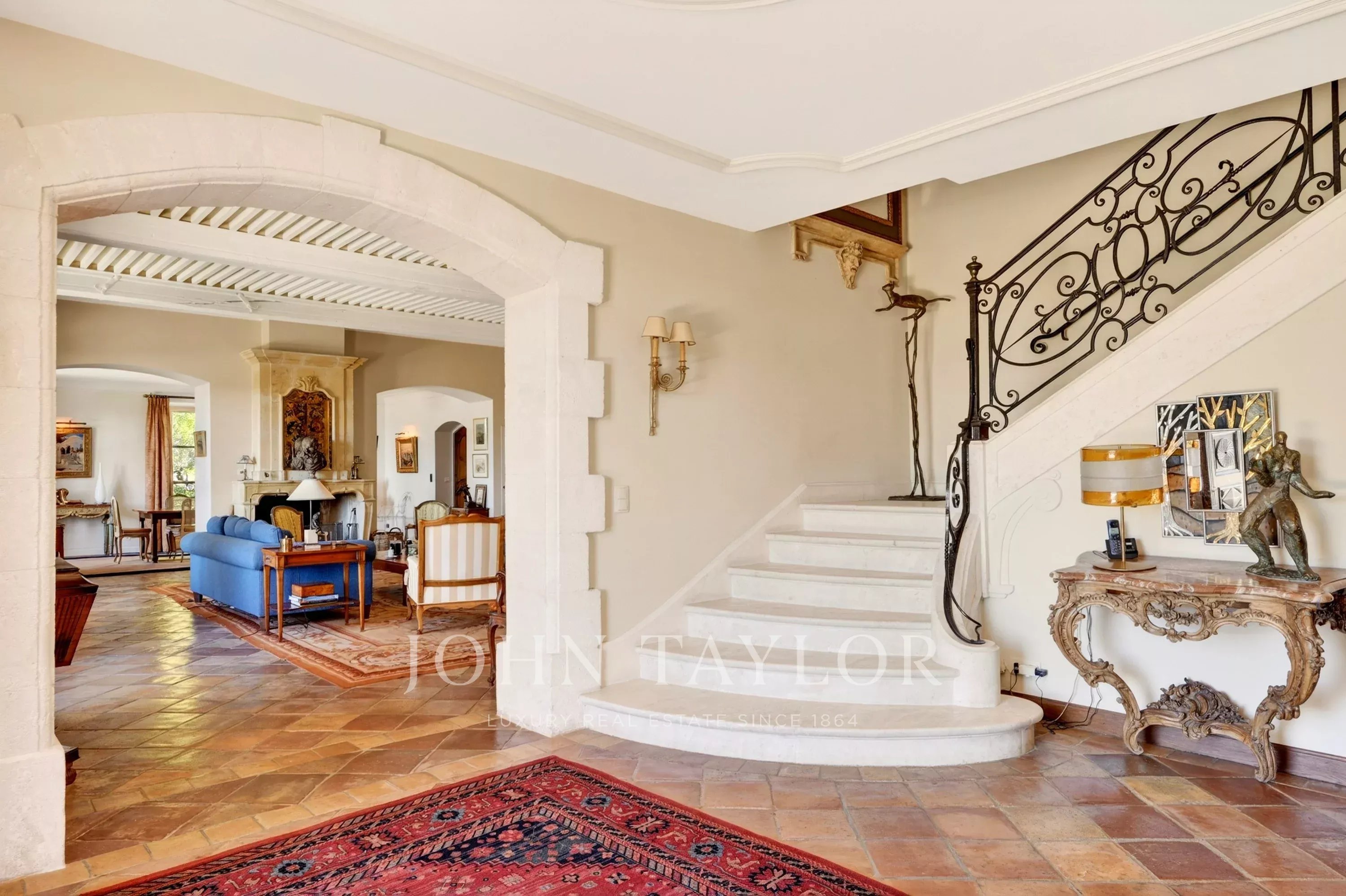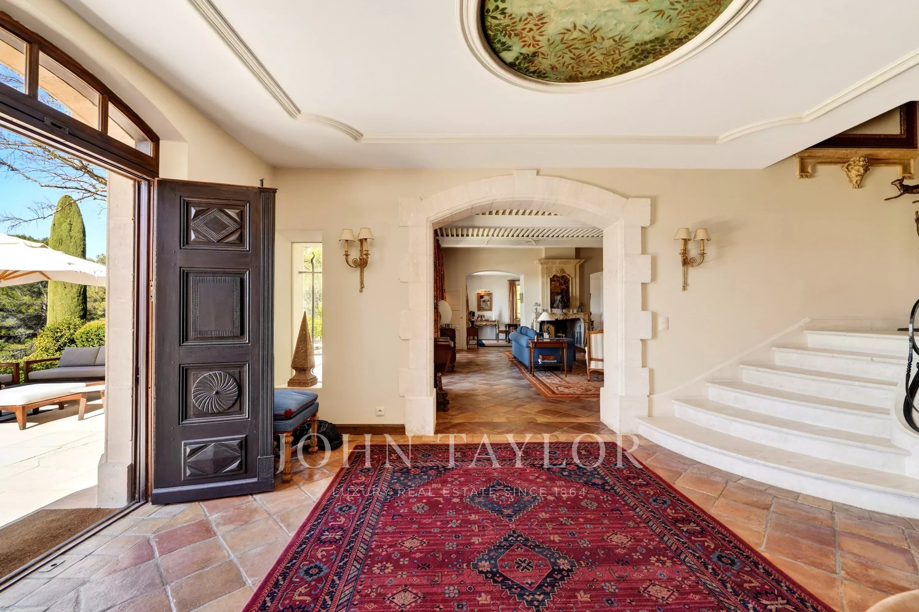 Édifiée sur un domaine de plus de 5 hectares, sublimé par une oliveraie de plus de 300 arbres, la demeure principale d’environ 500 m² offre des volumes remarquables baignés de lumière, ouverts sur de vastes terrasses avec une vue dominante sur la campagne aixoise.