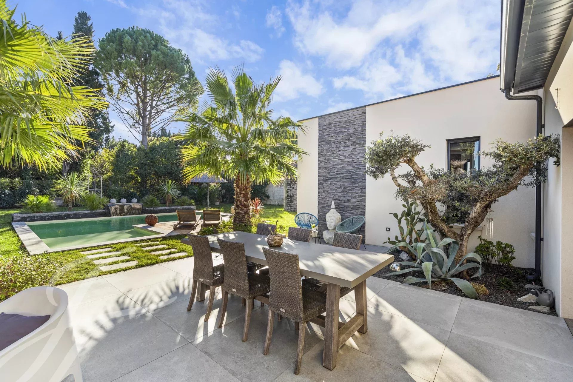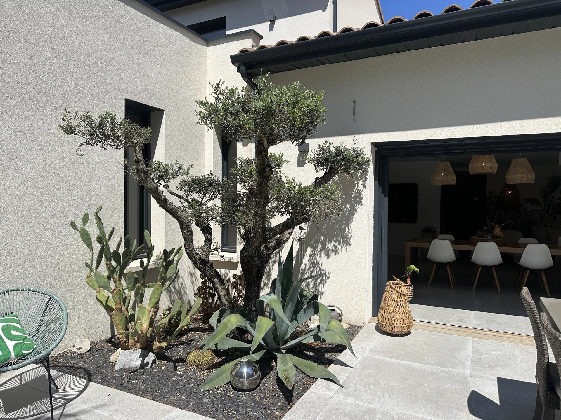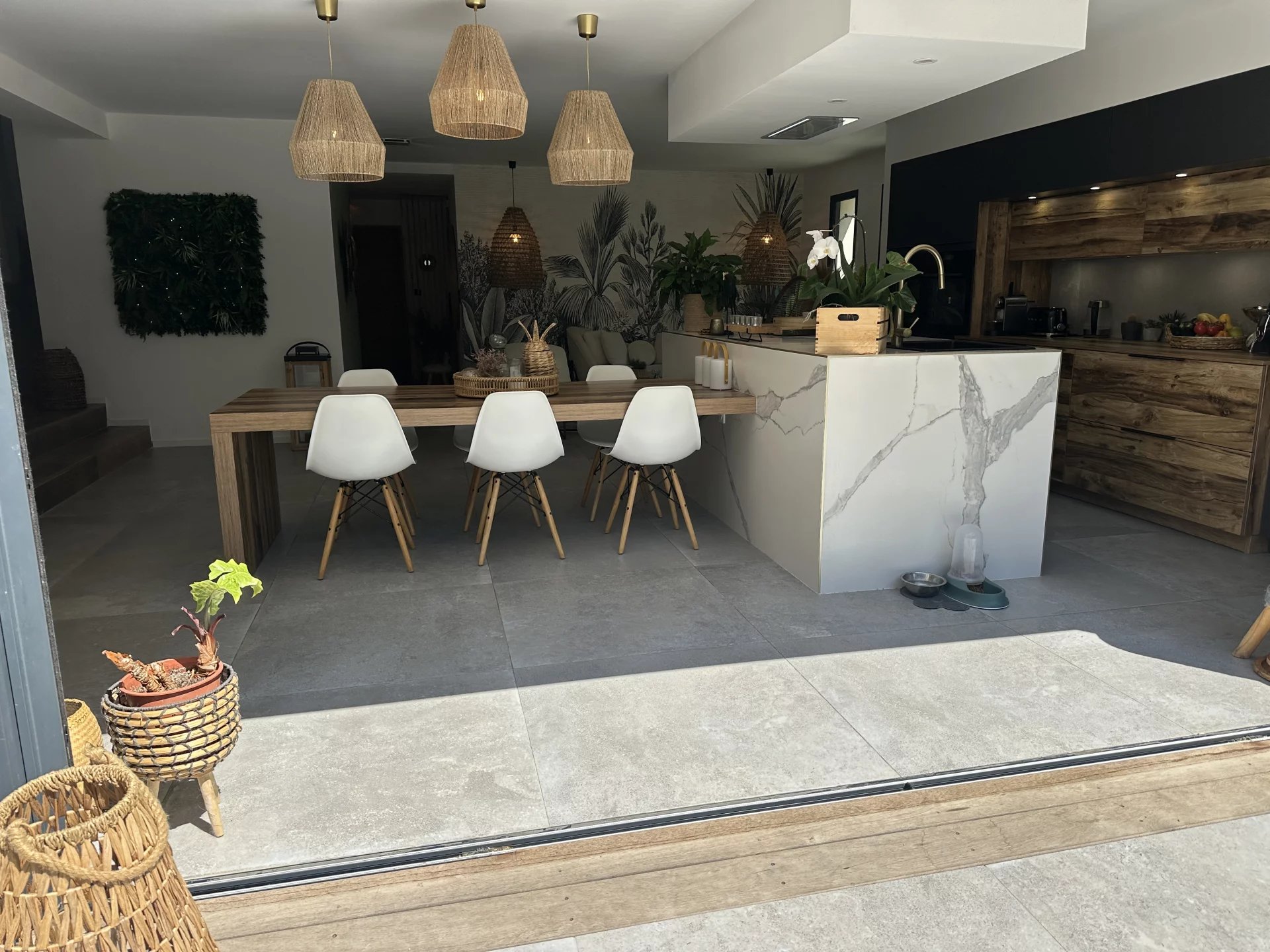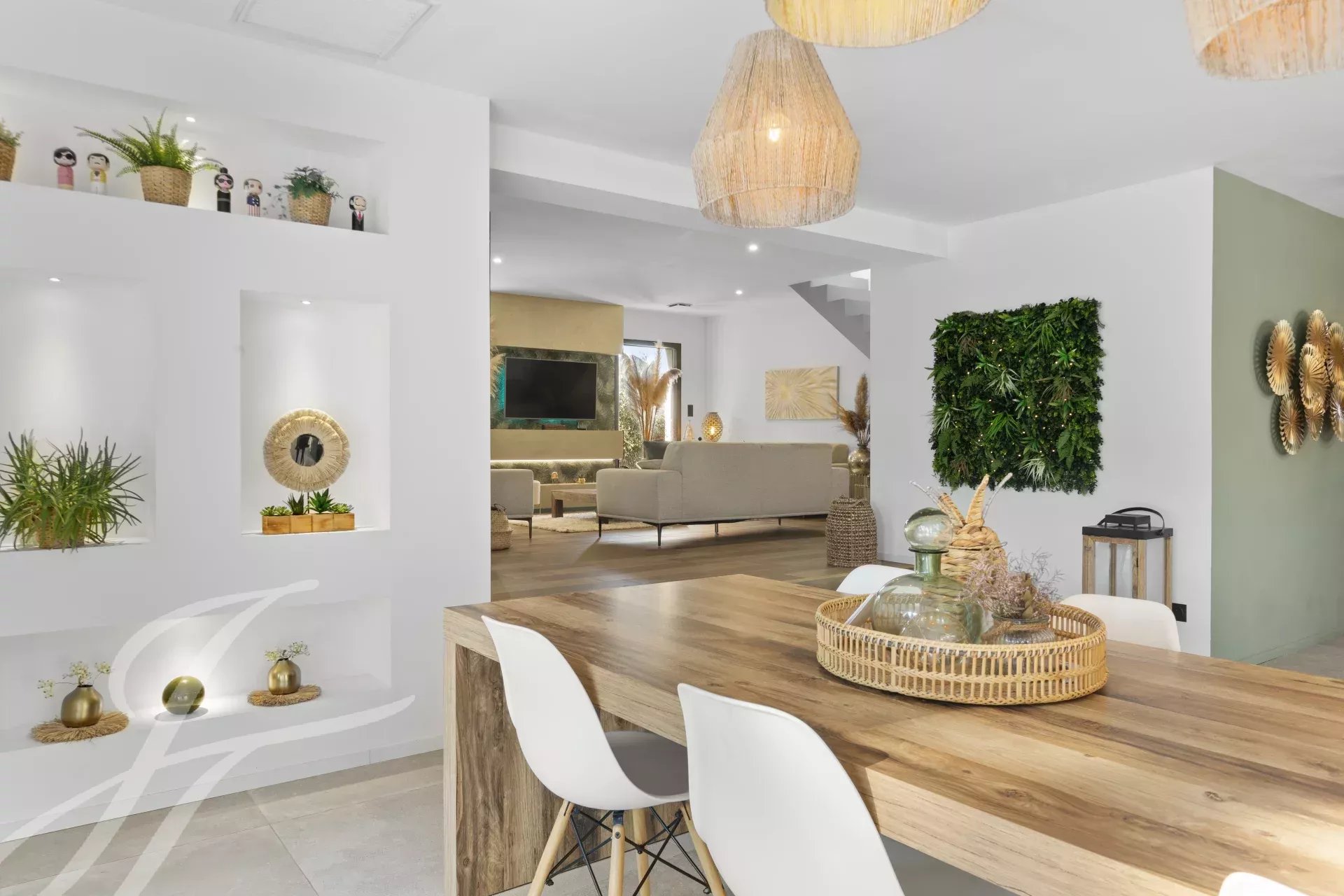 Au rez-de-chaussée on dispose d'une entrée, vaste salon/salle à manger avec cuisine américaine équipée ouvrant sur une terrasse dallée de 60 m², buanderie, toilettes invités, second salon, et deux chambres partageant une salle d’eau avec WC.