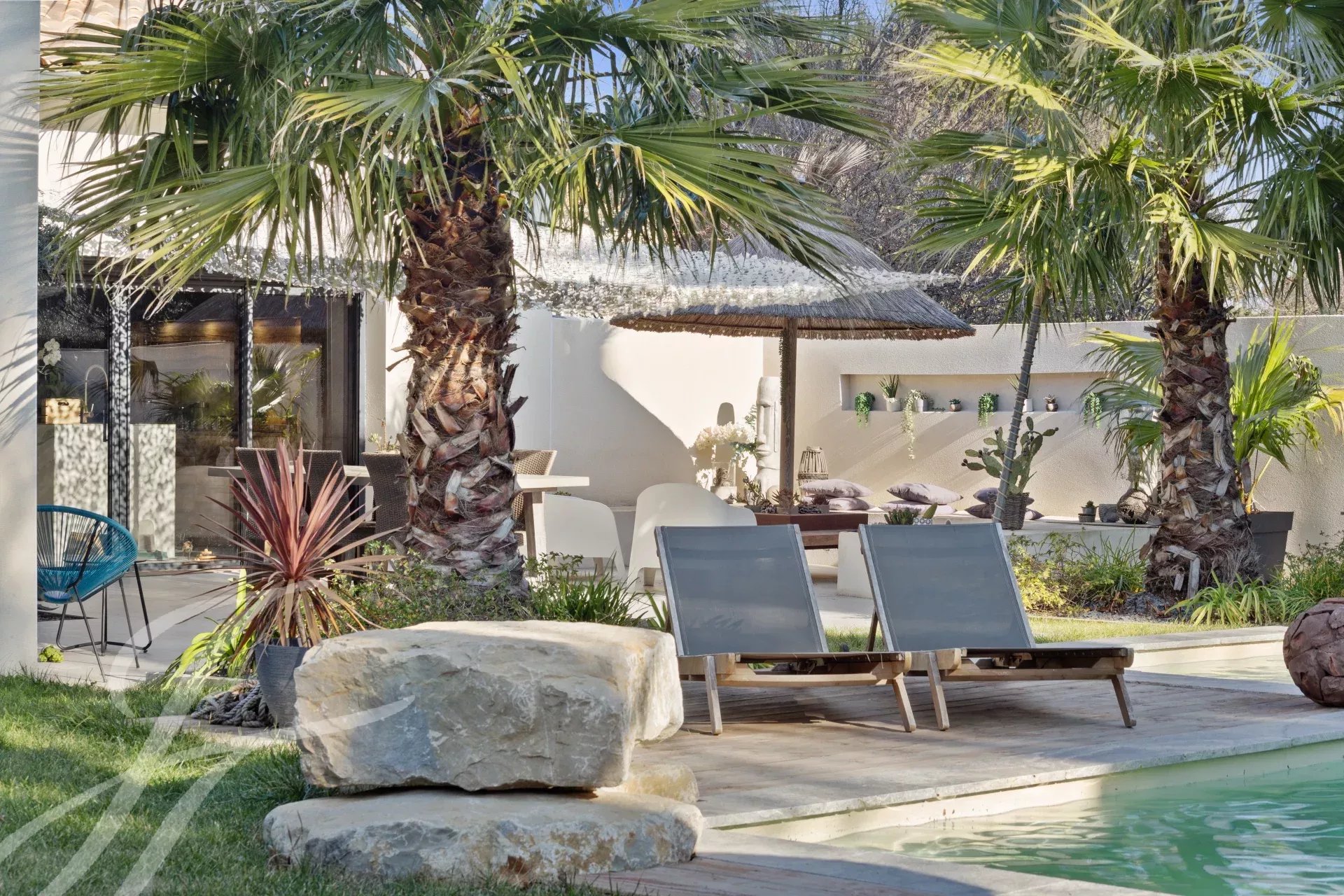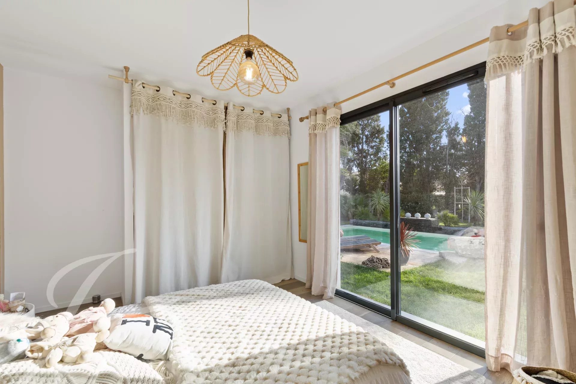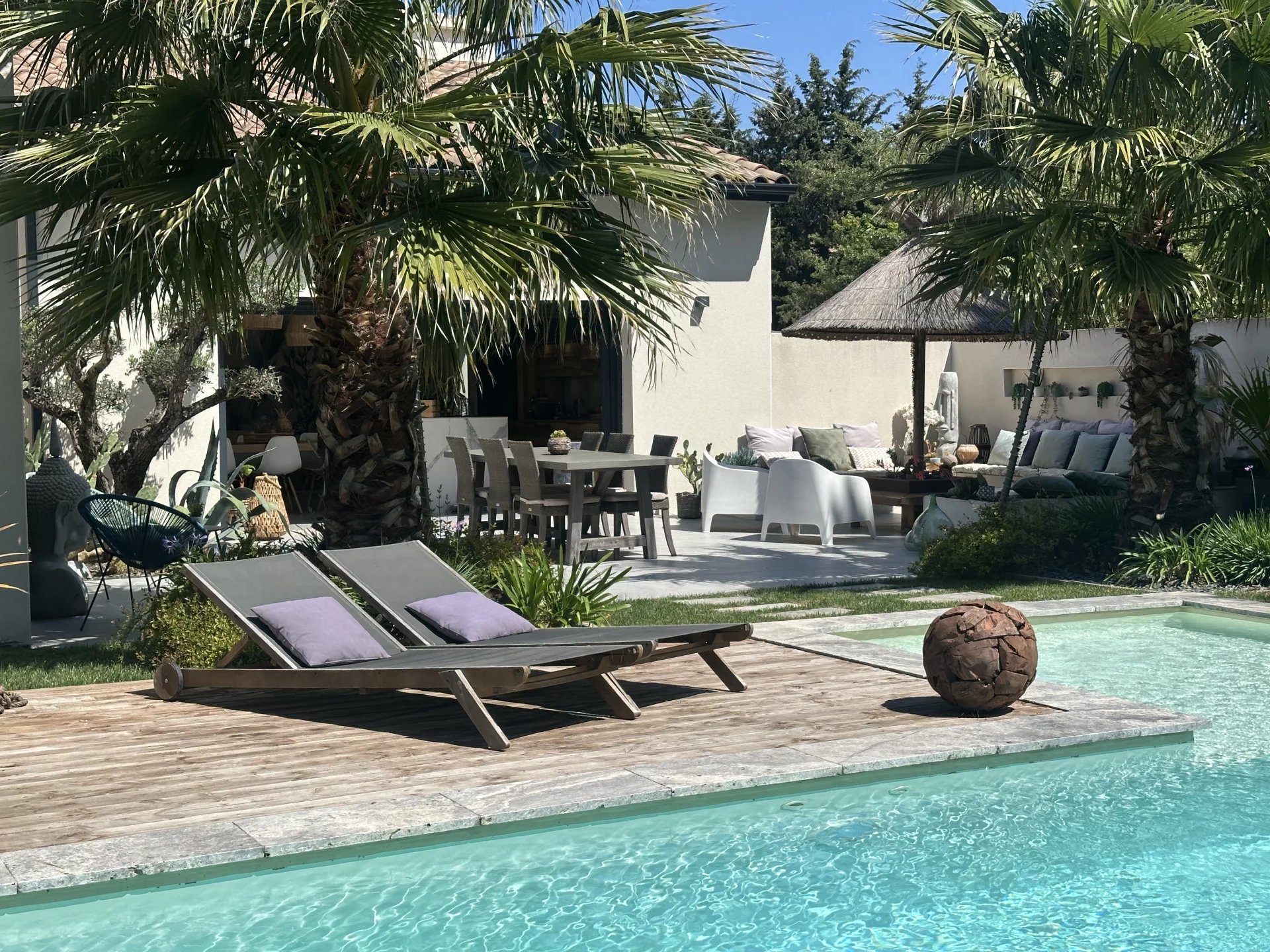 Au rez-de-chaussée on dispose d'une entrée, vaste salon/salle à manger avec cuisine américaine équipée ouvrant sur une terrasse dallée de 60 m², buanderie, toilettes invités, second salon, et deux chambres partageant une salle d’eau avec WC.