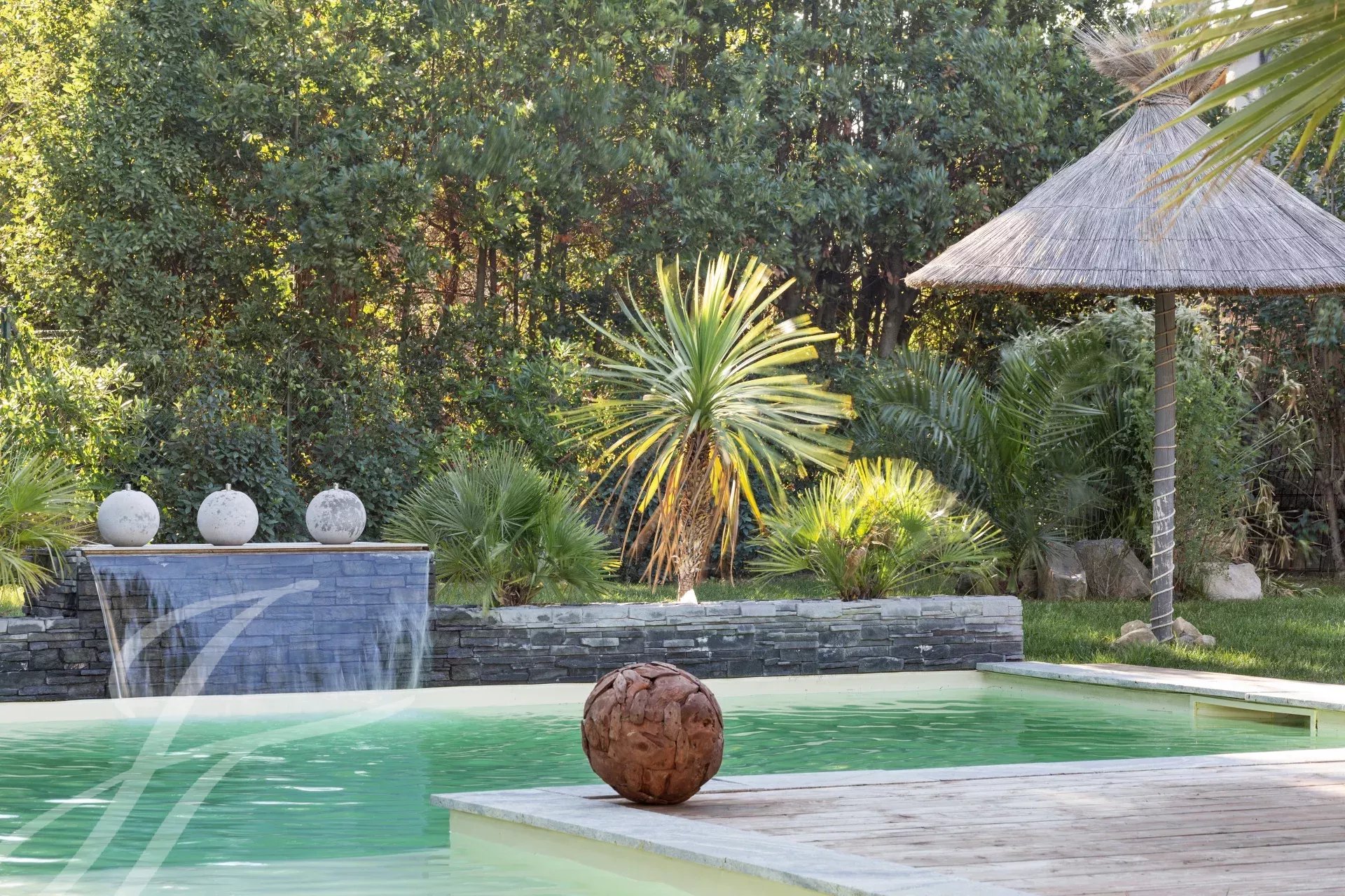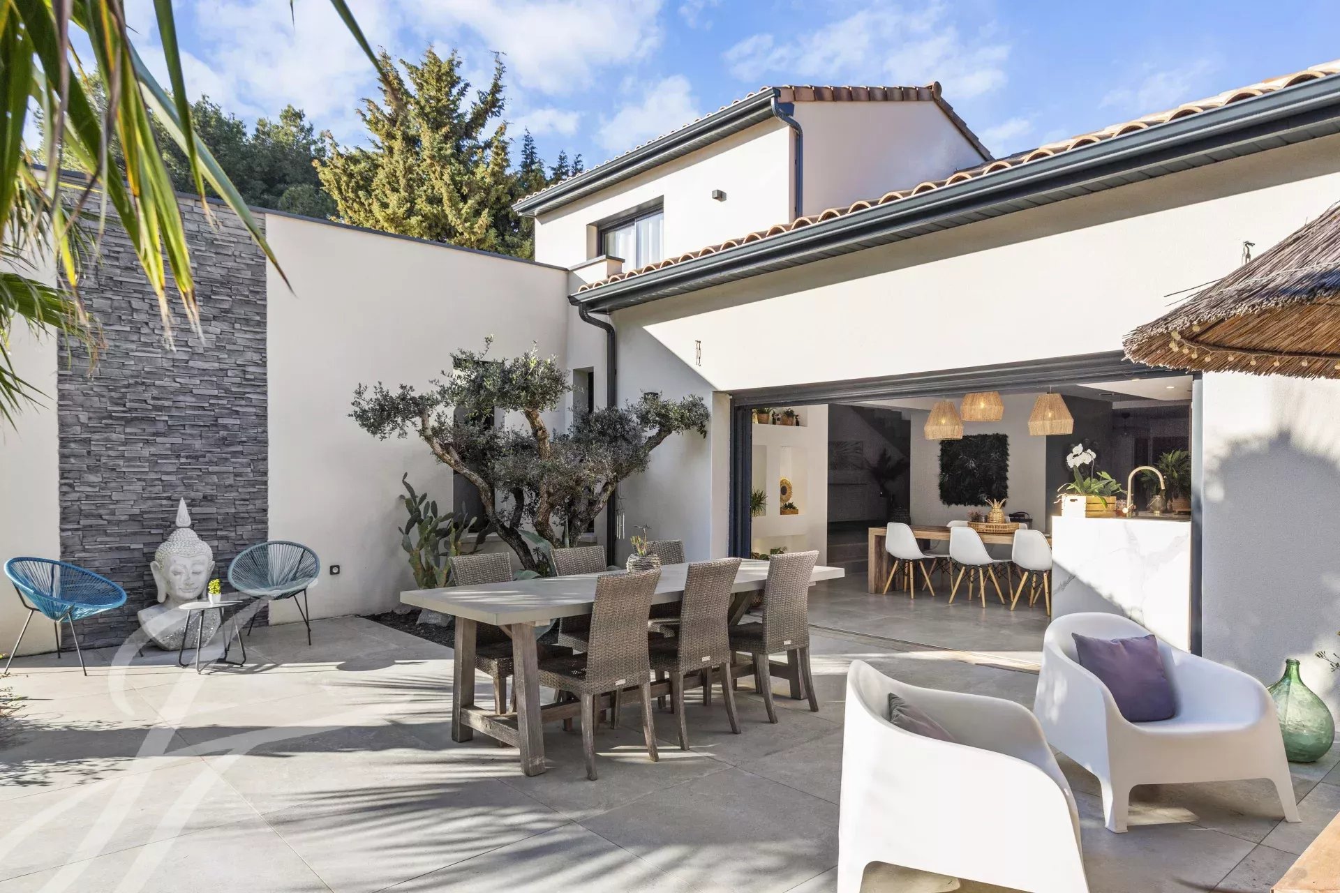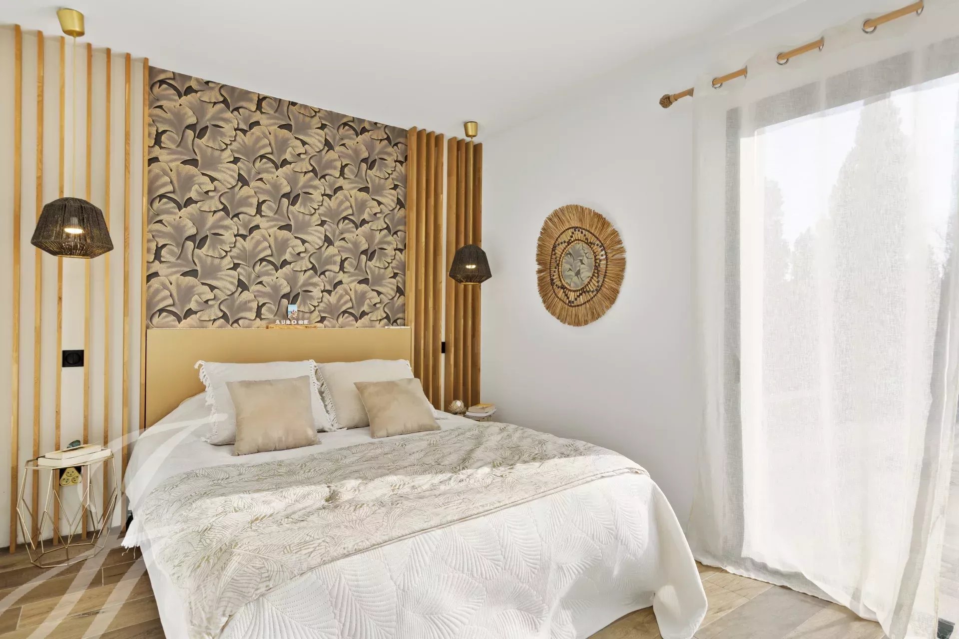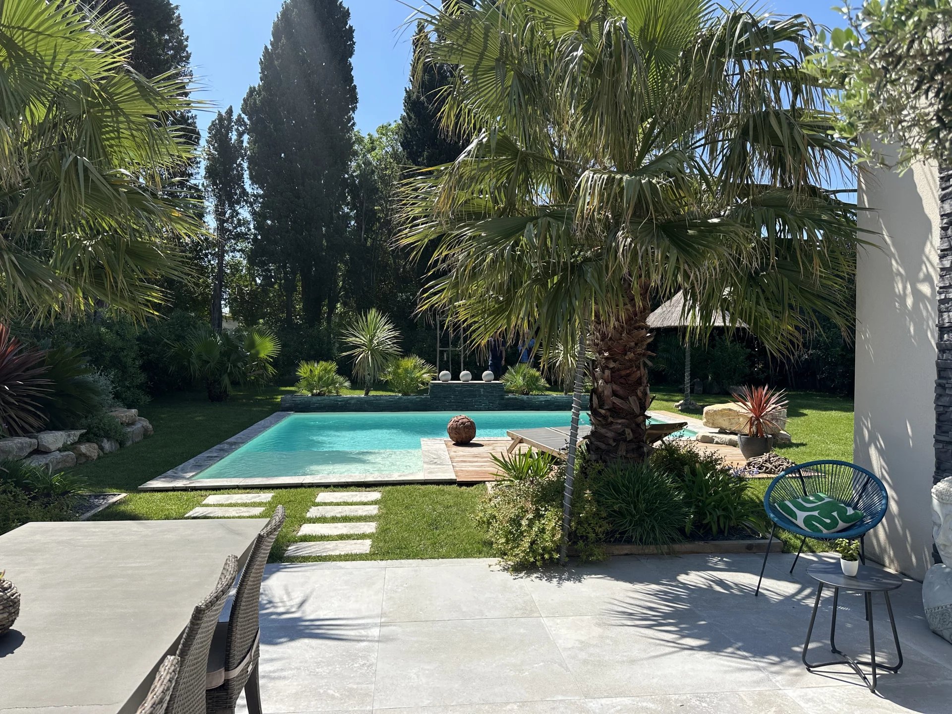 Au rez-de-chaussée on dispose d'une entrée, vaste salon/salle à manger avec cuisine américaine équipée ouvrant sur une terrasse dallée de 60 m², buanderie, toilettes invités, second salon, et deux chambres partageant une salle d’eau avec WC.