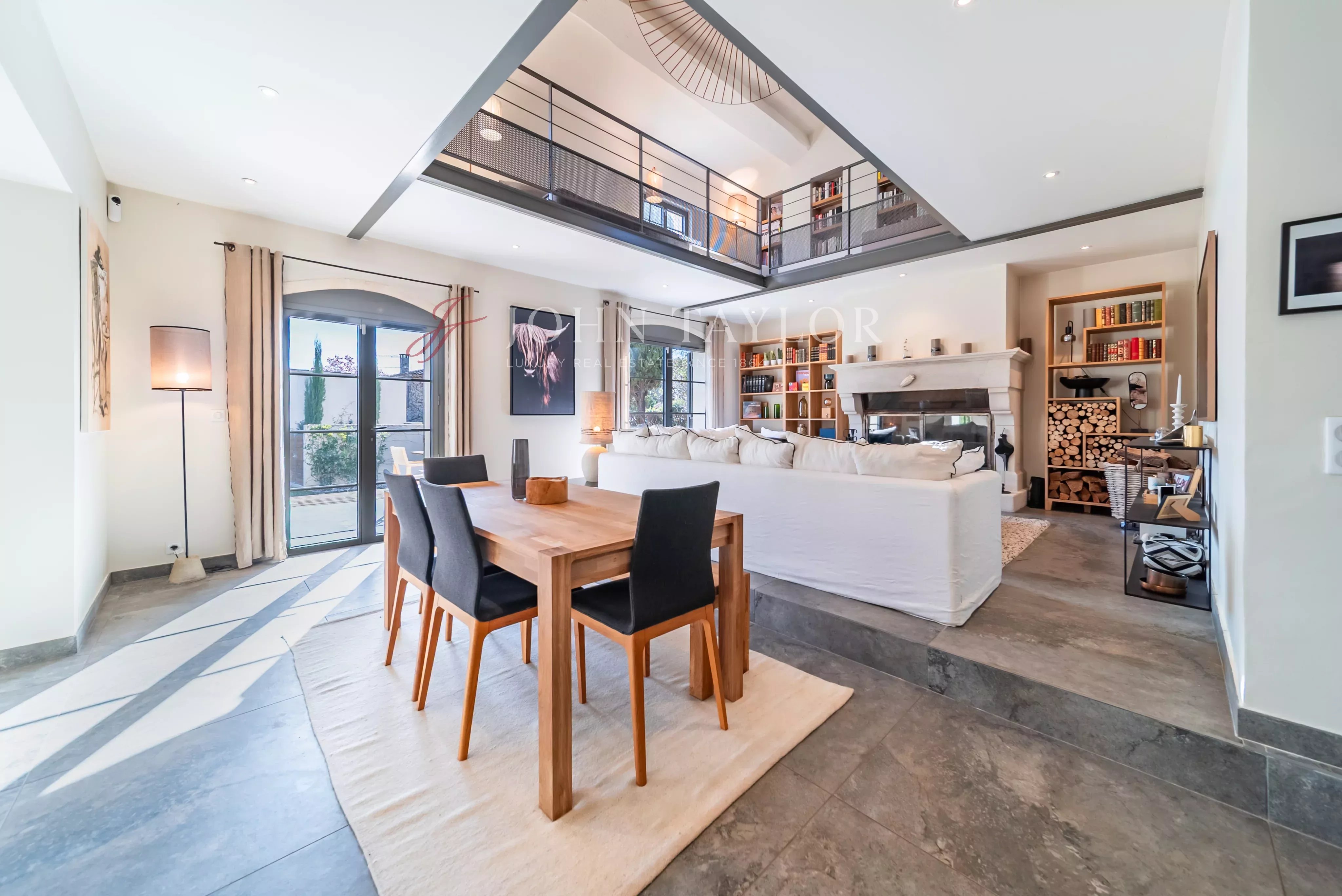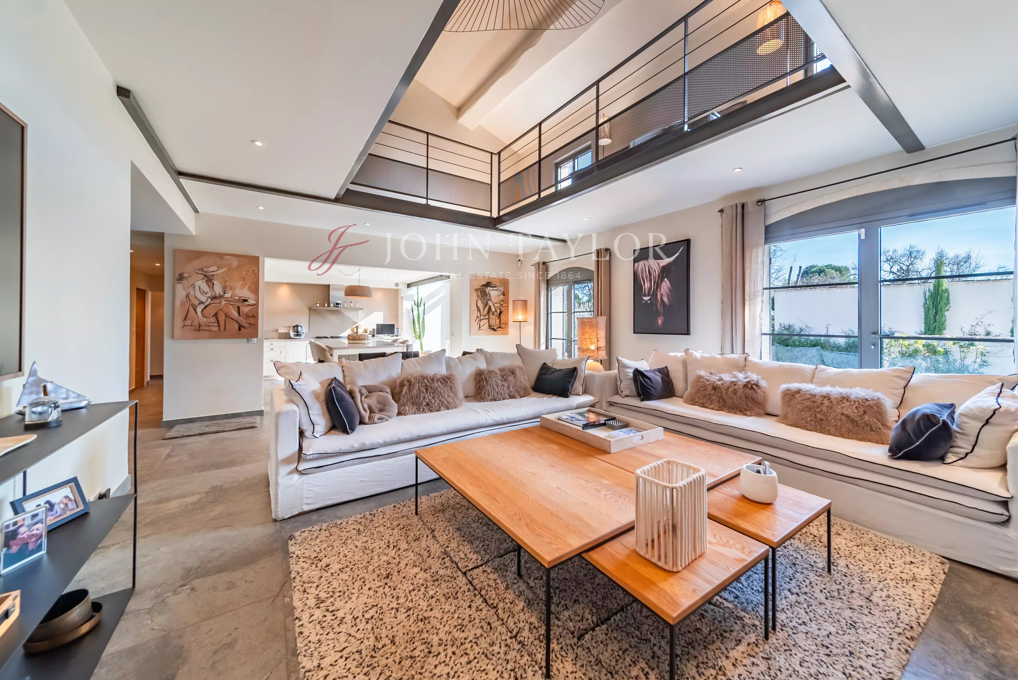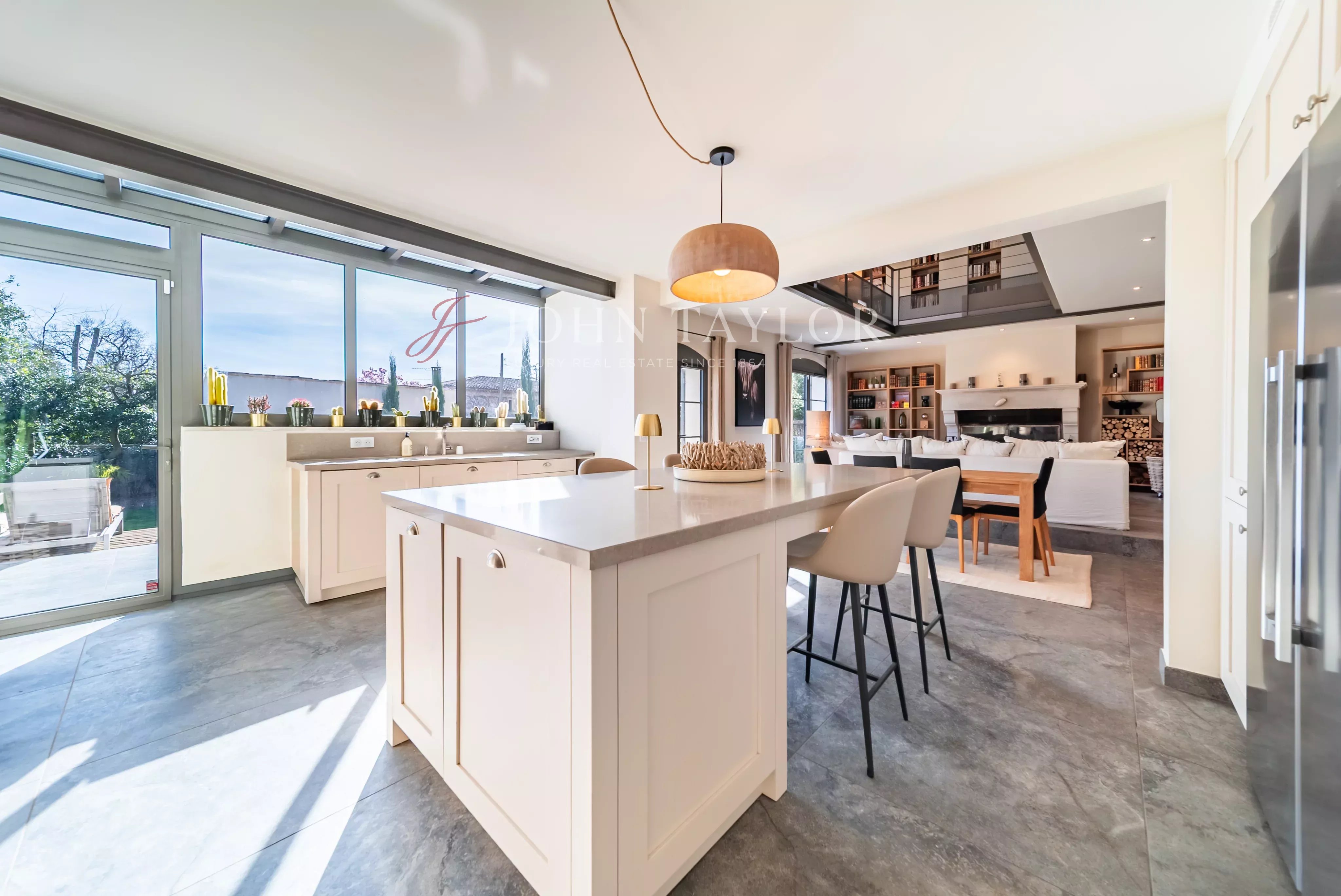 Les pièces de vie séduisent par leurs volumes et leur luminosité : un vaste séjour cathédrale avec cheminée, un salon TV, ainsi qu’une cuisine entièrement équipée haut de gamme, ouverte sur l’espace salle à manger. Les prestations sont complétées par une cave à vin, une salle de sport, une buanderie et un garage.