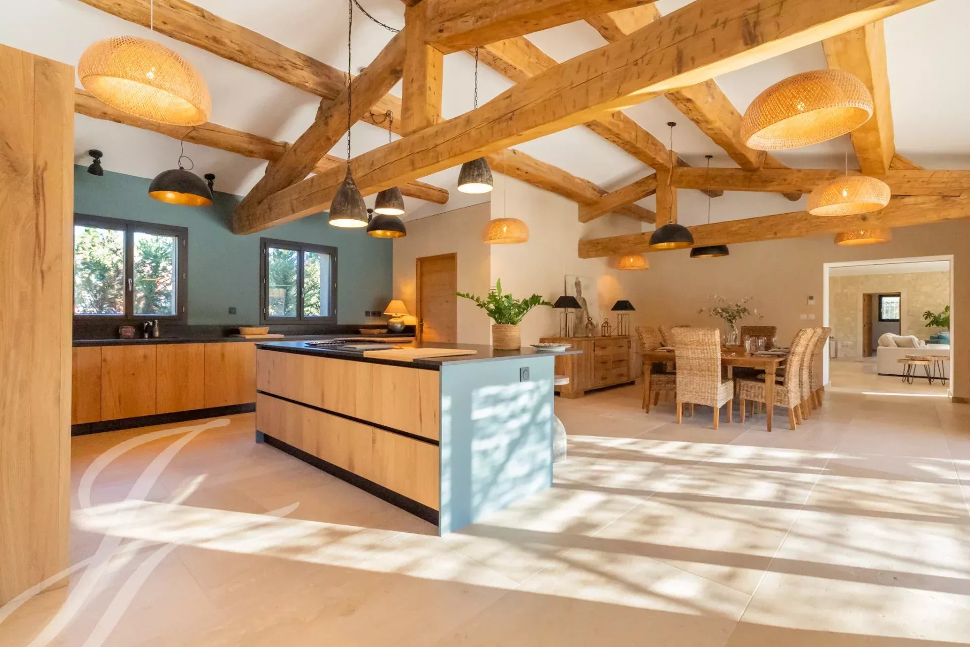 Construite avec le savoir-faire d’artisans locaux, cette demeure familiale développe plus de 308 m² habitables pour 420 m² de bâti. Chaque espace a été pensé pour conjuguer confort et caractère : une spacieuse cuisine ouverte sur la salle à manger avec sa superbe charpente apparente, un vaste séjour baigné de lumière, et six chambres, dont quatre suites.
