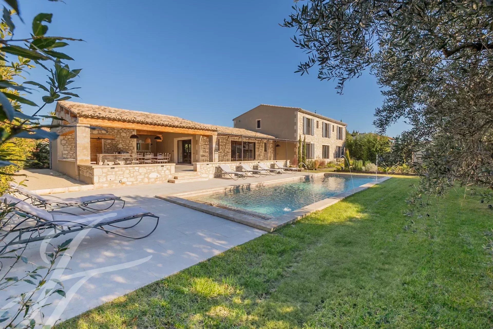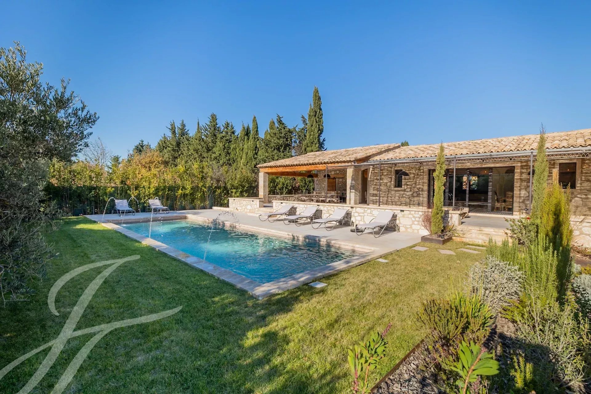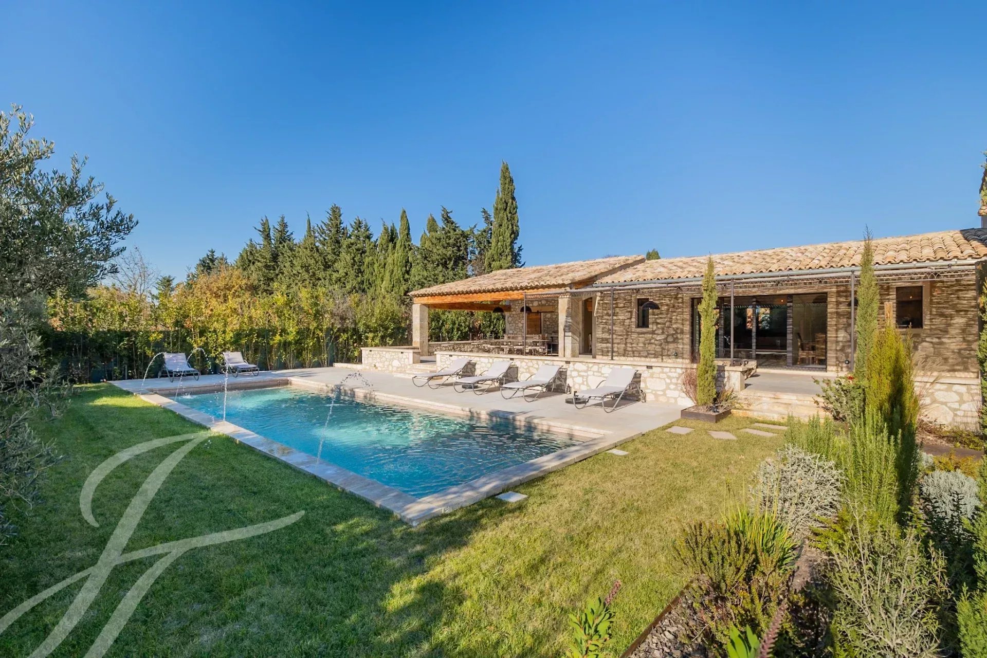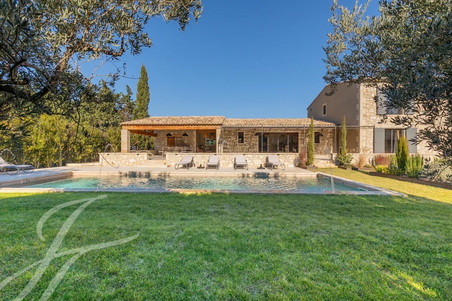 Niché au bout d’un discret chemin, cet authentique mas en pierre apparente séduit par son charme intemporel et son cadre enchanteur. Son jardin paysagé de 1 700 m², soigneusement aménagé, offre un écrin de verdure sublimé par une belle piscine entourée de massifs fleuris et d’une élégante pelouse.