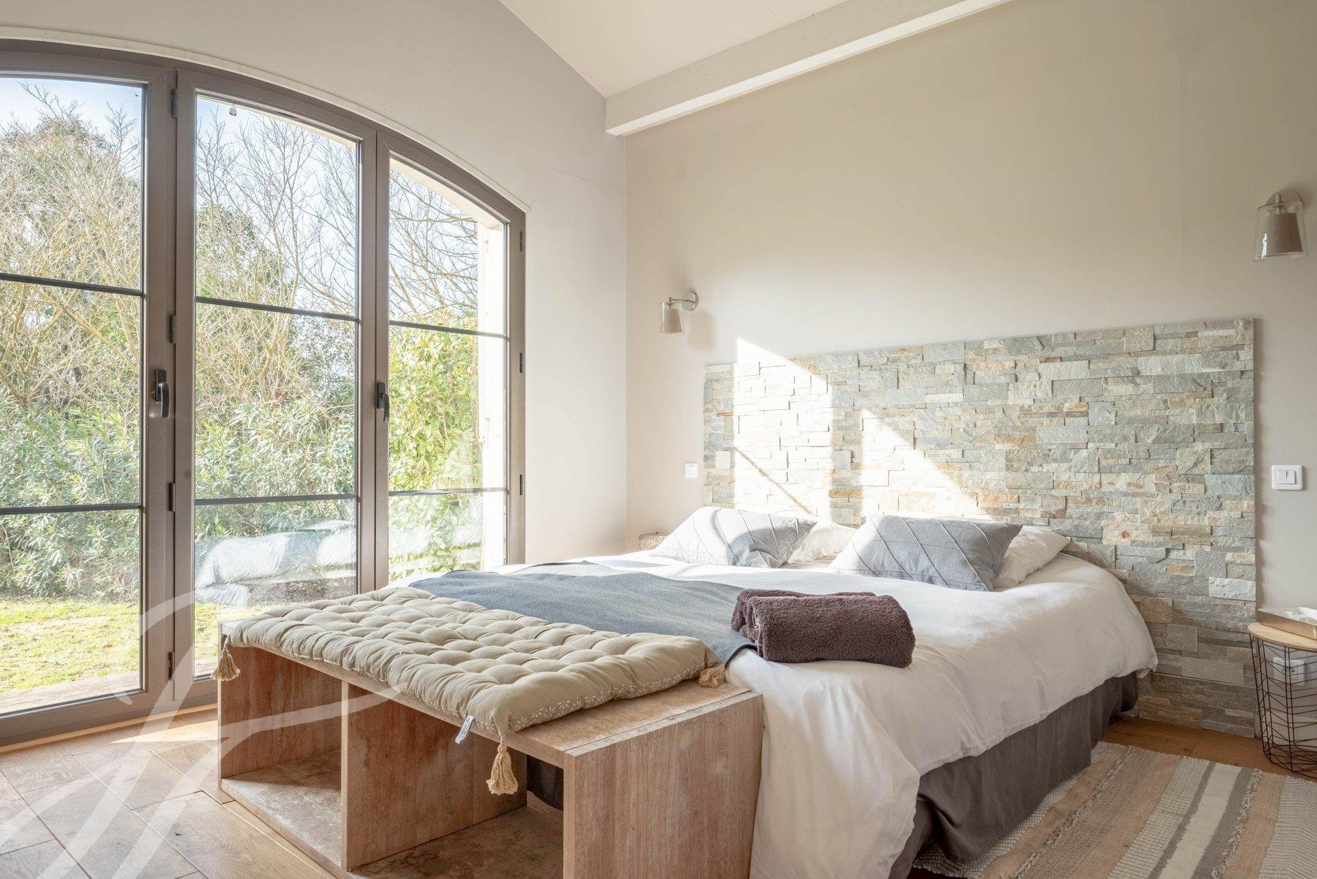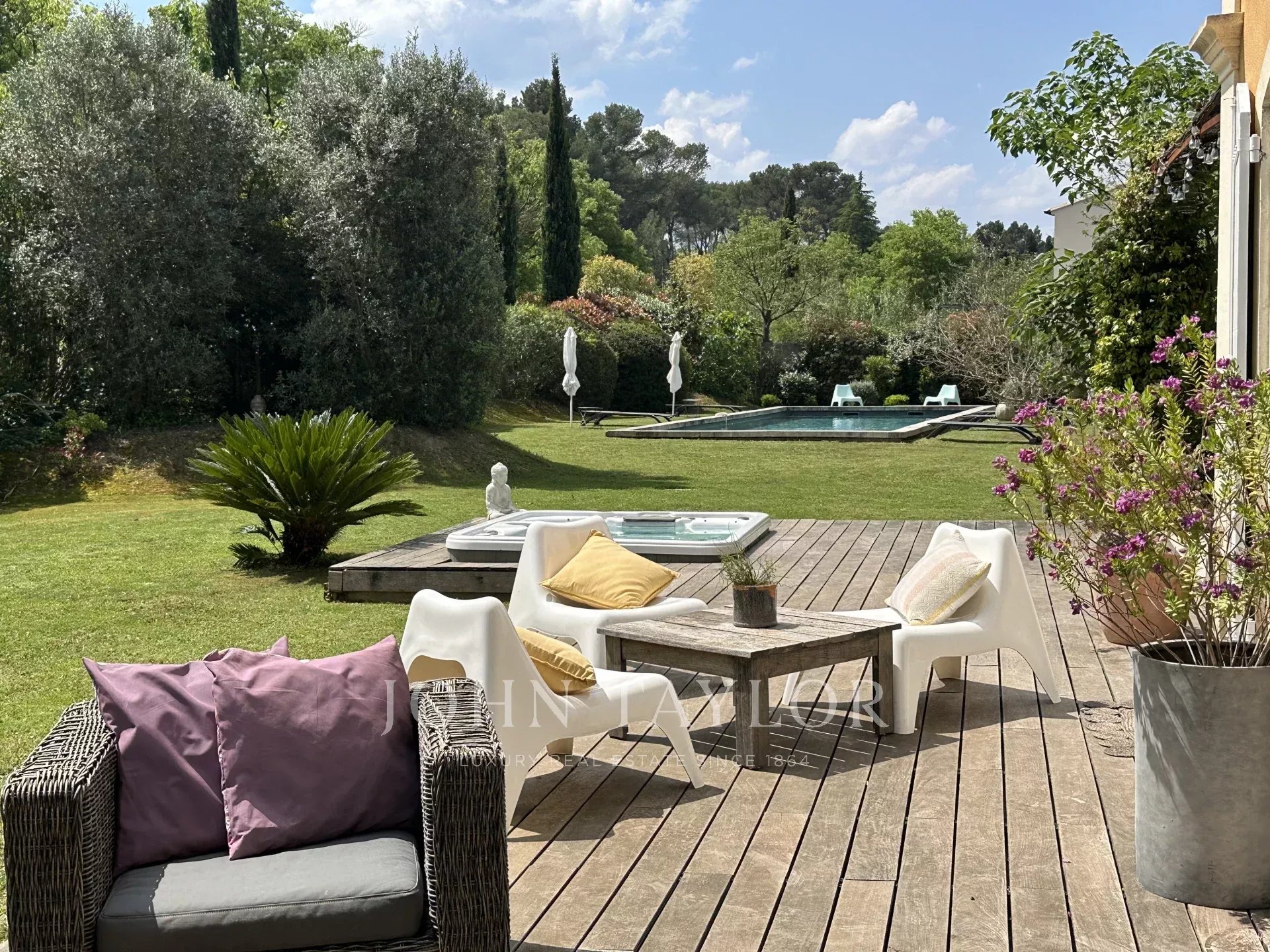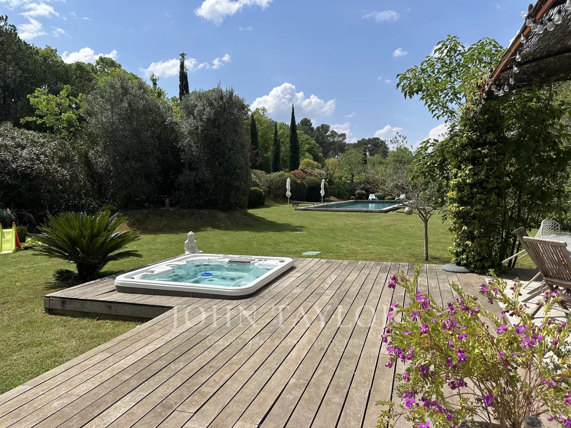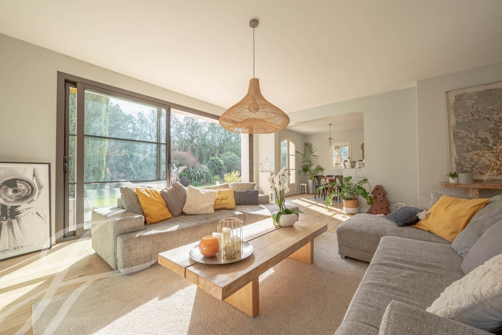 Les espaces extérieurs y sont très agréables de part la grande terrasse, le jardin verdoyant et paysagé agrémenté d'un jacuzzi et d'une piscine au sel de 12x5.