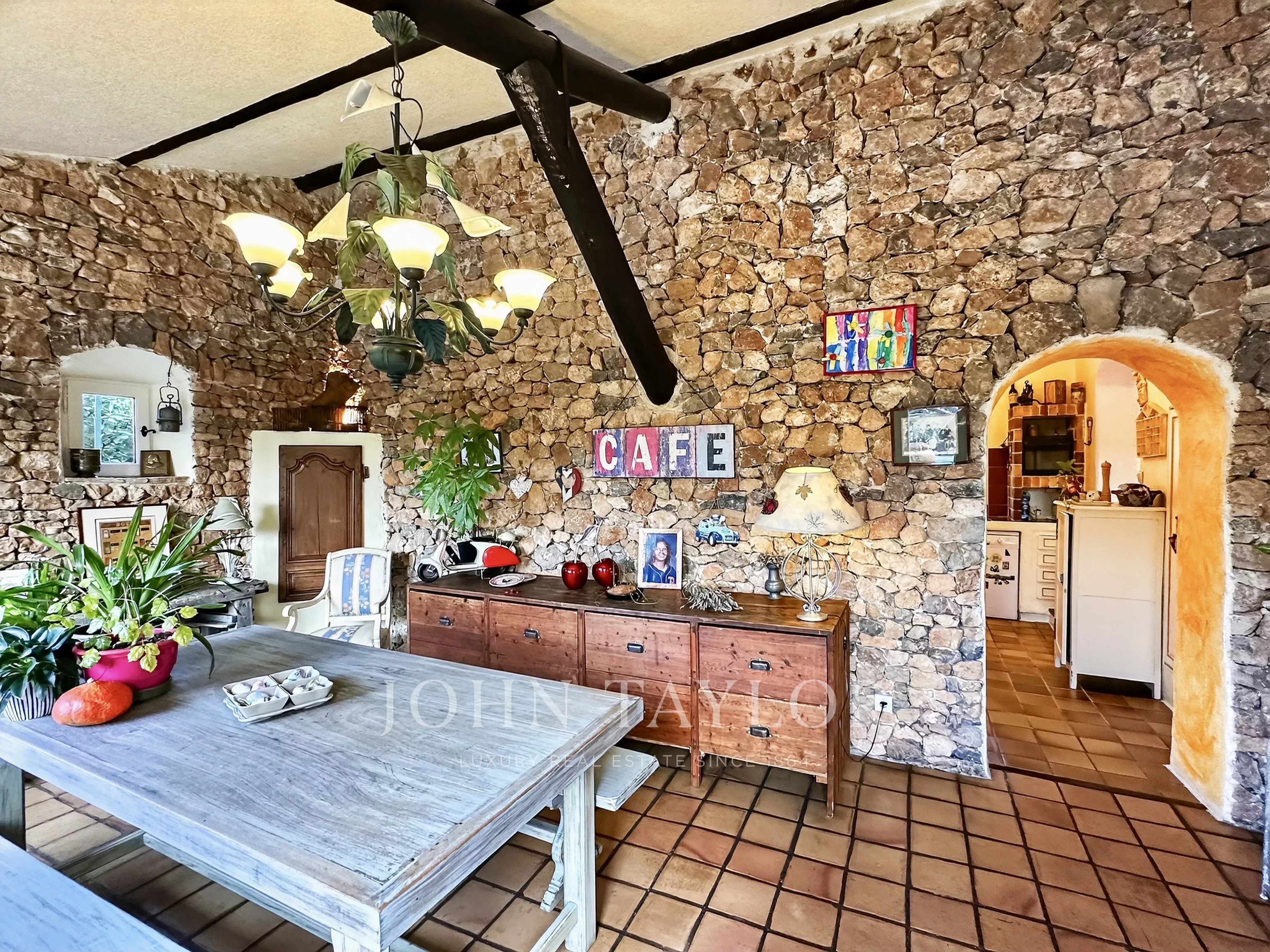 La salle à manger, agrémentée de pierres apparentes, invite naturellement à la convivialité et aux moments de partage. La cuisine de style provençal, fonctionnelle et chaleureuse, est complétée par une arrière-cuisine, offrant un espace de rangement et de préparation appréciable. Un WC invités complète l’espace jour.