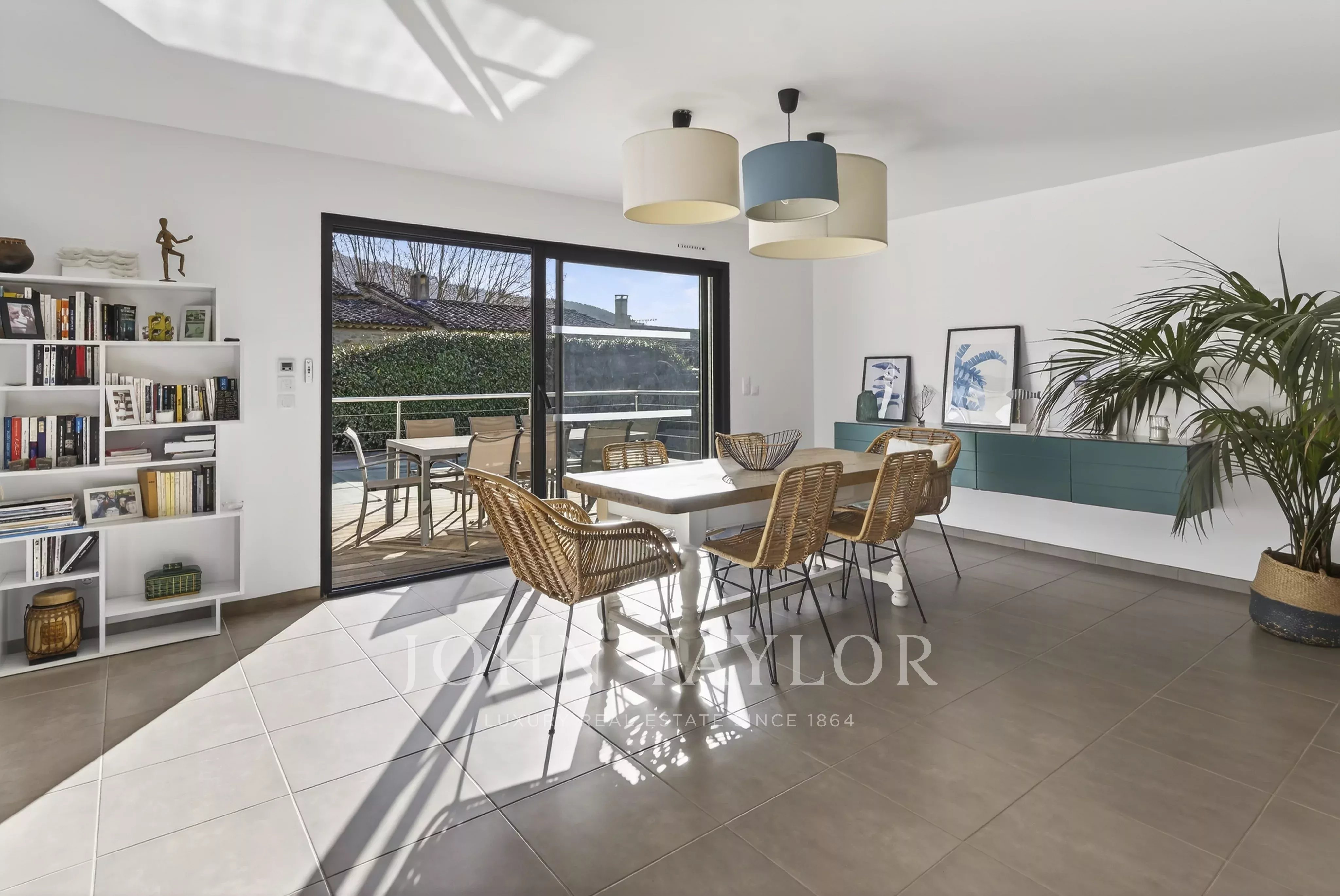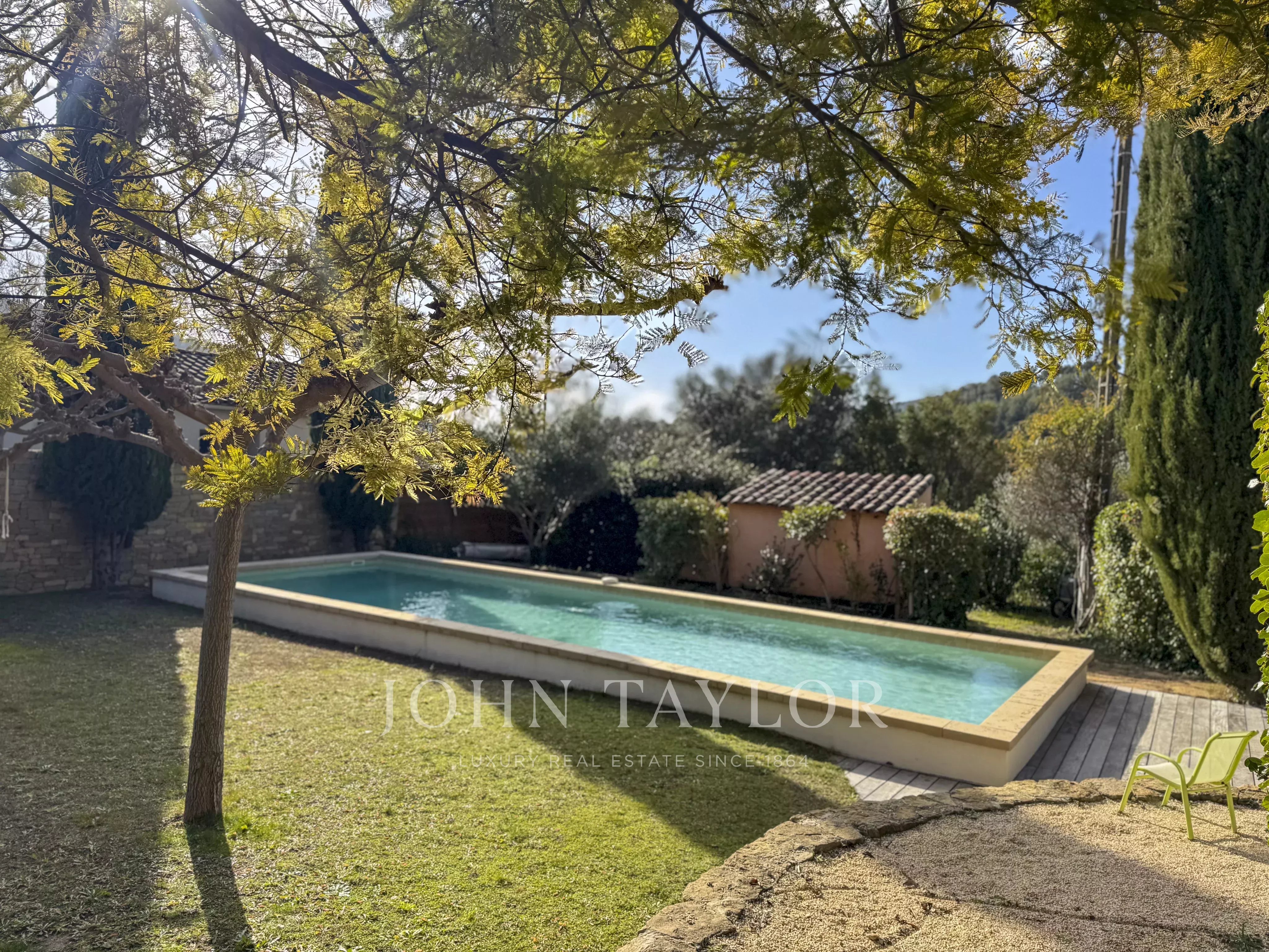 Implantée sur un terrain paysager de 2 400 m², la propriété offre un cadre de vie privilégié. Une piscine chauffée au sel apporte une touche d’élégance et s’intègre harmonieusement à l’environnement. Le Canal de Provence et un puit complètent les atouts rares de cet extérieur, tout comme le double garage avec porte électrique et le terrain de boules qui confère à l’ensemble une ambiance provençale authentique.