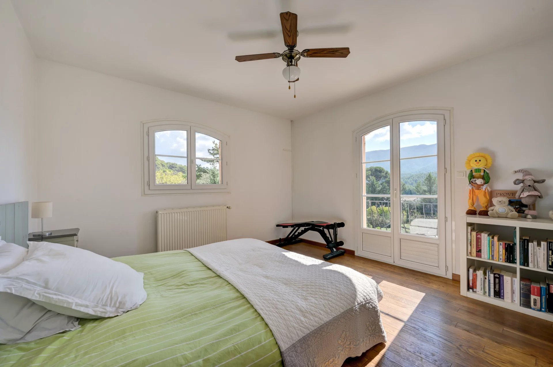 À l’étage, cinq chambres, dont trois avec accès au balcon filant, bénéficient d’une vue imprenable sur la Sainte-Victoire. Une salle d’eau, une salle de bains et des toilettes complètent le tout.