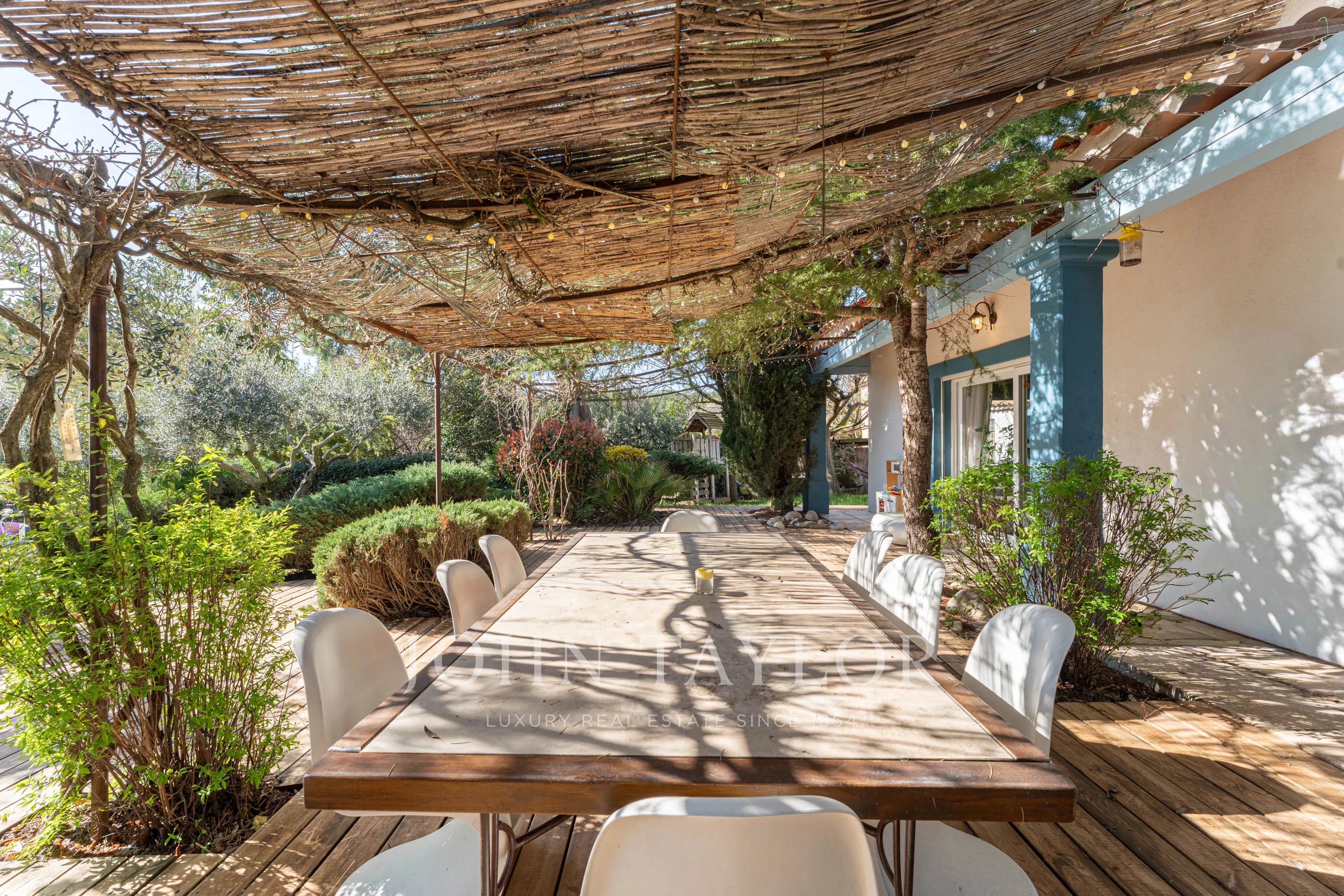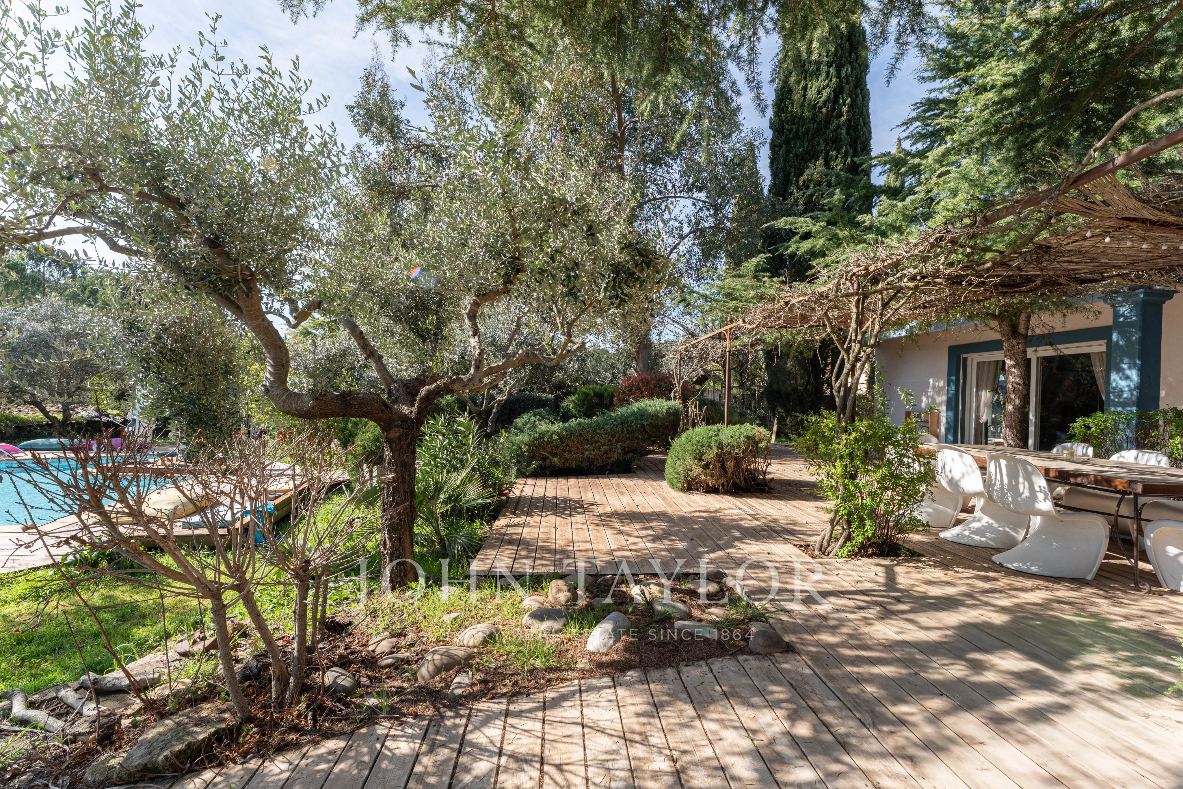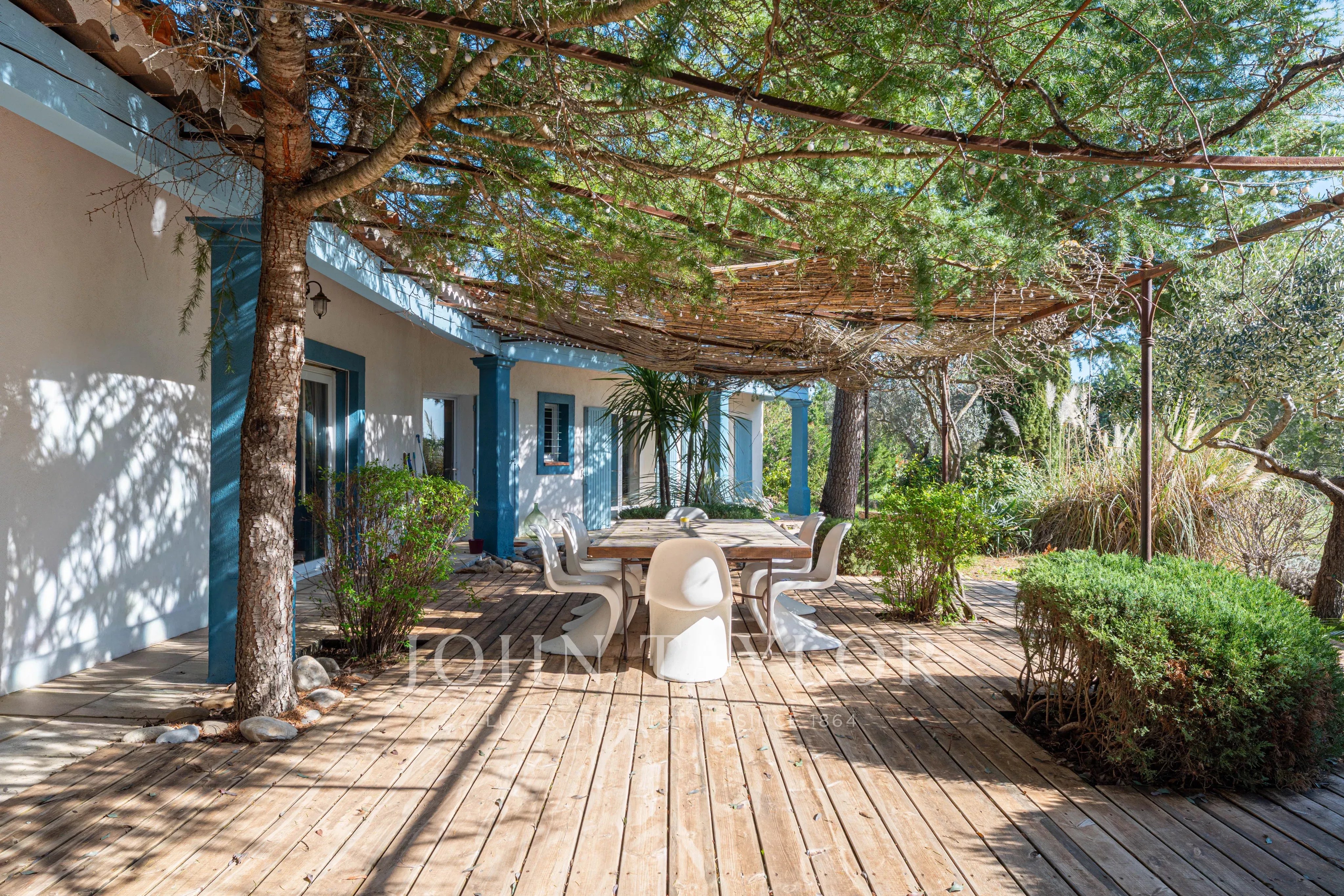 À l’extérieur, le jardin paysager aux accents provençaux — vignes, pelouse, arbres fruitiers — accueille une piscine aux lignes libres, plusieurs espaces de détente et un atelier.