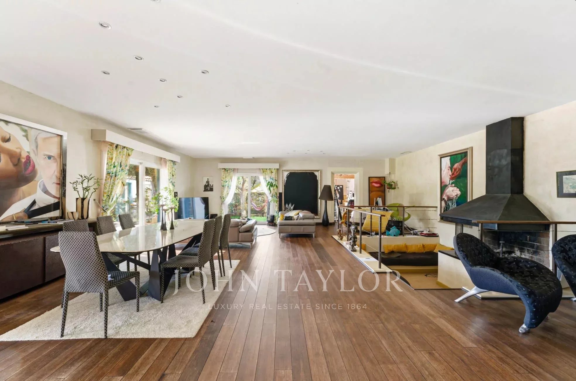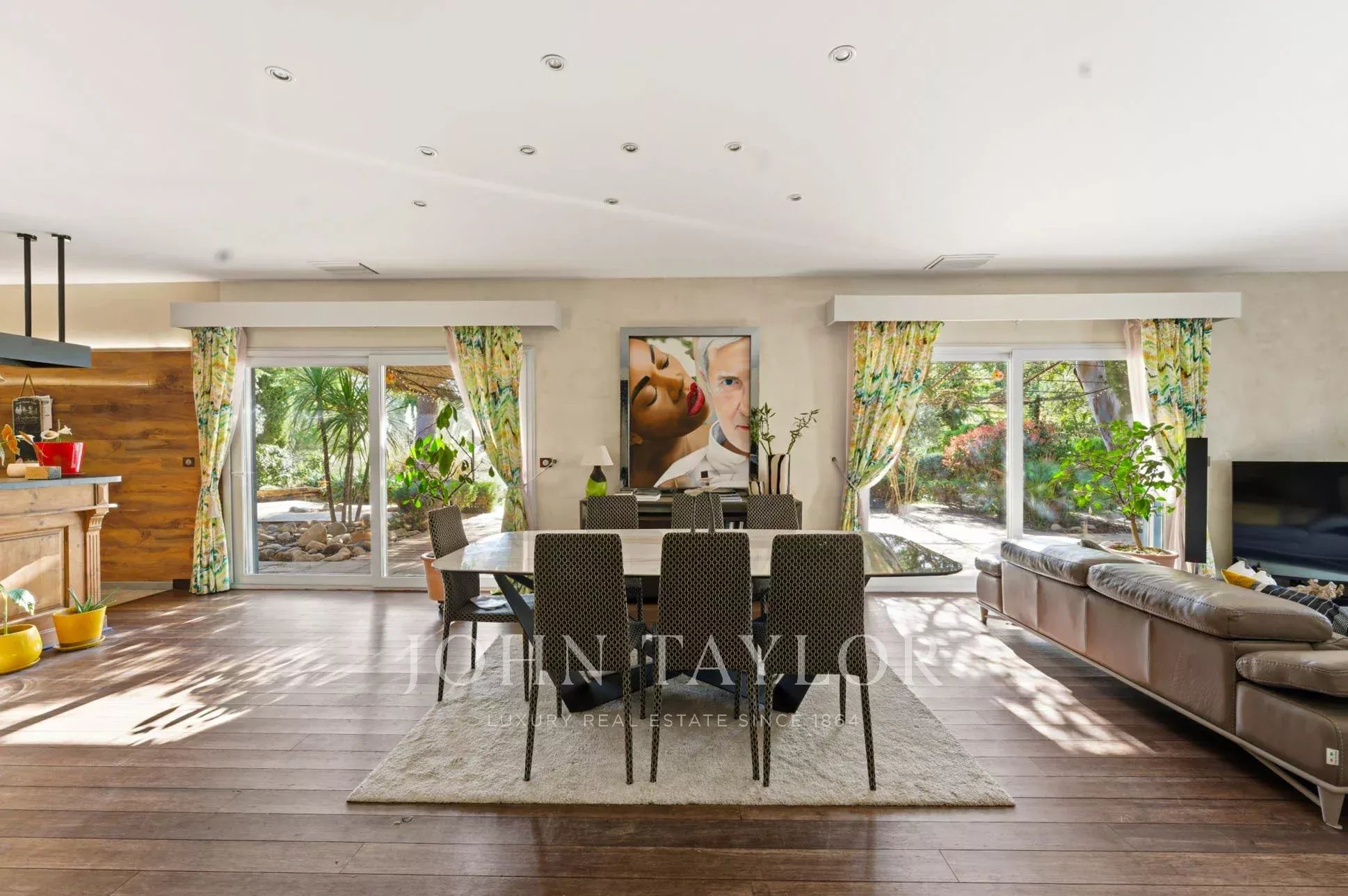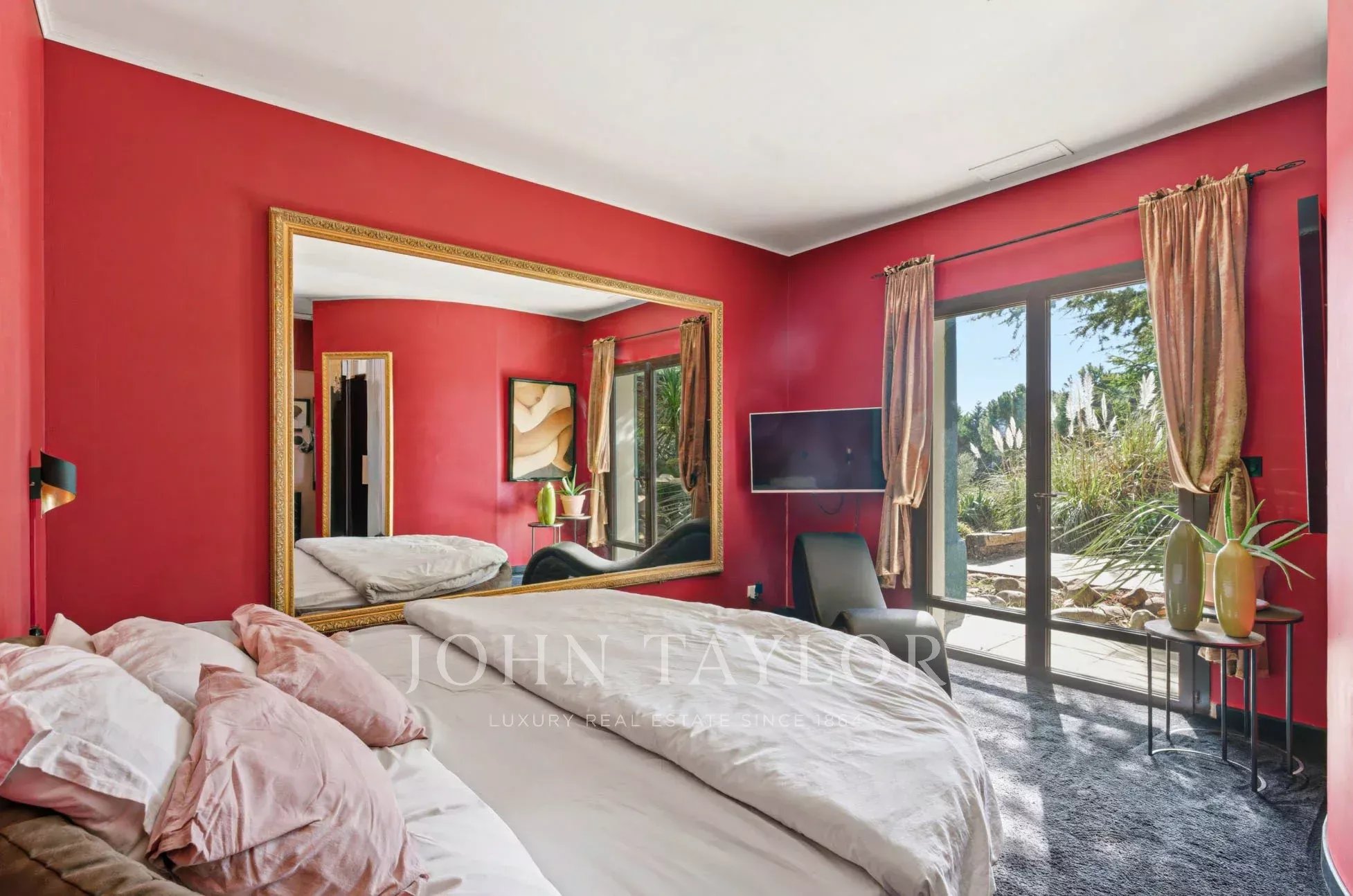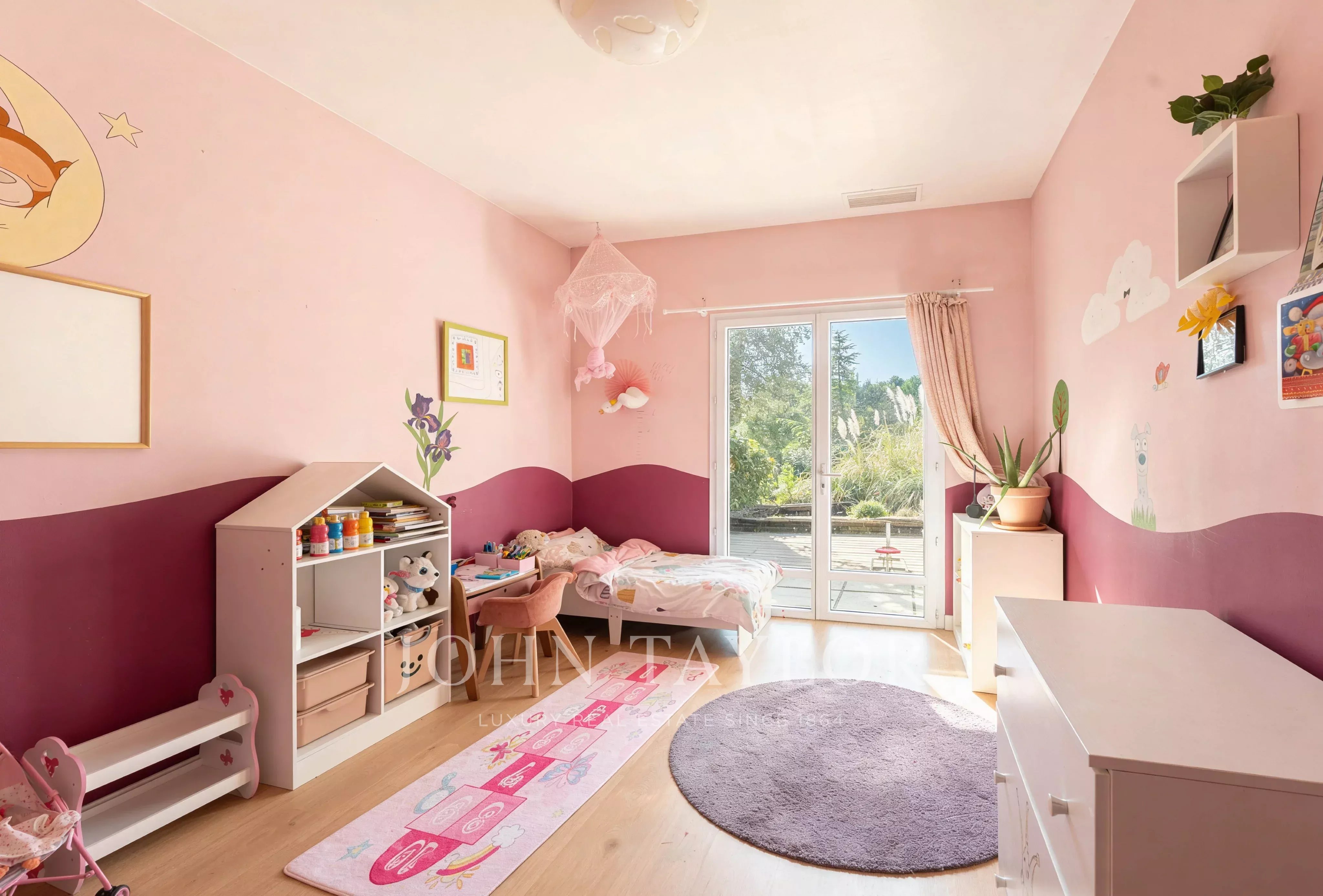 À l’extérieur, le jardin paysager aux accents provençaux — vignes, pelouse, arbres fruitiers — accueille une piscine aux lignes libres, plusieurs espaces de détente et un atelier.